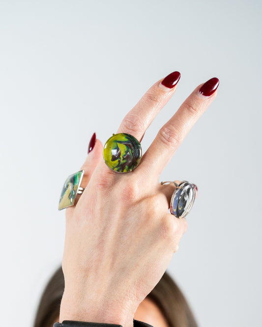 Each ring is a one-of-a-kind piece, showcasing intricate design and vivid colors framed in glass. Perfect for those who appreciate uniqueness and refined craftsmanship.