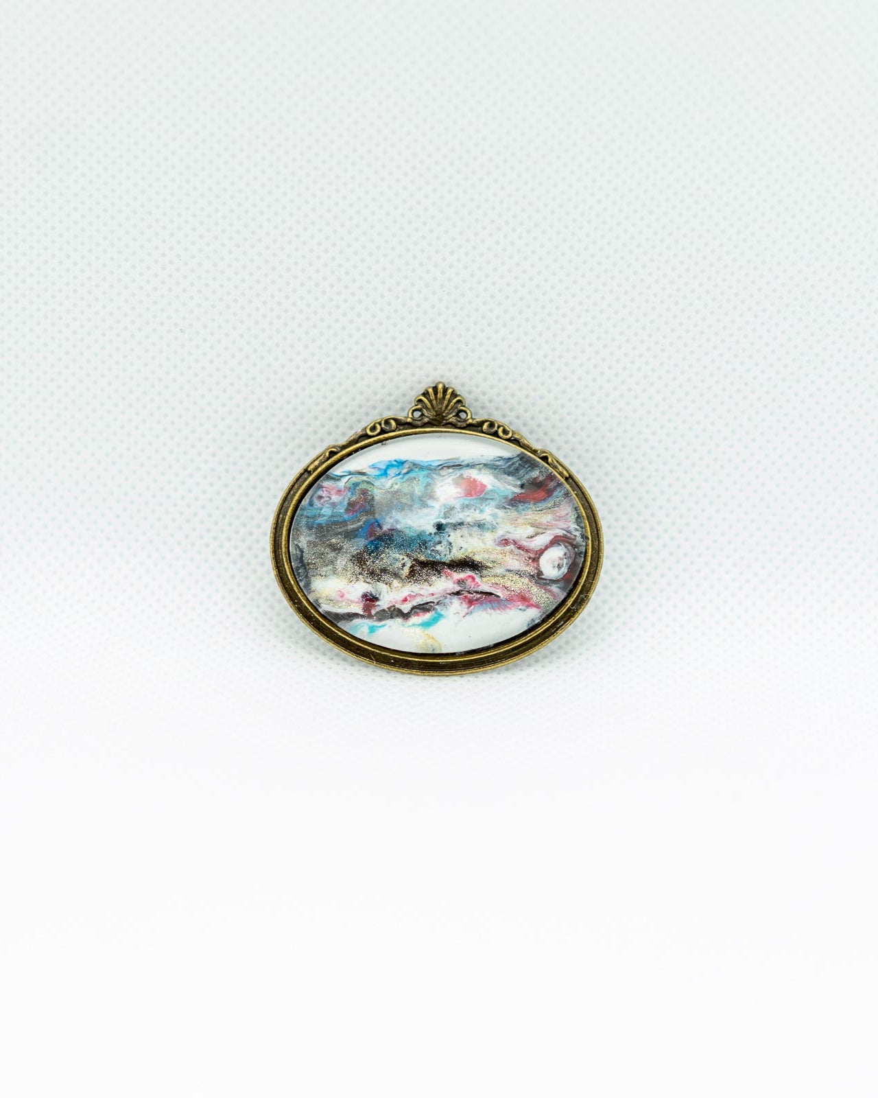 Pakelkite savo stilių į aukštesnį lygį su ATURI – antikinio stiliaus ovalia sage, pasižyminčia kerinčiu abstrakčiu dizainu švelniai mėlynos, rožinės ir metalinių atspalvių. Puošnus bronzinio atspalvio rėmelis suteikia vintažinio elegancijos prisilietimą. Idealiai tinka norint meniškai pagražinti palaidines, paltus ar rankines.