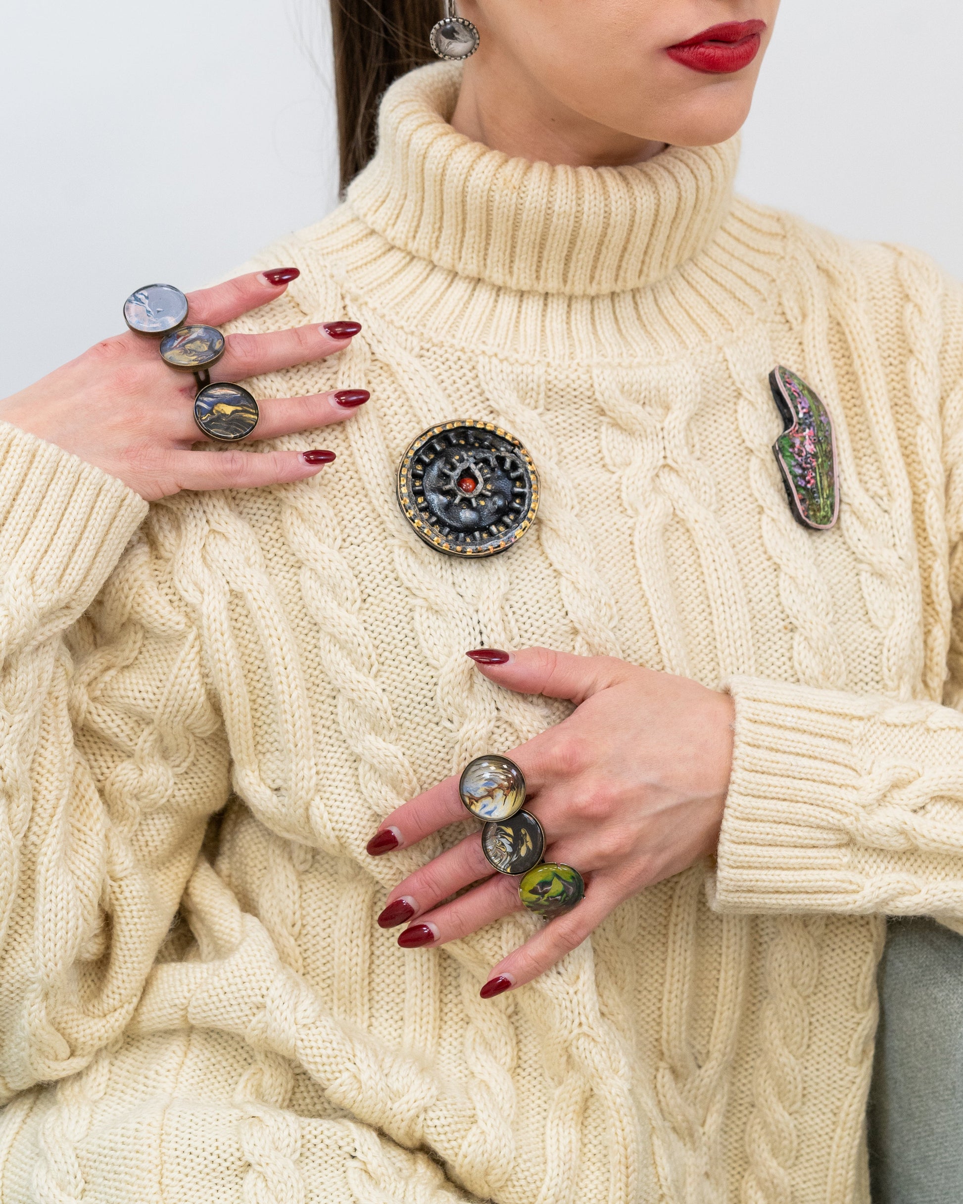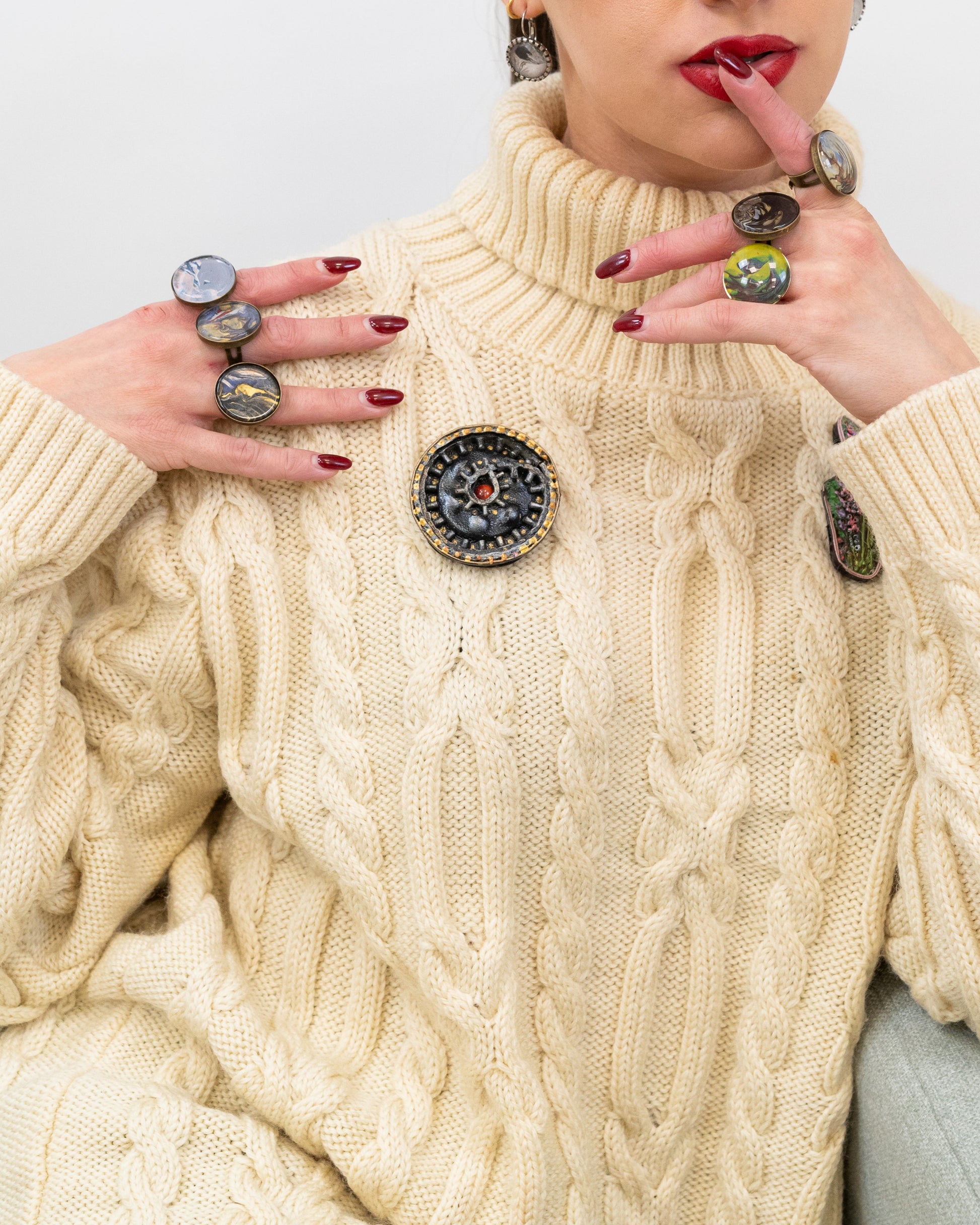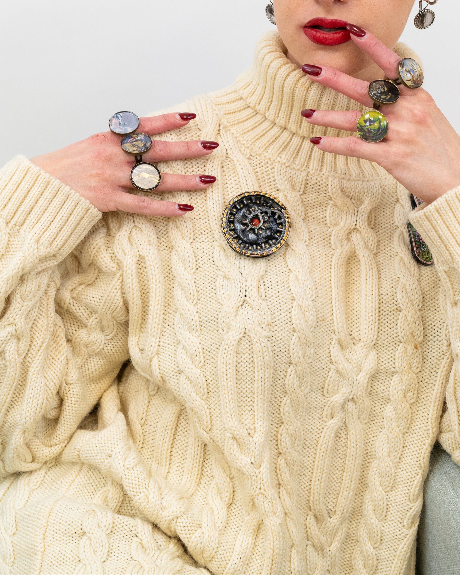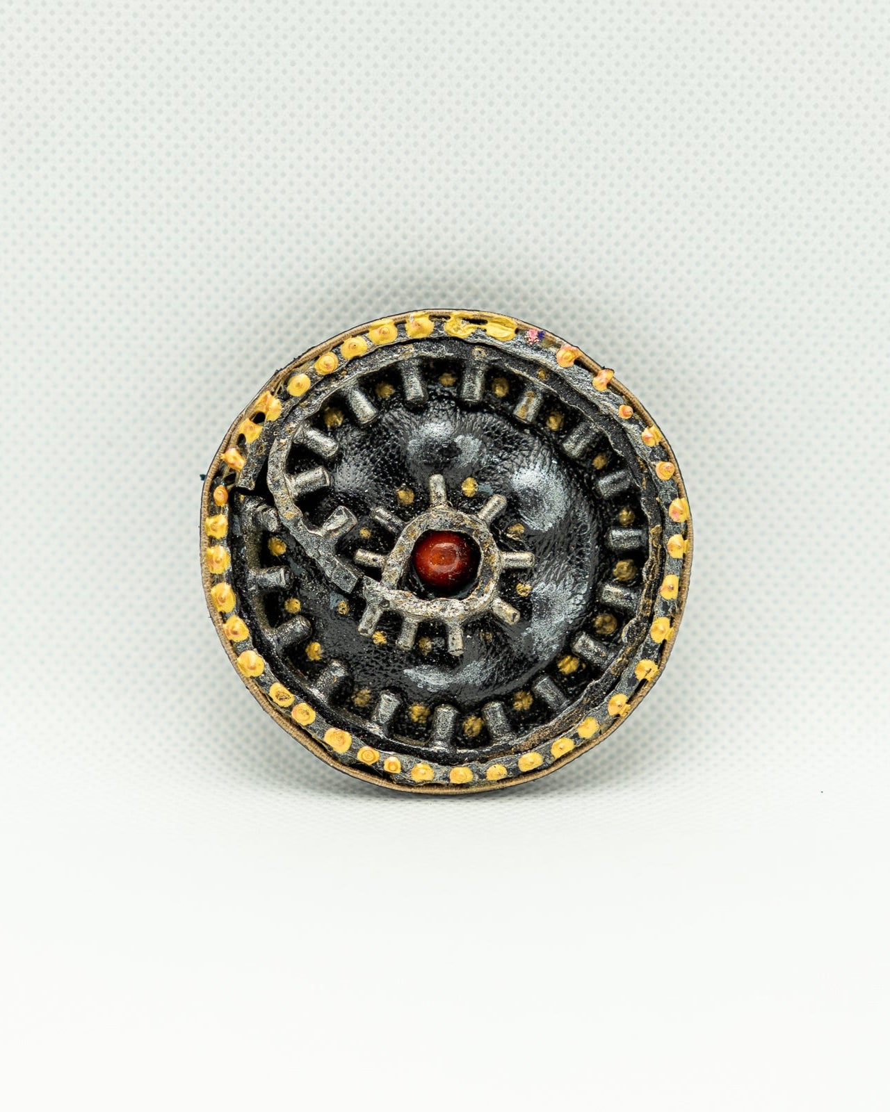 Išreikškite savo išvaizdą su šia rankų darbo apvalia BLONI sage, kurios juodos, auksinės ir raudonos spalvos industrinio stiliaus krumpliaračių motyvas puoštas gamybiniu stiliumi. Sudėtingos metalinės detalės ir tekstūruota apdaila suteikia jai stimpanko stiliaus prieskonių. Puikiai tinka norint suteikti unikalų akcentą striukėms, kepurėms ar rankinėms.