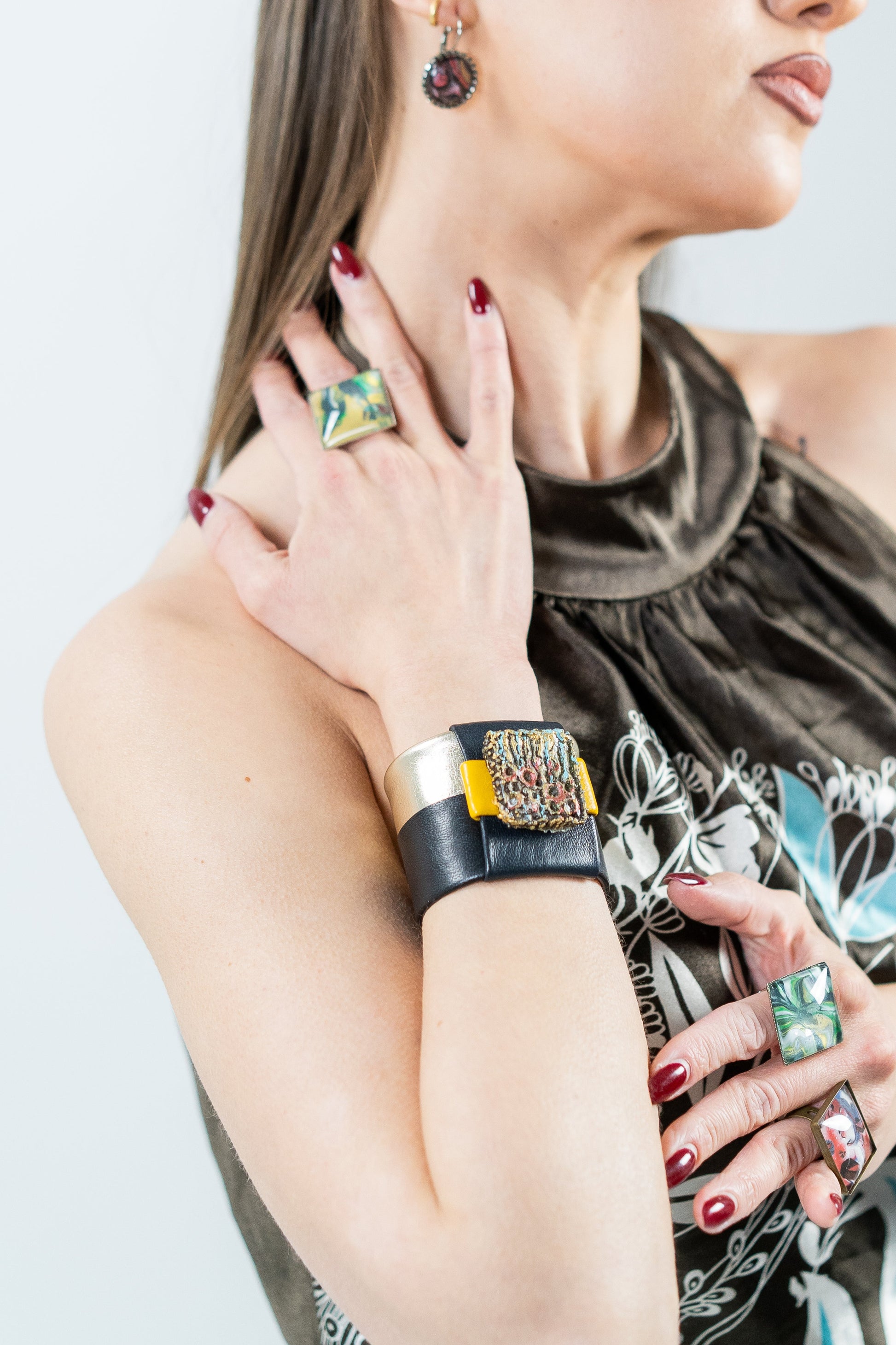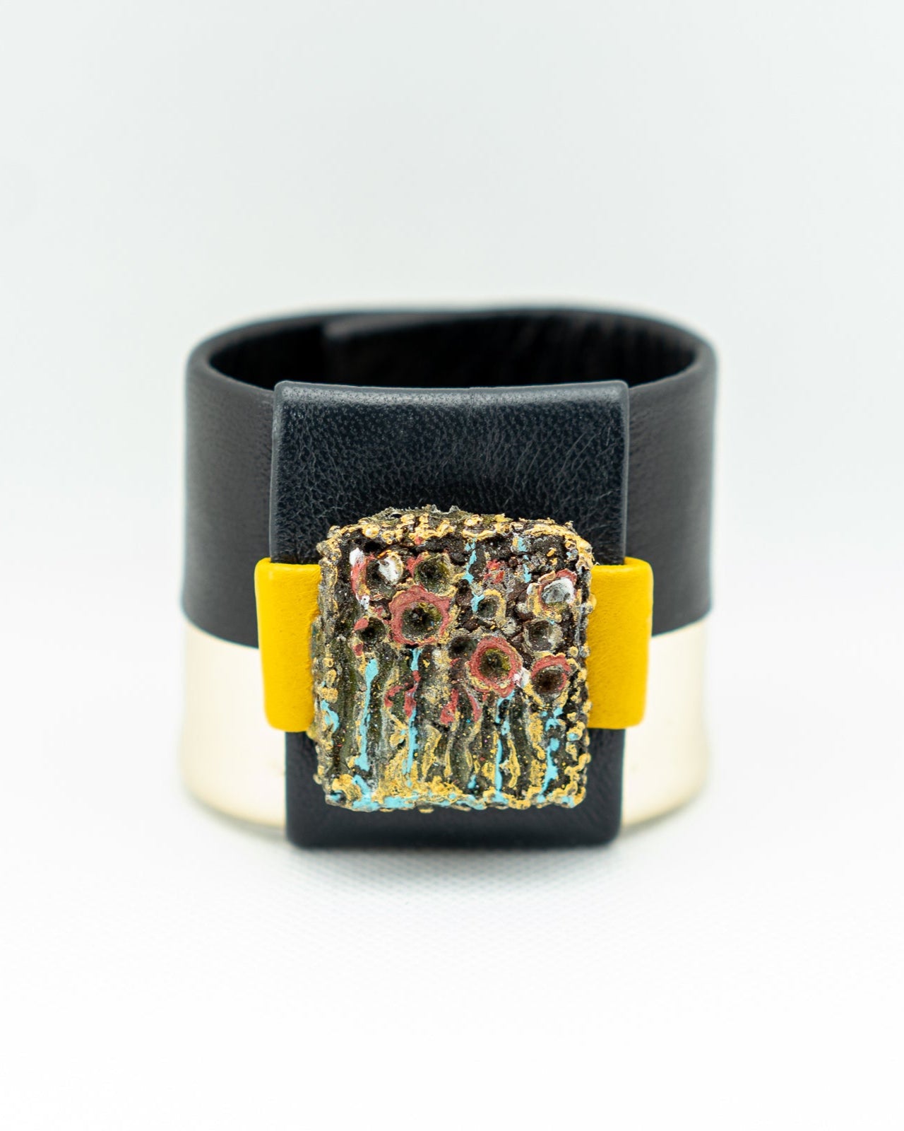 DAMNE puošia gražus juodų ir ryškių atspalvių gėlių paveikslas, paryškintas ryškiais geltonais tonais. Pagamintas iš aukštos kokybės odos, jis suteikia elegancijos bet kokiai aprangai. Puikus aksesuaras ieškantiems unikalaus ir rafinuoto įvaizdžio.