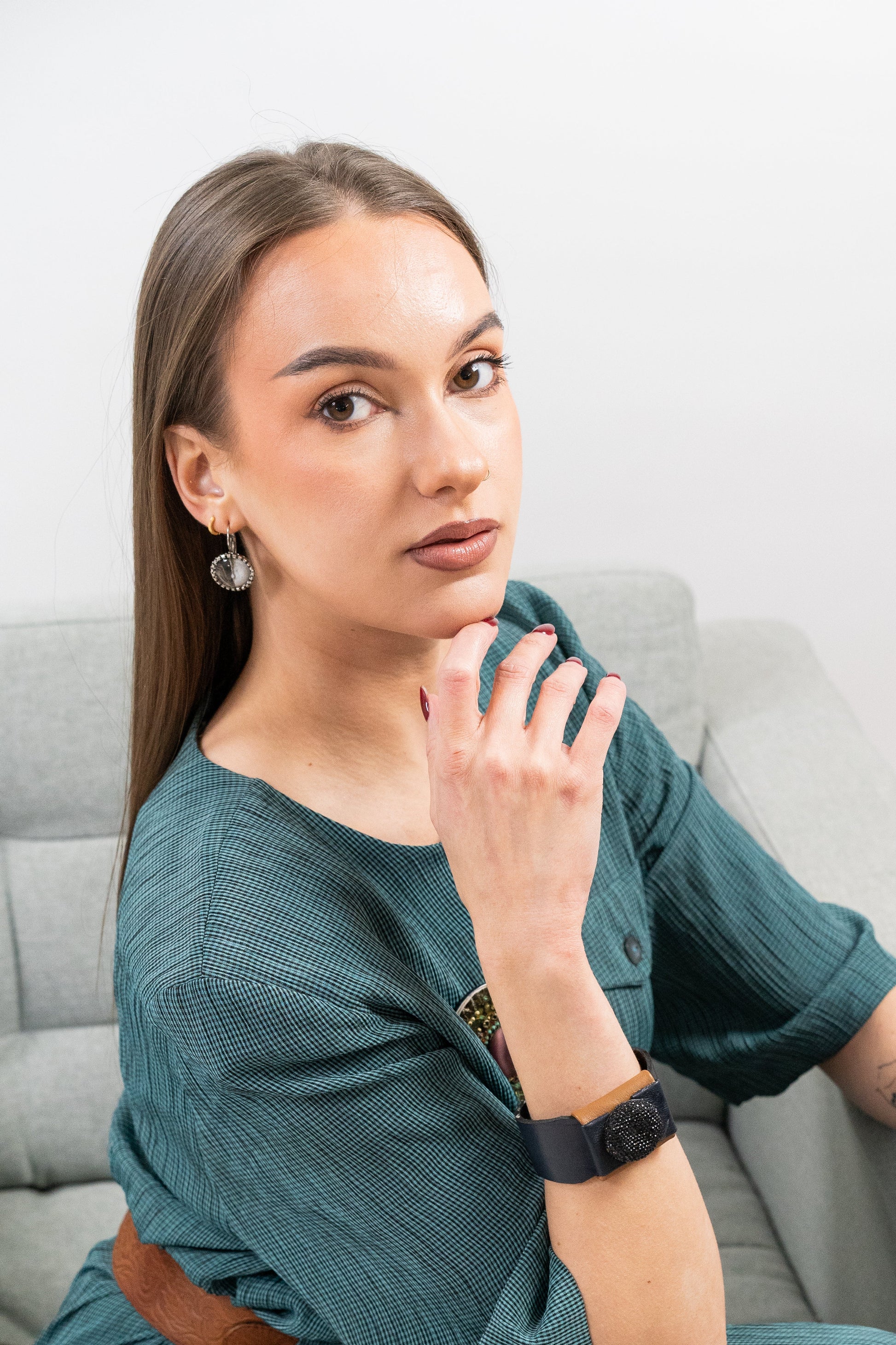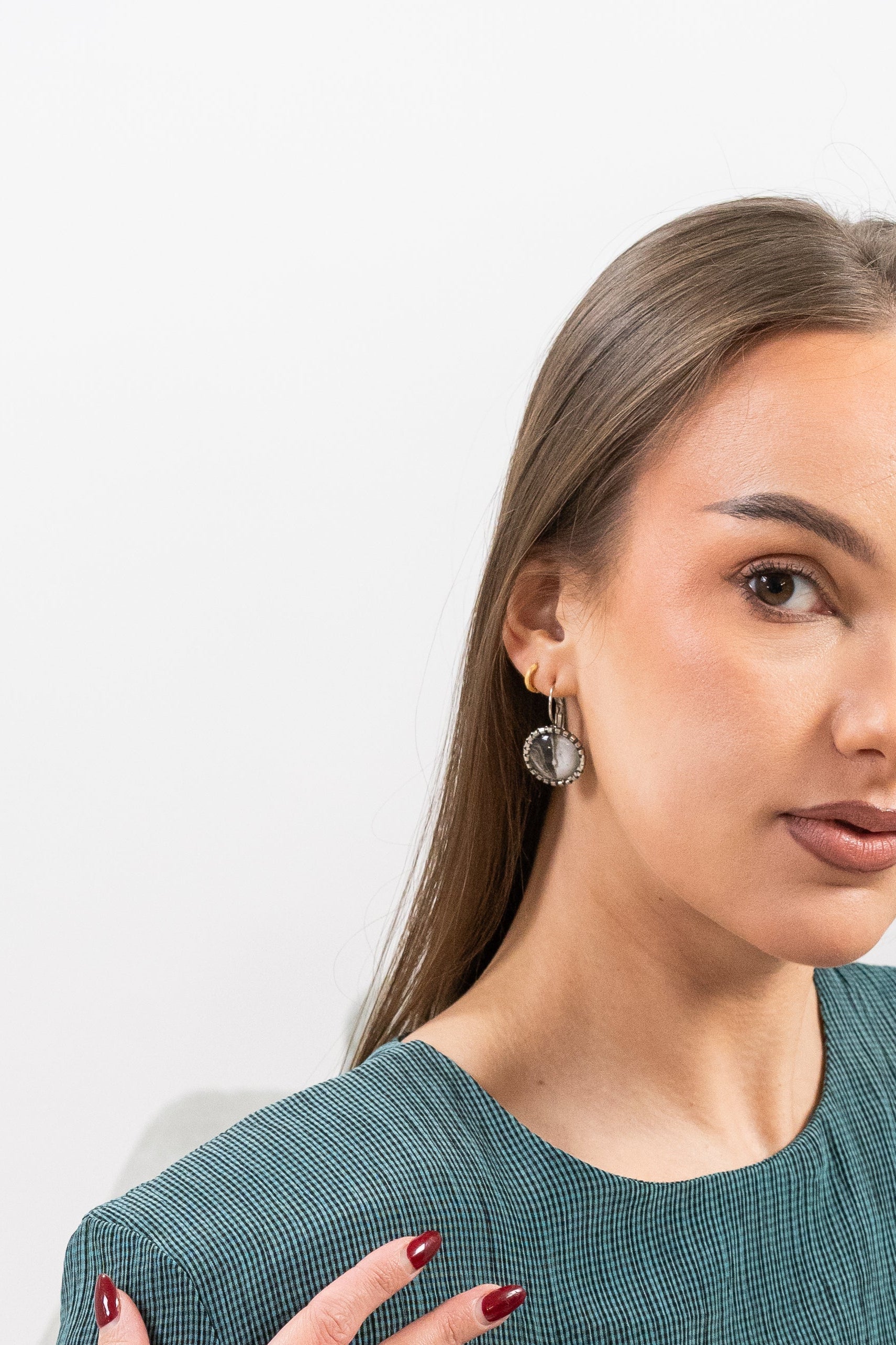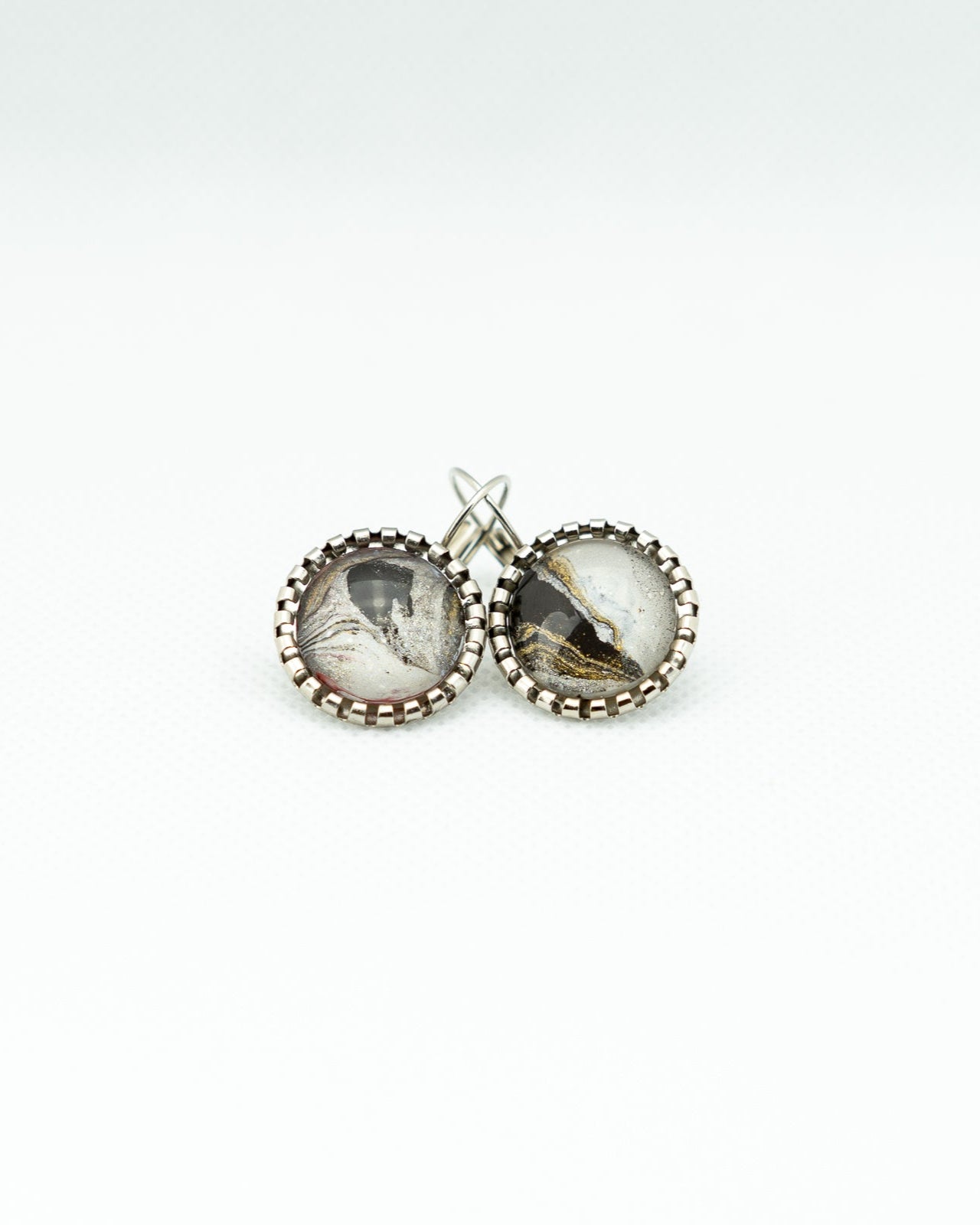 MISTA – meistriškai pagaminti metaliniai auskarai su unikaliu menišku akcentu! Kiekvieną porą puošia unikalus abstraktus paveikslas, įrėmintas po stiklu – stulbinantis, akį traukiantis aksesuaras. Pakelkite bet kokį įvaizdį į aukštesnį lygį su šiais išskirtiniais auskarais.