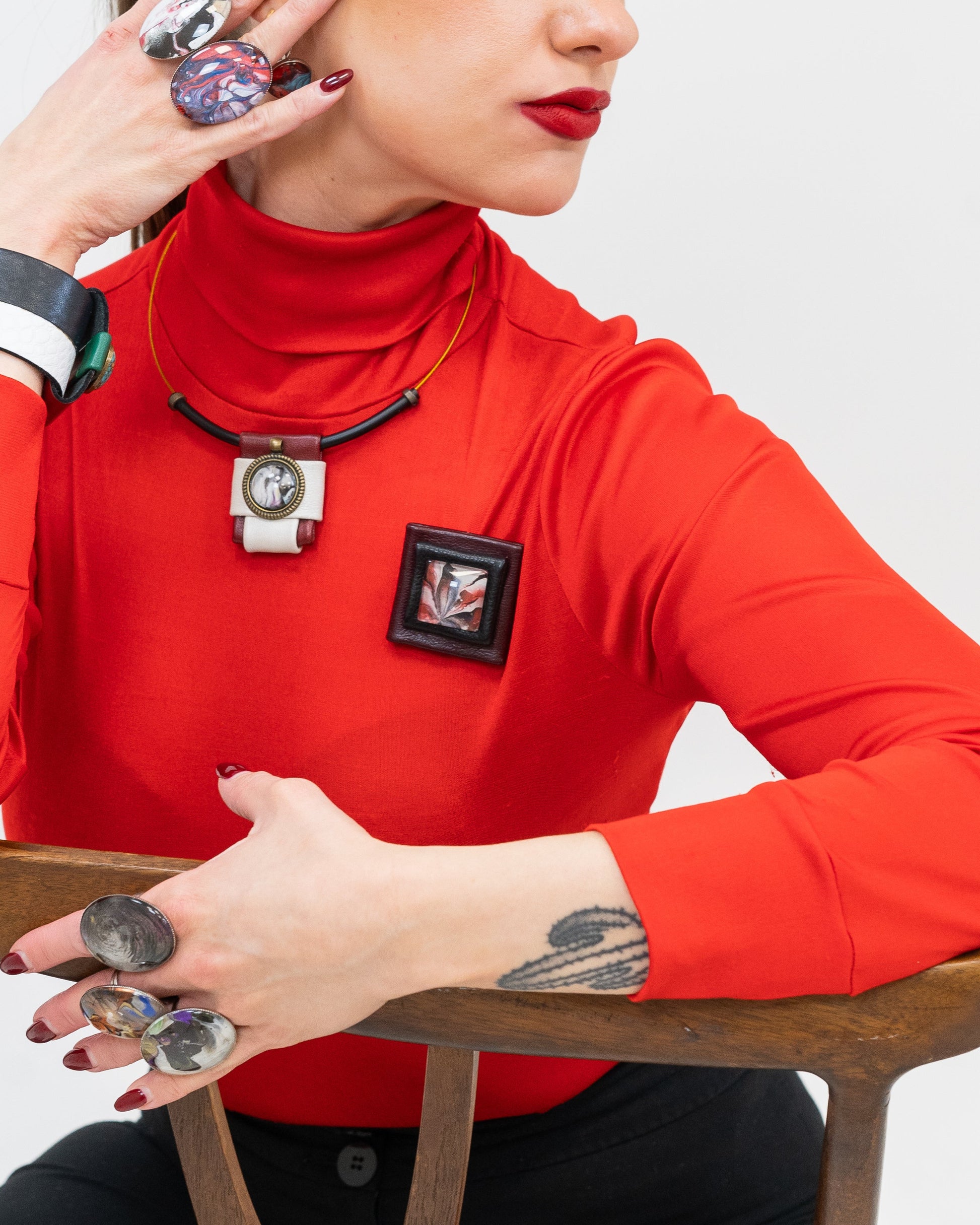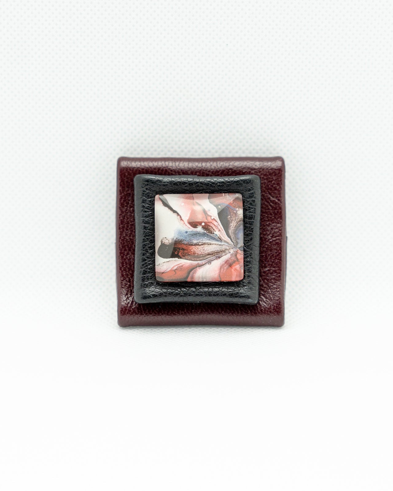NOKTI – kvadratinė sagė su sluoksniuotomis odos detalėmis tamsiai bordo ir juodos spalvos, su marmuriniu centriniu elementu baltos, rožinės ir juodos spalvos atspalviais. Sūkurinis raštas centre suteikia judėjimo ir sklandumo pojūtį, sukurdamas ryškų kontrastą su struktūrizuotu geometriniu rėmeliu.
