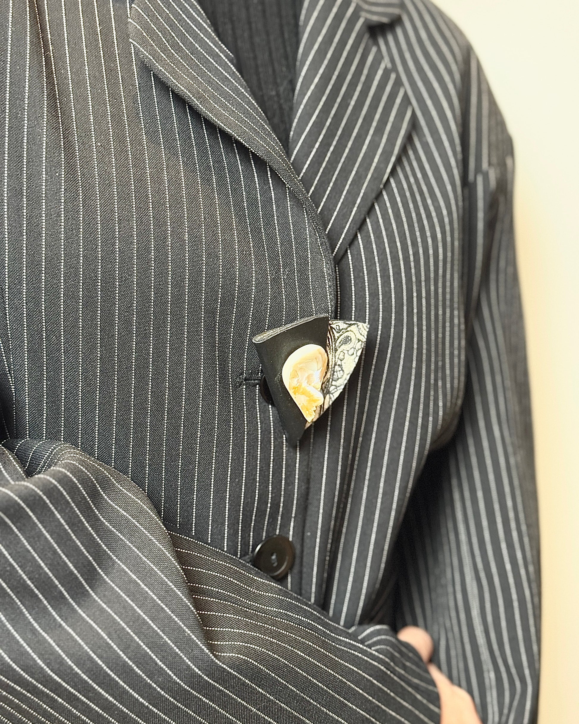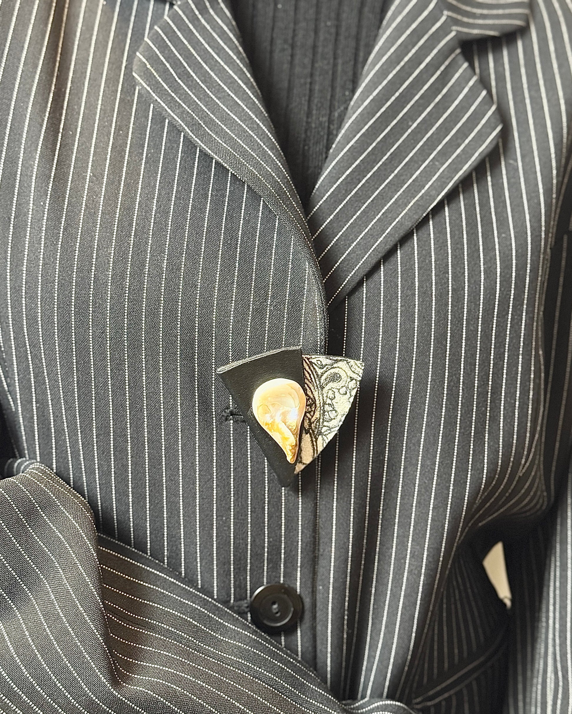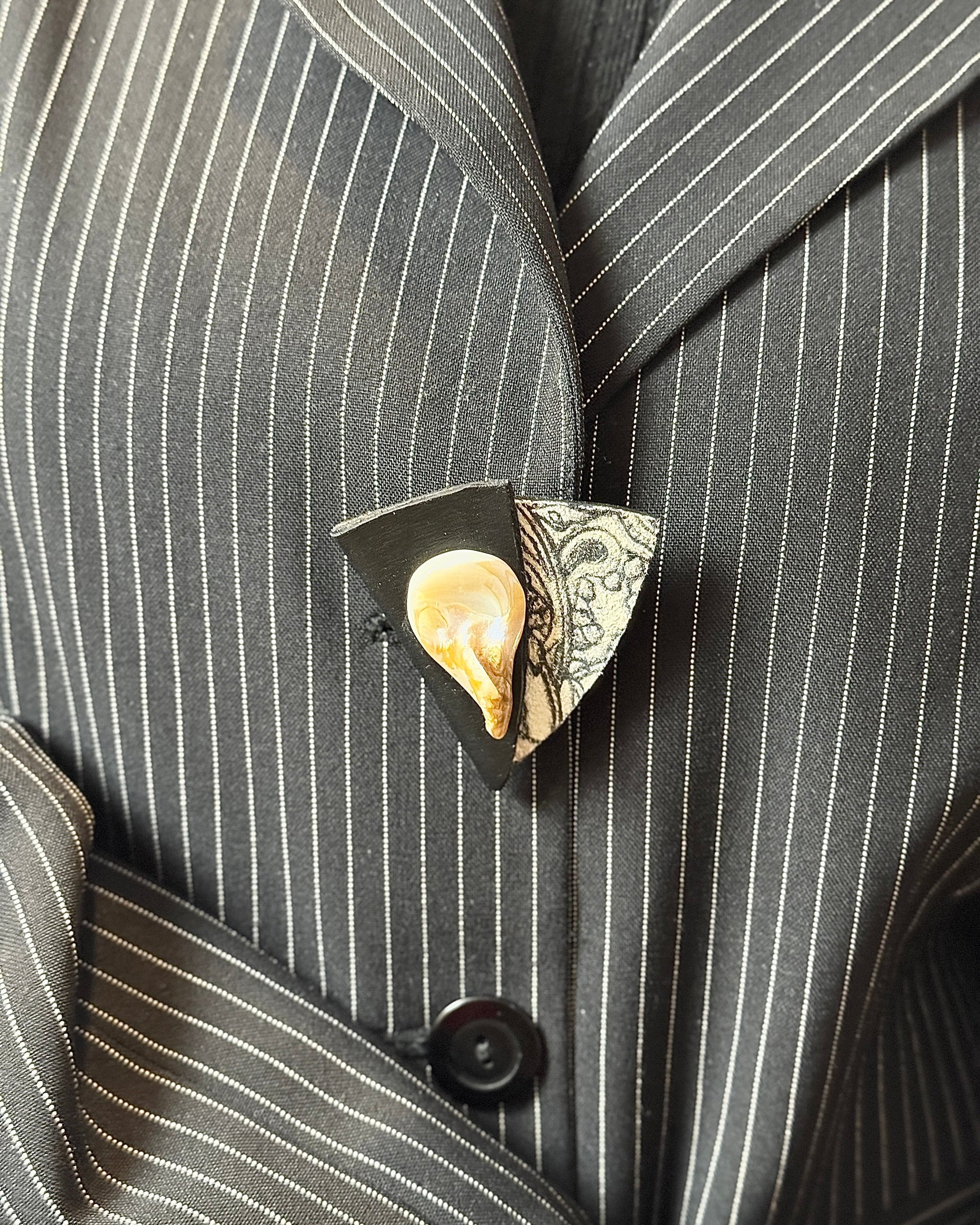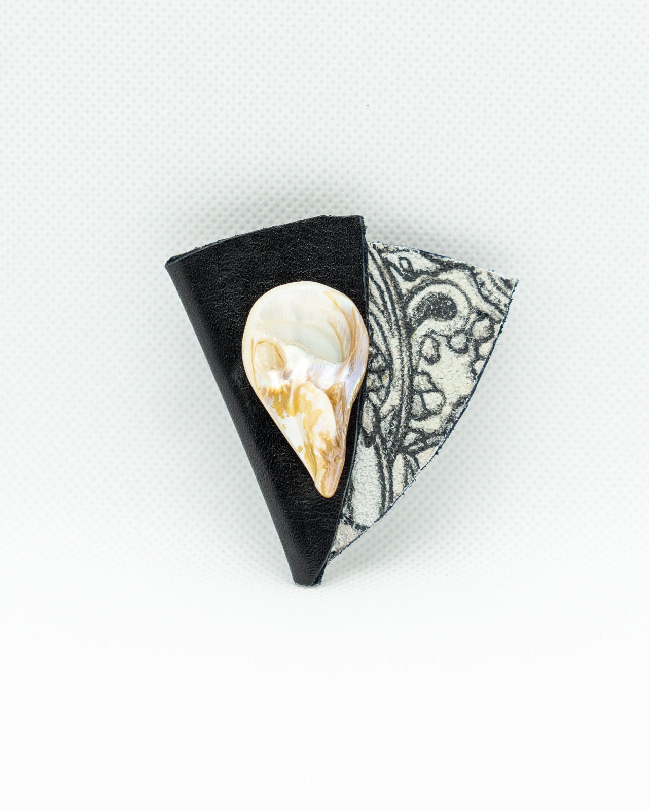 NOPMI – vėduoklės formos sagė, kurioje derinama juoda ir raštuota balta oda, sukuriant rafinuotą monochrominį kontrastą. Centrinėje detalėje – lygus, perlamutrinis kriauklės akcentas su šiltais smėlio atspalviais, suteikiančiais organiškos elegancijos.