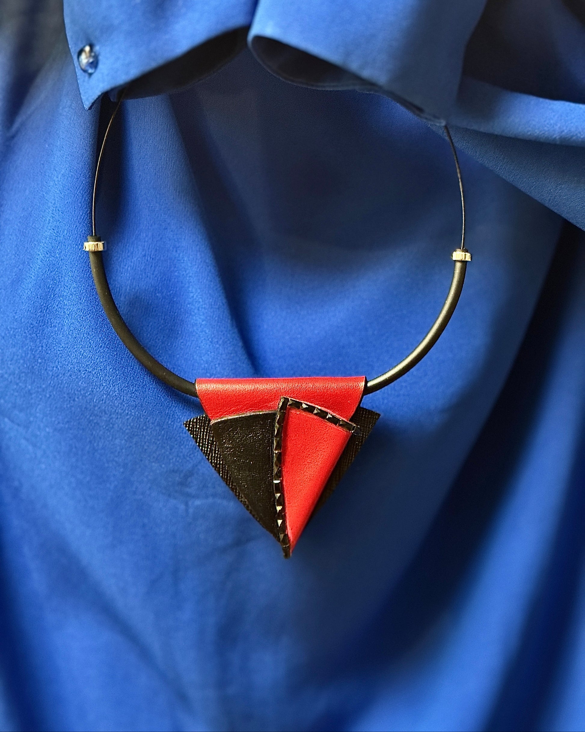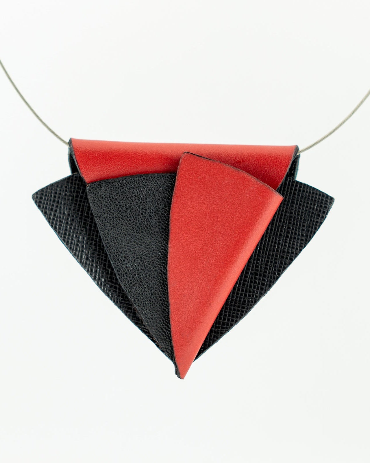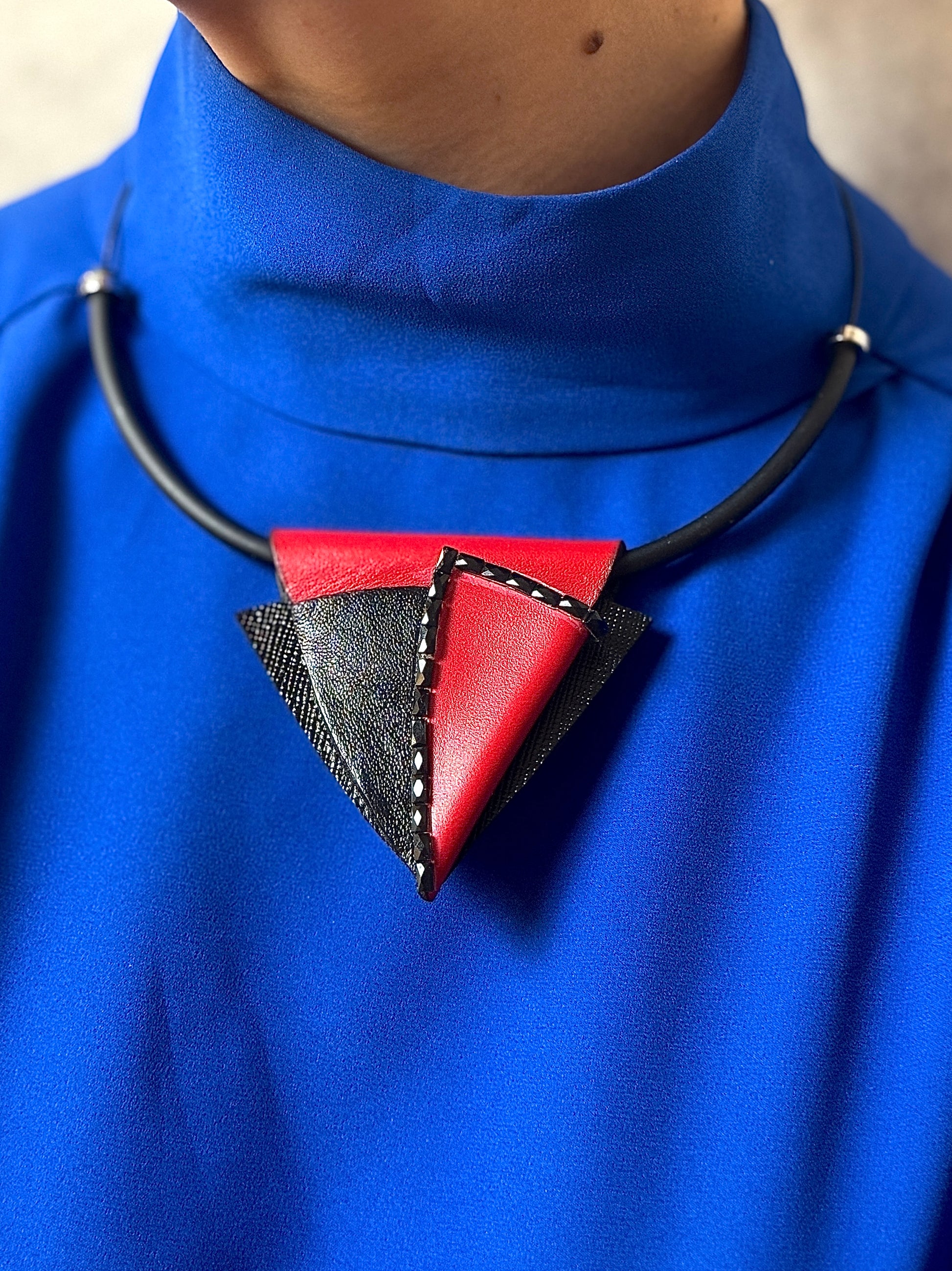 TORGO – drąsus pakabukas, pasižymintis geometrine sluoksniuotos juodos ir raudonos odos kompozicija, sukuriančia ryškų tekstūros ir spalvos kontrastą. Jo skulptūriškas dizainas spinduliuoja pasitikėjimu savimi ir moderniu meniškumu. Išraiškingas aksesuaras, puikiai išryškinantis bet kokį aprangos stilių.