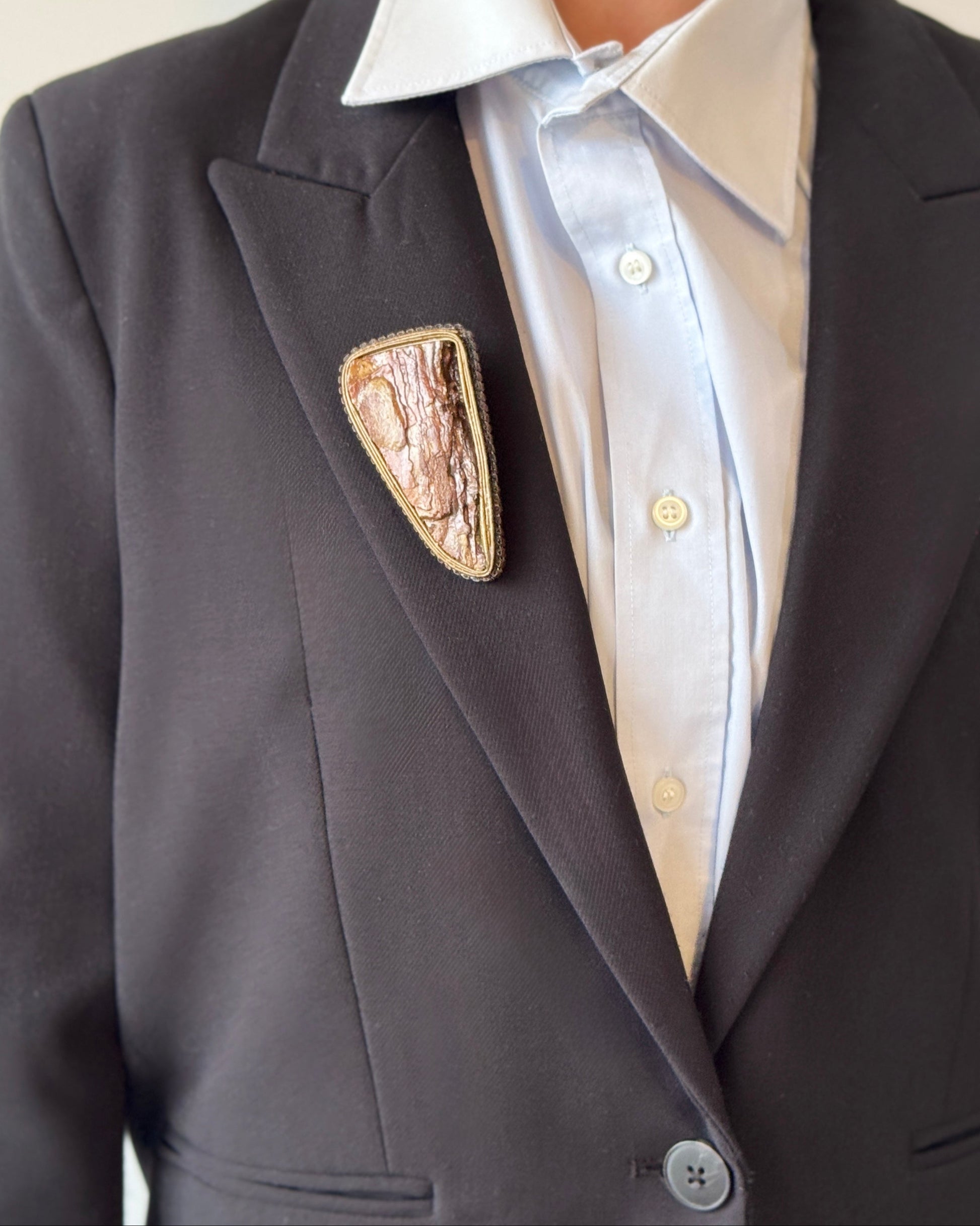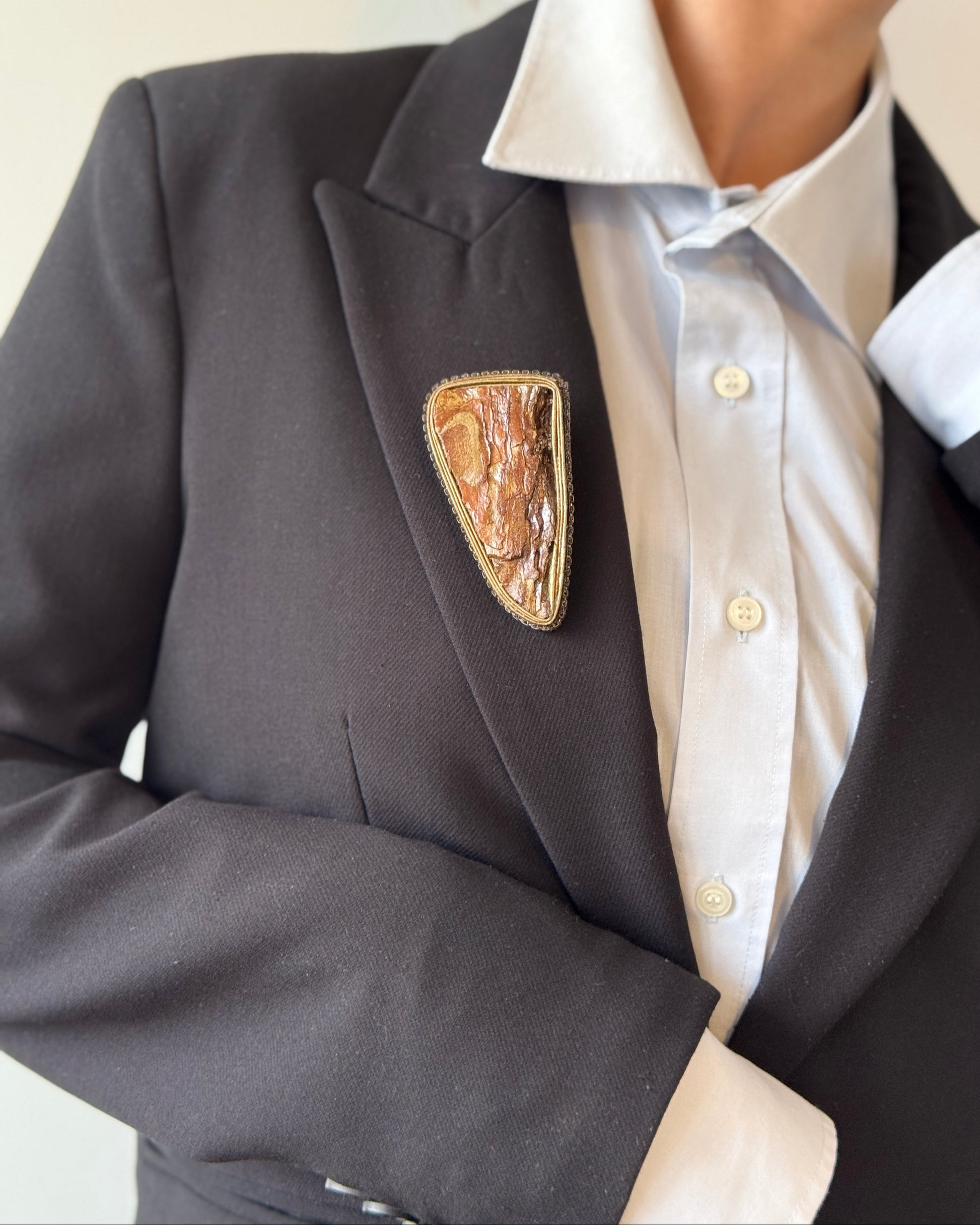 Pakelkite savo aprangą išskirtinio žavesio suteikiančia UTARI sage – rankų darbo sage, atkartojančia sendintos žievės tekstūras ir žemės atspalvius. Asimetriška forma ir sluoksniuota struktūra suteikia jai neapdoroto, tačiau rafinuoto žavesio, puikiai tinkančio gamtos įkvėptam stiliui. Utari sagė yra akį traukiantis akcentas prie paltų, rankinių ar šalikų.