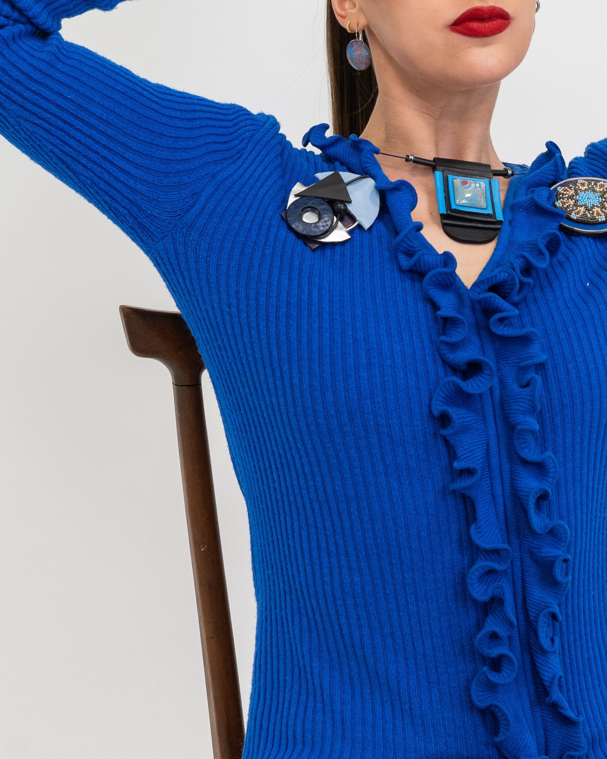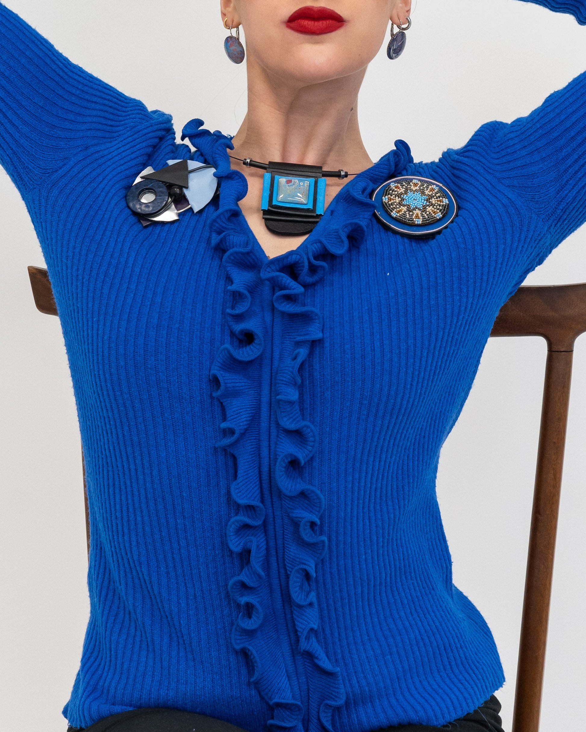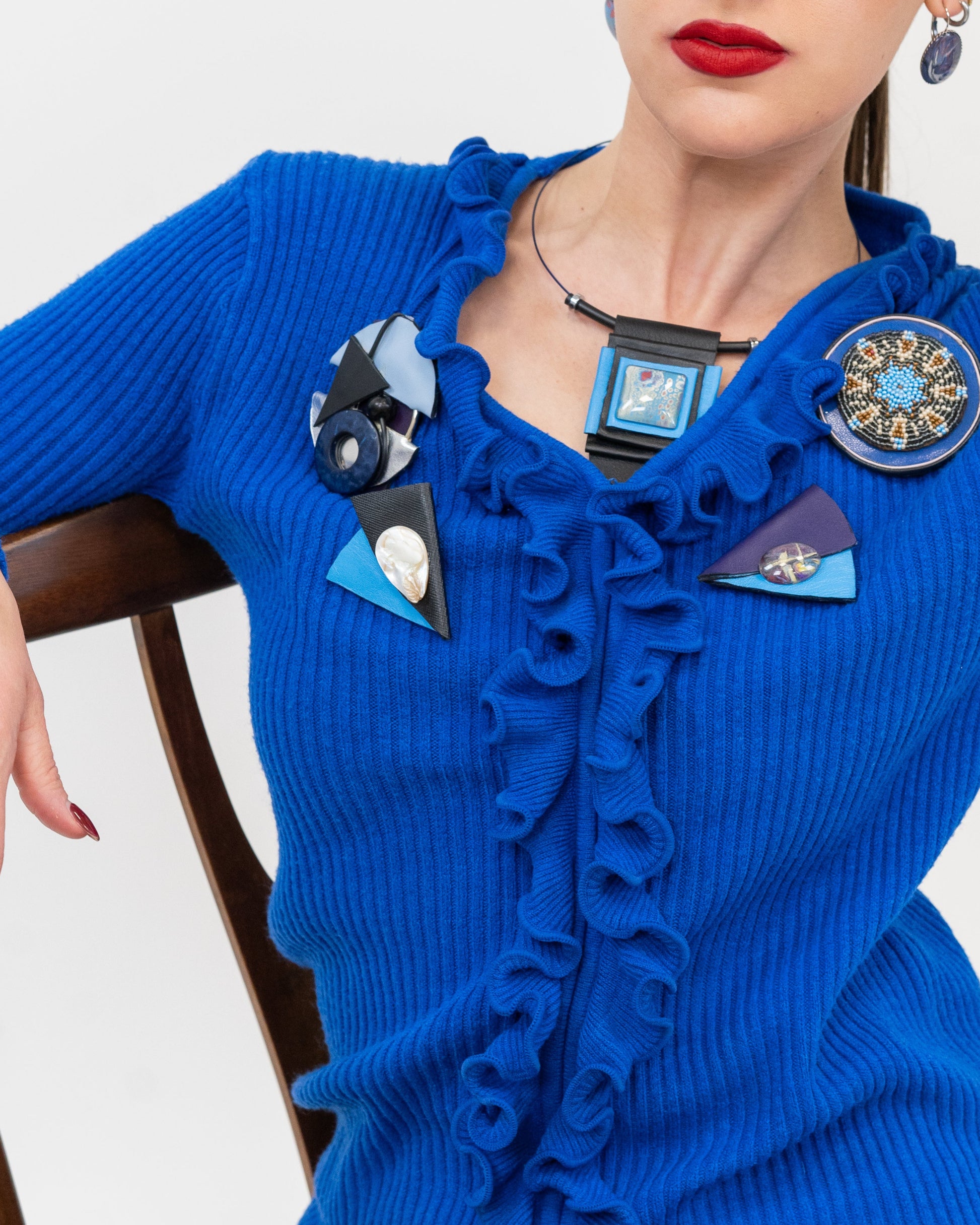 YGADI – avangardinė sagė pasižymi ryškiu geometrinių formų deriniu iš sidabrinės, juodos ir švelniai mėlynos odos, o įspūdį palieka ryškus marmurinis tamsiai mėlynas apskritimas. Jos daugiasluoksnis, skulptūriškas dizainas spinduliuoja modernų meną ir pasitikėjimą savimi. Išskirtinis aksesuaras, puikiai tinkantis kūrybiniam individualumui išreikšti.
