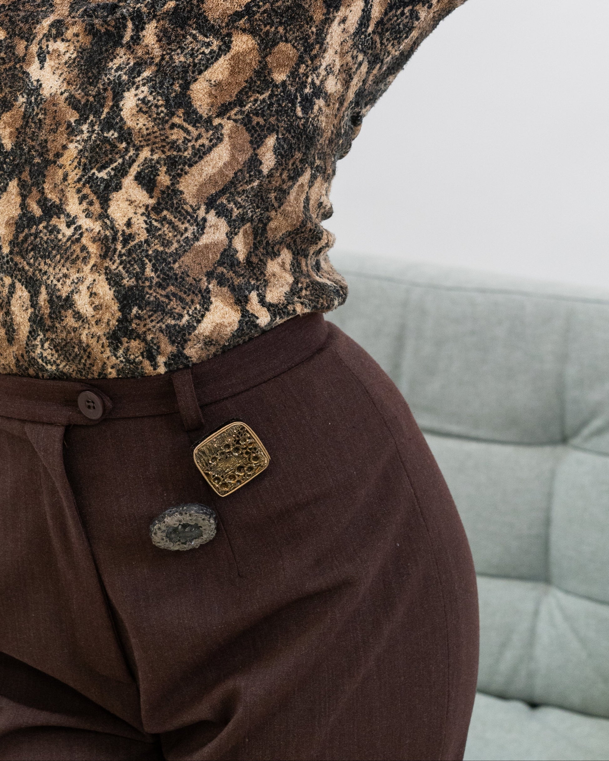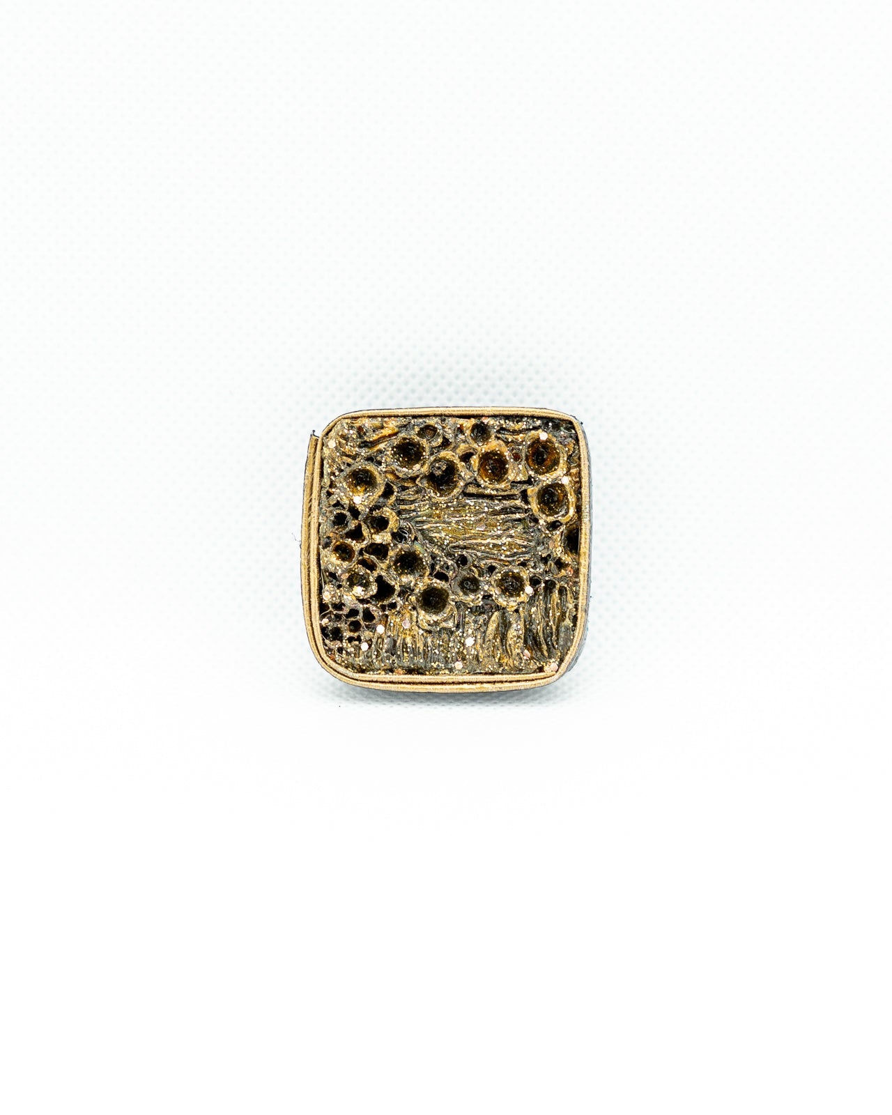 YZURI – kvadratinė sagė pasižymi tekstūruotu, metalinio aukso paviršiumi, primenančiu išlydytą metalą ir organinius raštus. Jos sudėtingos detalės gražiai pagauja šviesą, suteikdamos gylio ir sodrumo. Prabangus, išskirtinis aksesuaras, spinduliuojantis elegancija ir meniniu rafinuotumu.