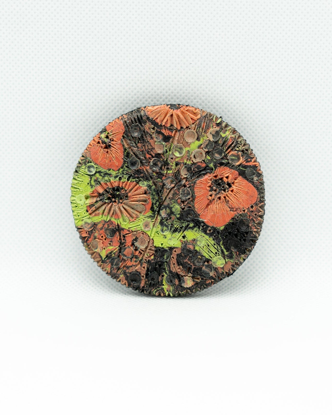 Drąsi ir žemiška, ši apvali ZEIDI sagė pasižymi sodrios tekstūros gėlių raštu ryškiai oranžiniais, žaliais ir tamsiai rudais atspalviais. Rankų darbo paviršius suteikia bet kokiai aprangai neapdoroto, organiško žavesio. Puikus akcentas gamtos įkvėptų aksesuarų mėgėjams.