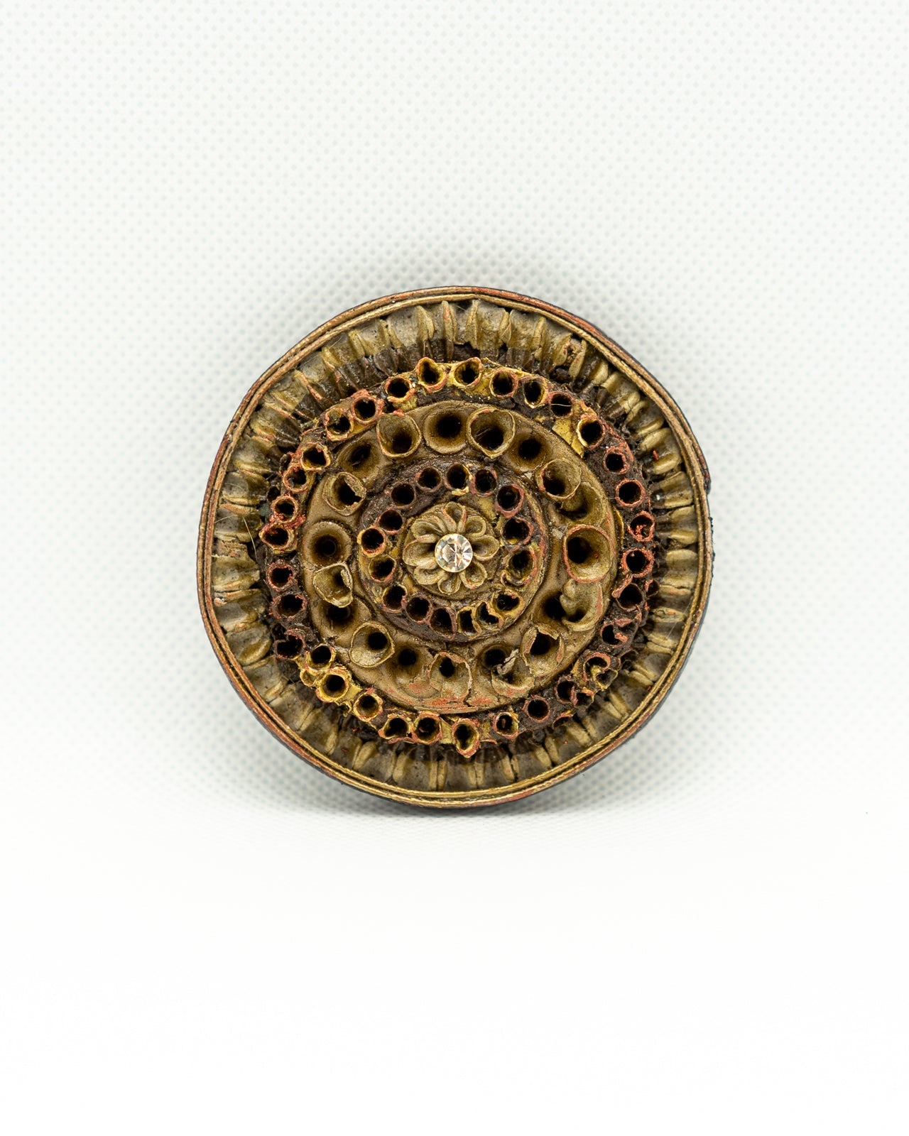Ši įmantri apvali ZULDI sagė pasižymi kerinčiu spiraliniu raižytų, korio formos tekstūrų raštu sendinto aukso ir bronzos atspalviuose. Jos centre esantis mažytis kristalas suteikia subtilaus elegancijos spindesio. Išskirtinis aksesuaras, kuriame dera organiška forma ir vintažinis rafinuotumas.