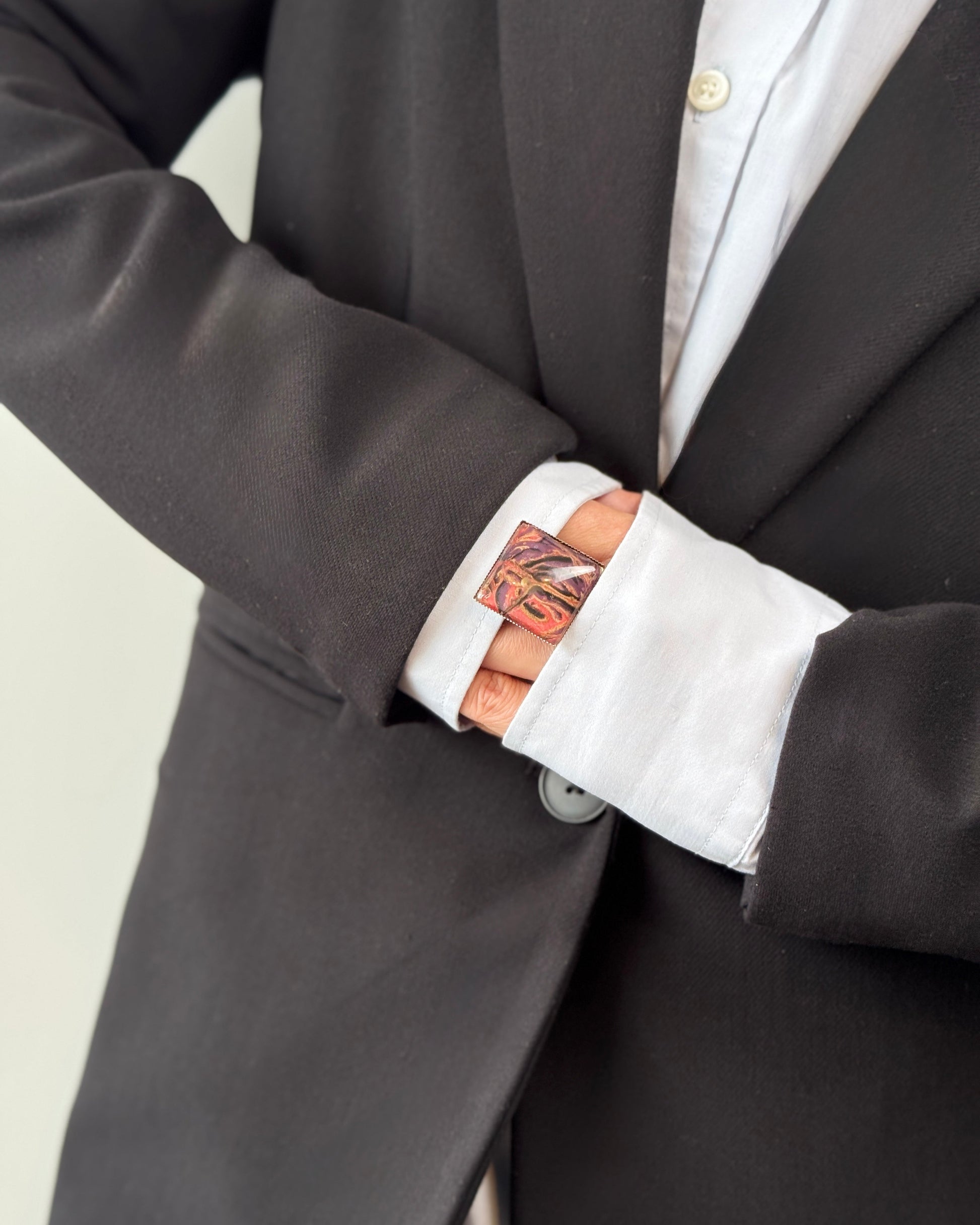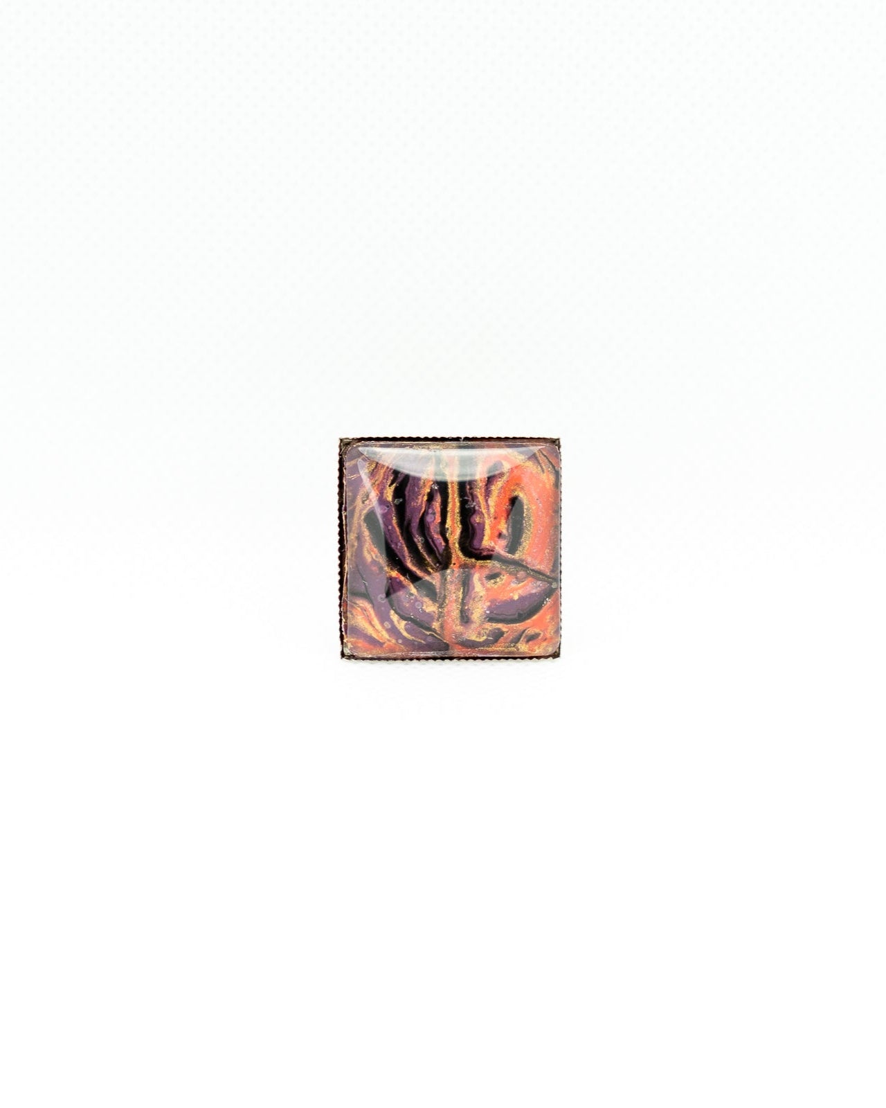 ASUNU - bold square ring features a vibrant abstract design in fiery orange, gold, and deep plum tones. Its glossy, domed surface catches the light beautifully, making it a true conversation piece. Perfect for those who love unique, statement-making accessories.
