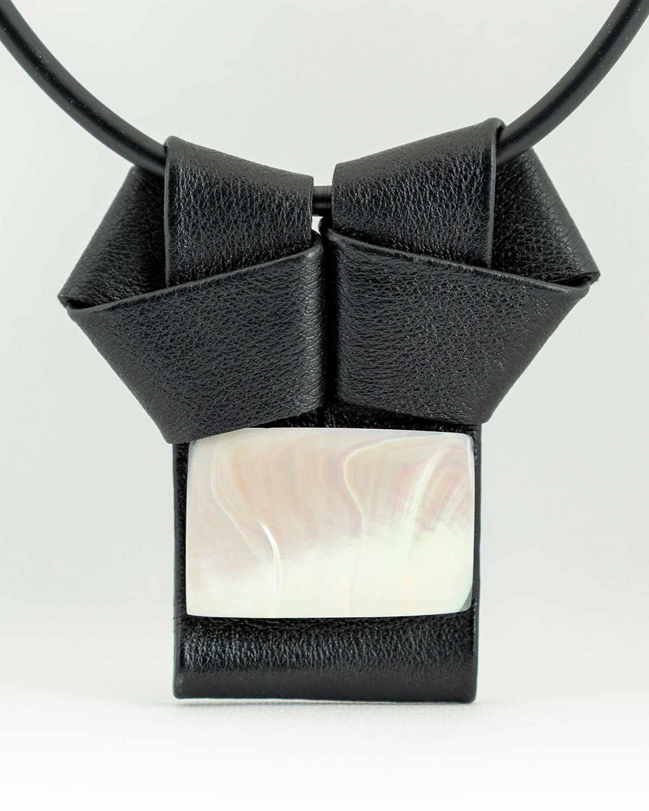 AXTRO - modern, artistic pendant featuring intricately folded black leather elements forming a symmetrical bow-like design. At its center is a smooth, rectangular mother-of-pearl inlay that adds a soft iridescent contrast. The pendant hangs from a sleek black cord, combining elegance with a bold, contemporary aesthetic.
