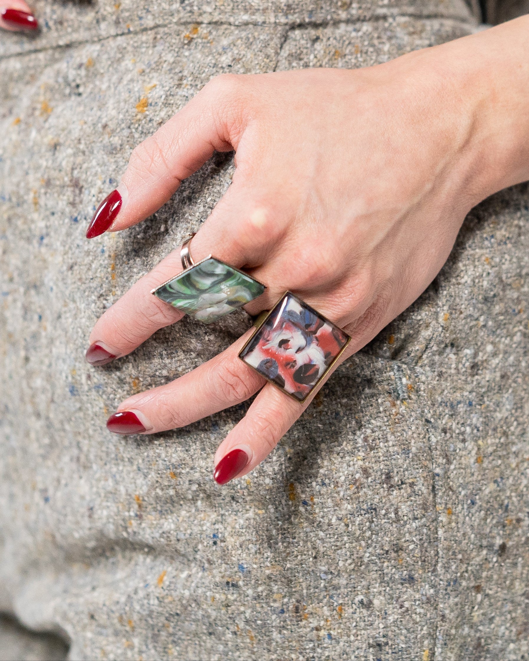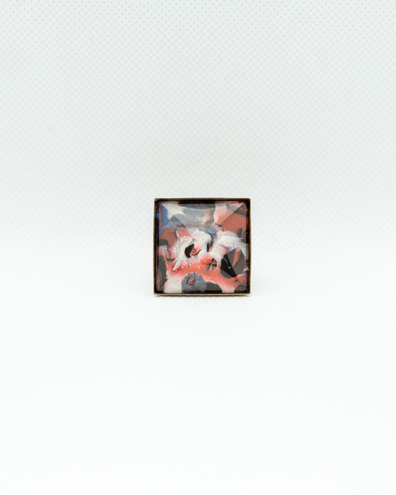 BITSU - square ring features a bold, abstract swirl of red, black, white, and hints of blue, creating a striking, painterly effect. The glossy finish enhances its depth and artistic flair. A modern statement piece perfect for expressing creativity and confidence.