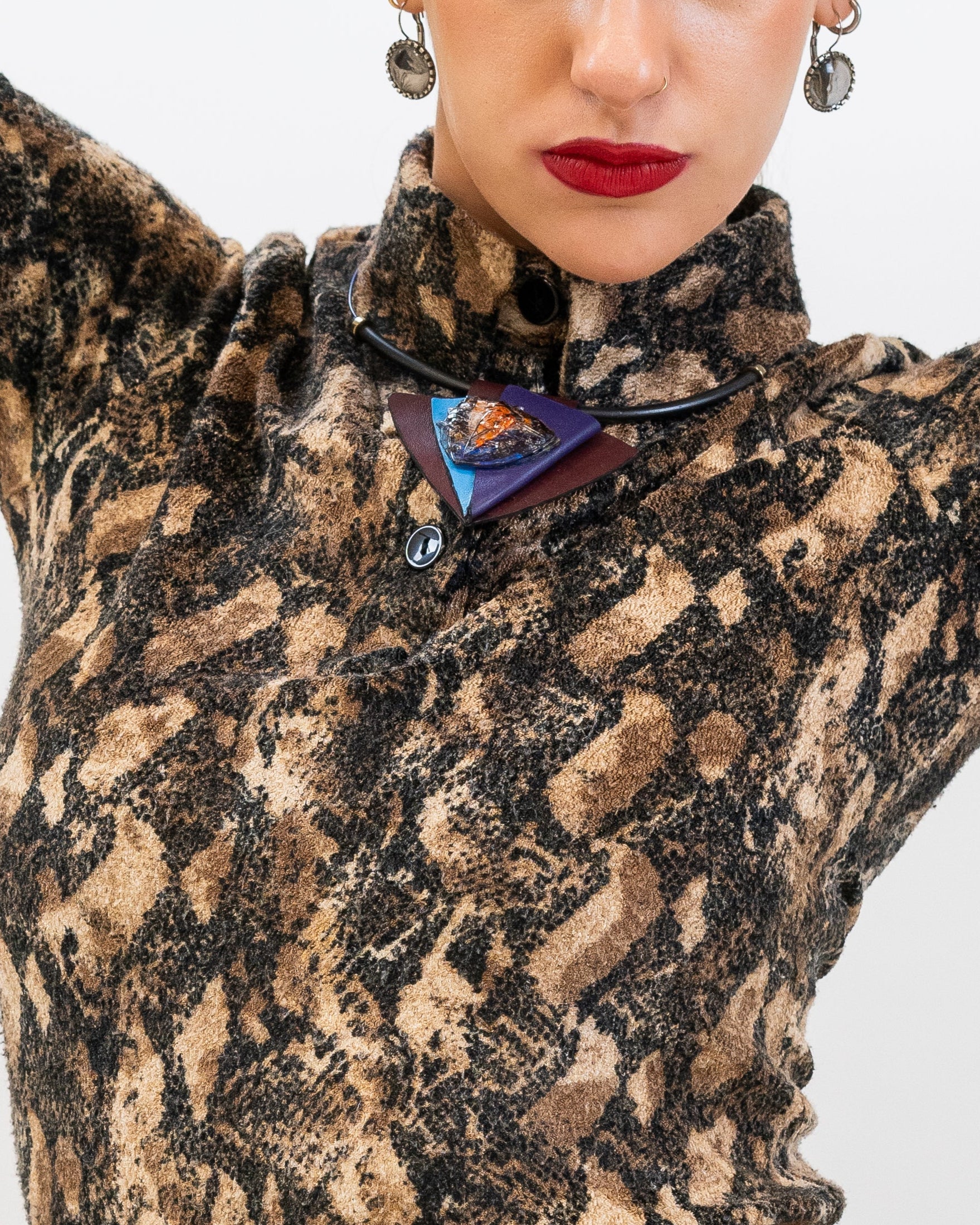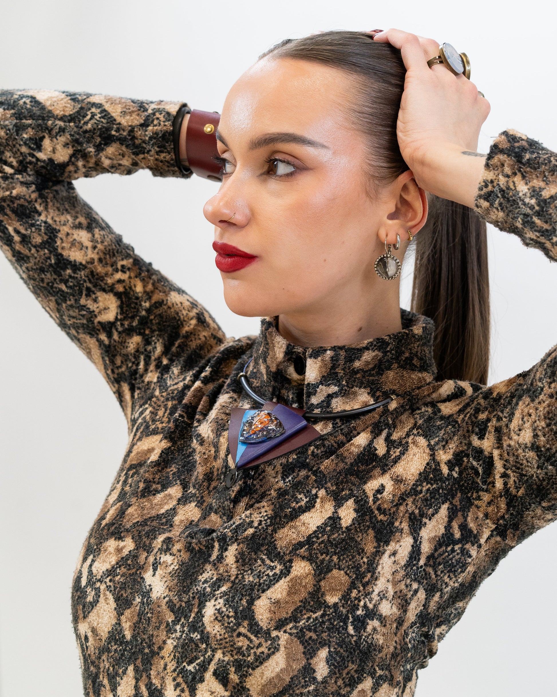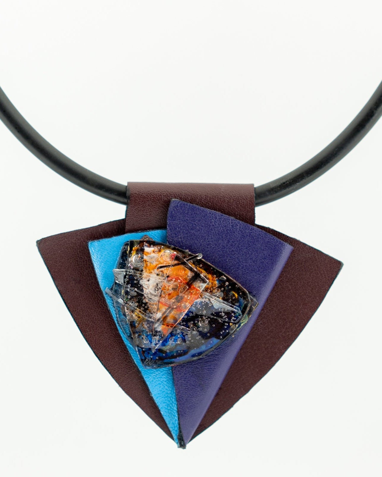 BRONO features a striking geometric design crafted from layered leather in rich burgundy, deep purple, and vibrant turquoise. At its center lies a bold, multicolored glass piece with abstract patterns in orange, blue, and black, adding a dynamic, artistic flair. Suspended on a black cord with metallic accents, it’s a vivid statement piece with a modern, sculptural aesthetic.