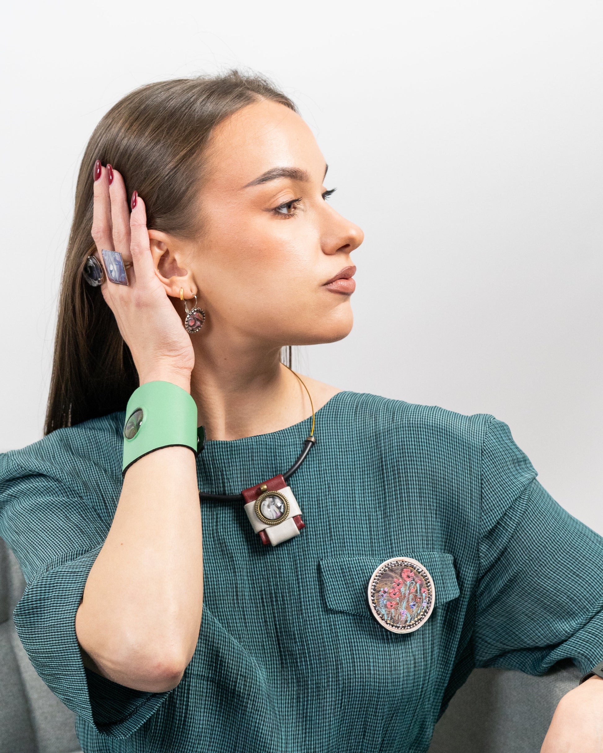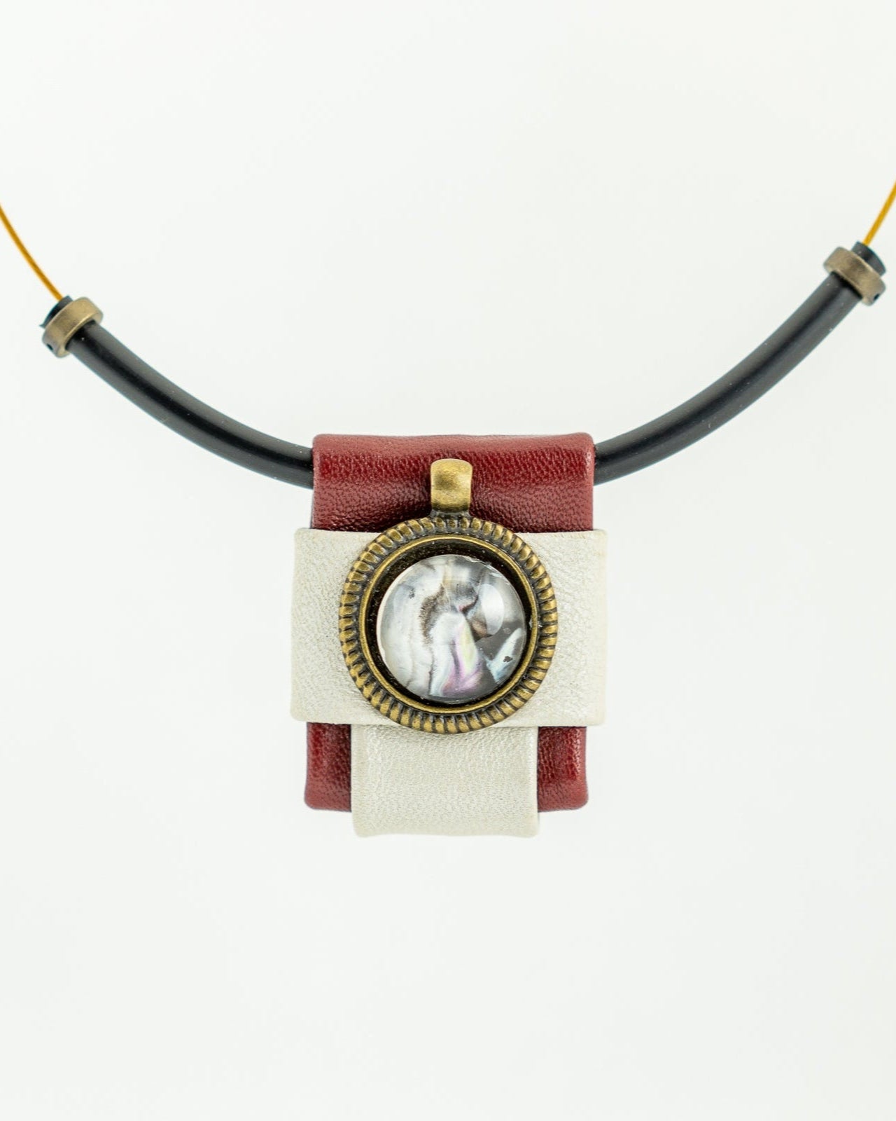 DENTO combines vintage charm with modern structure, featuring layered leather in deep red and ivory tones. At its center is a round, antique-bronze bezel holding an iridescent cabochon with marble-like swirls. Suspended on a sleek black and orange cord, it merges classic elegance with contemporary design.