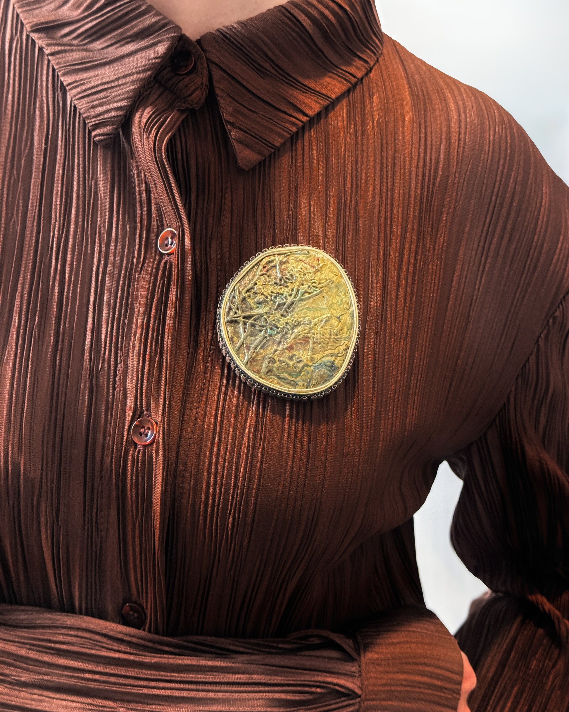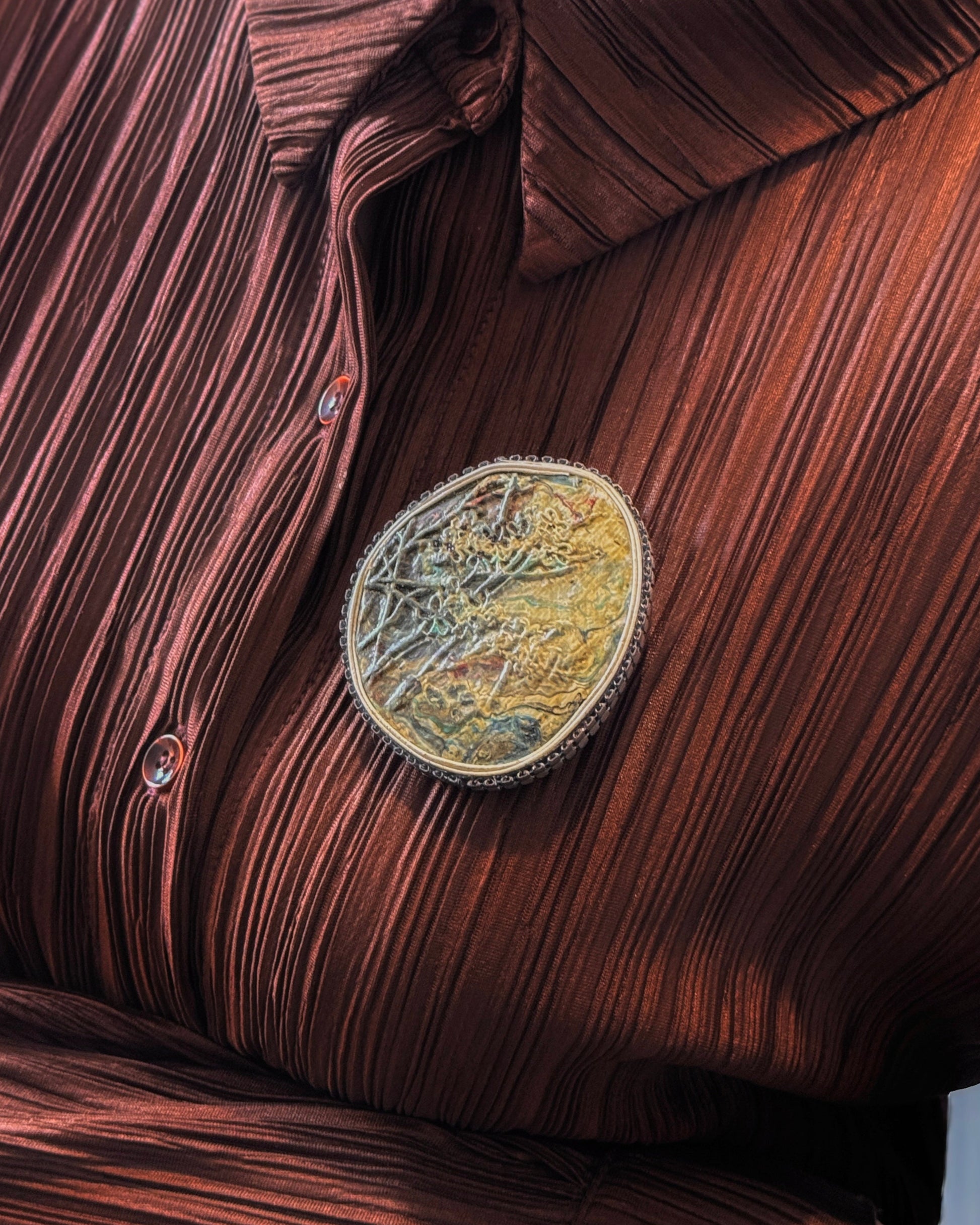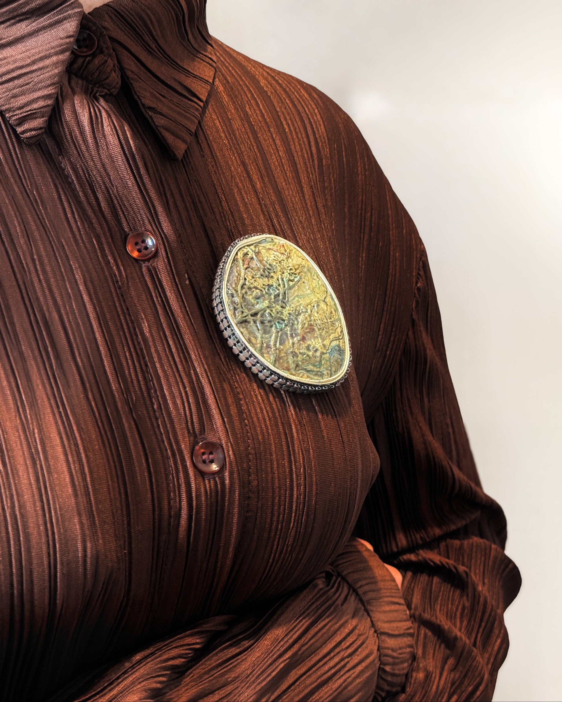 ERATI - An abstract oval brooch featuring an organic, textured surface with intricate layers of earthy yellows, greens, and subtle hints of red and blue. The fluid, natural patterns create a sense of geological depth and movement, making it a distinctive statement piece that blends art and nature effortlessly. Perfect for adding character and sophistication to any outfit.