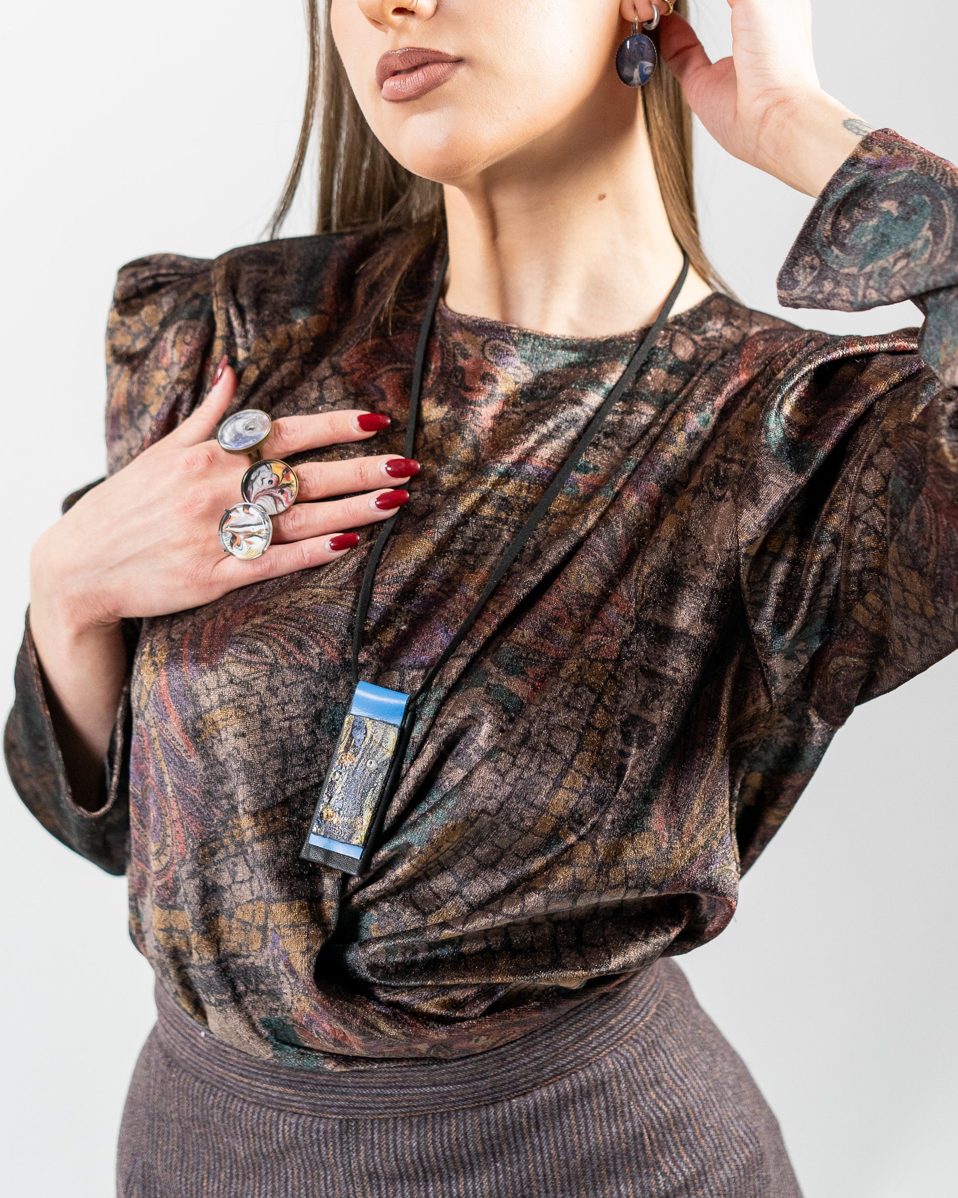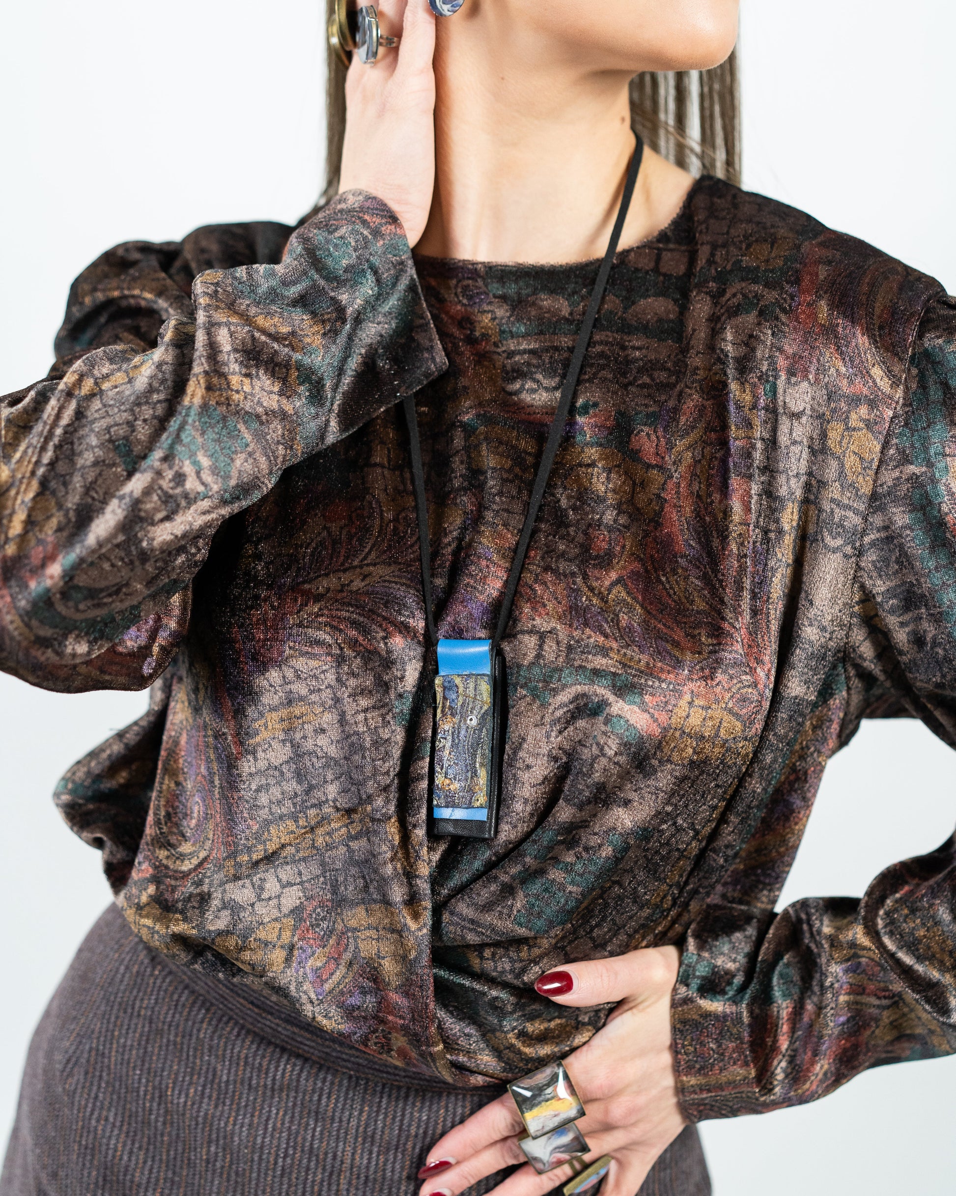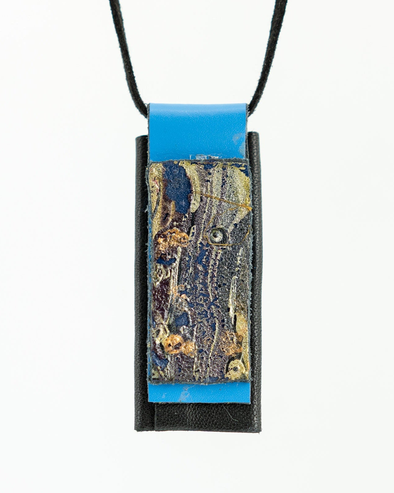 ERENO - modern pendant combines sleek black and blue leather with a textured, metallic centerpiece in gold and indigo tones. Its vertical design and layered structure create a bold yet refined aesthetic. A unique piece that effortlessly merges art, texture, and sophistication.
