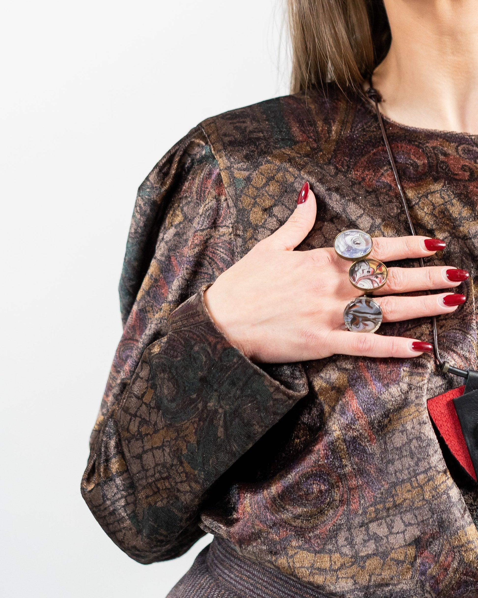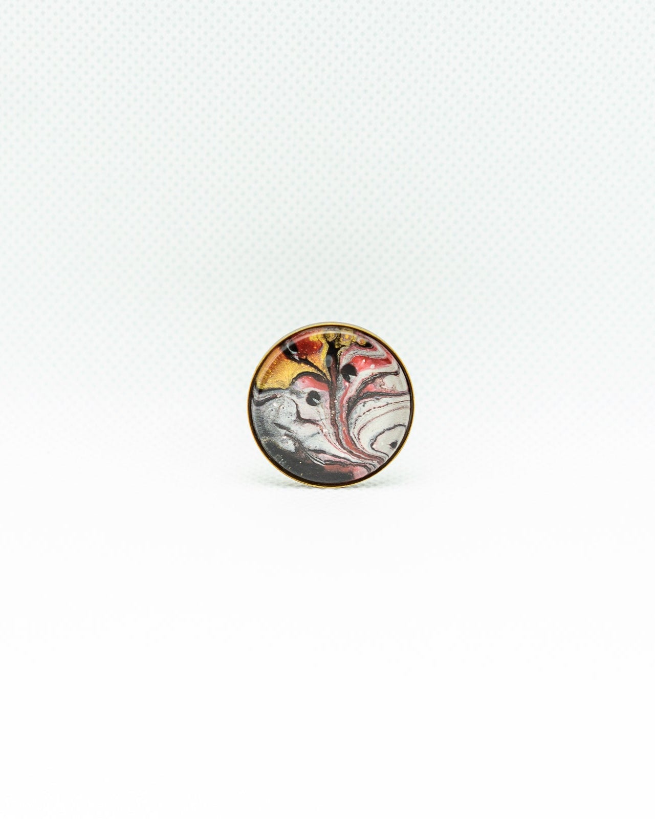 FANTU - round ring showcases a stunning marbled blend of gold, red, black, and white tones that flow together in an abstract, fiery design. Its glossy finish adds brilliance and depth to the colors. A bold and artistic accessory that exudes confidence and creativity.