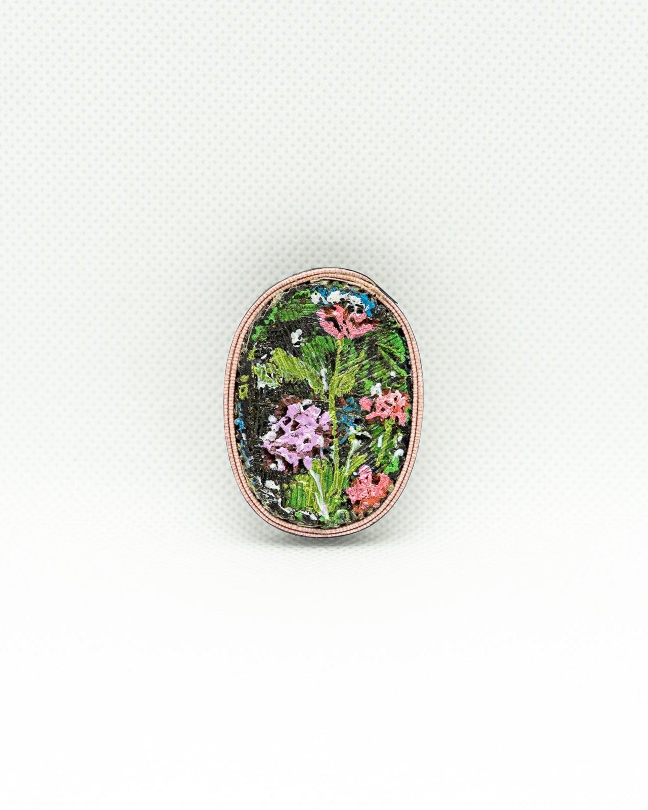 Delicate and whimsical, this oval FARLI brooch captures a blooming garden scene with textured pink, purple, and red flowers against a deep green backdrop. Each detail is hand-finished, bringing the charm of wildflowers to life. A sweet, nature-inspired piece to brighten any outfit.