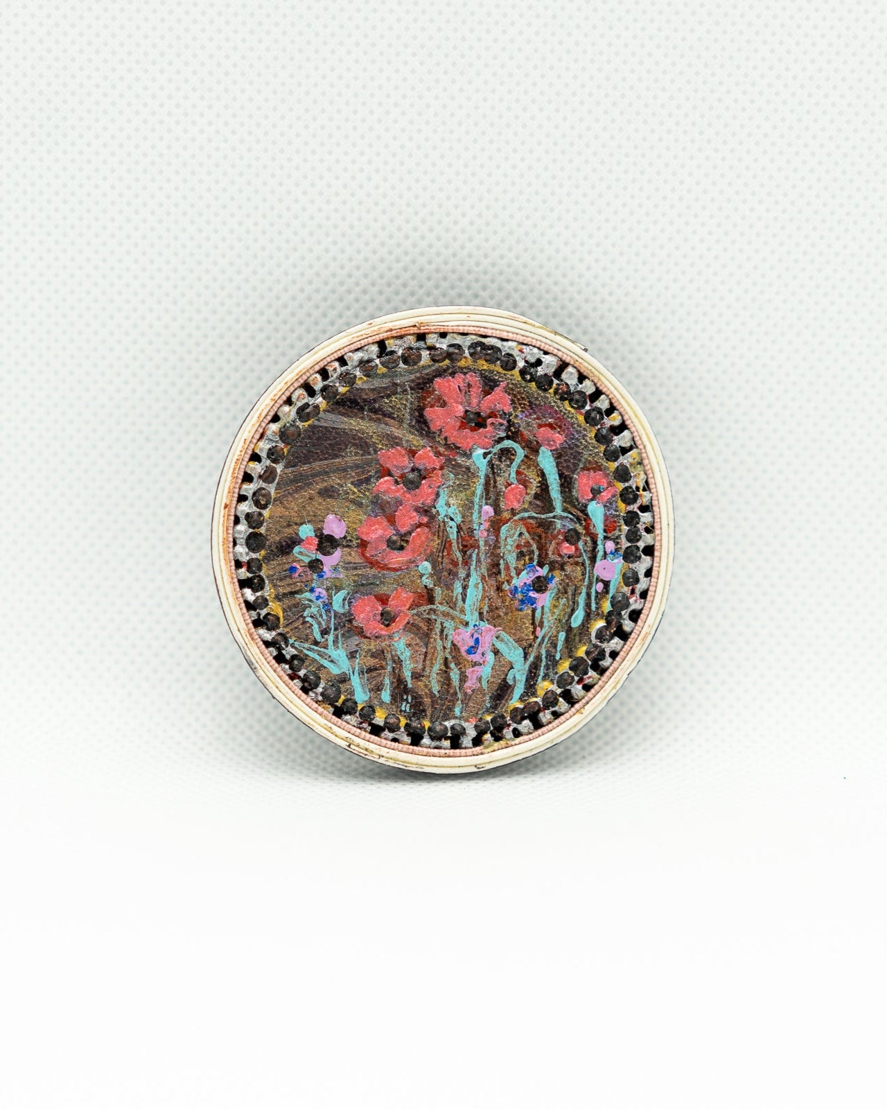This elegant round FLERI brooch showcases a hand-painted floral design with vivid red poppies and delicate accents in blue and purple. Surrounded by a sparkling black gemstone border, it exudes vintage charm and artistic flair. A perfect accessory to elevate your look with timeless beauty.