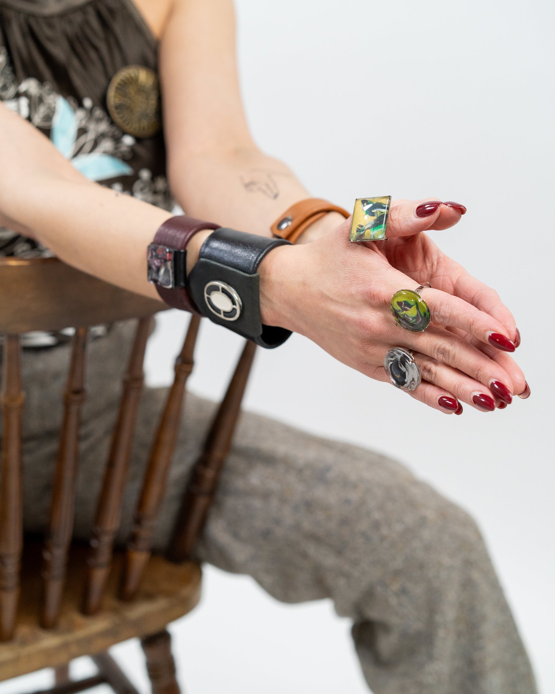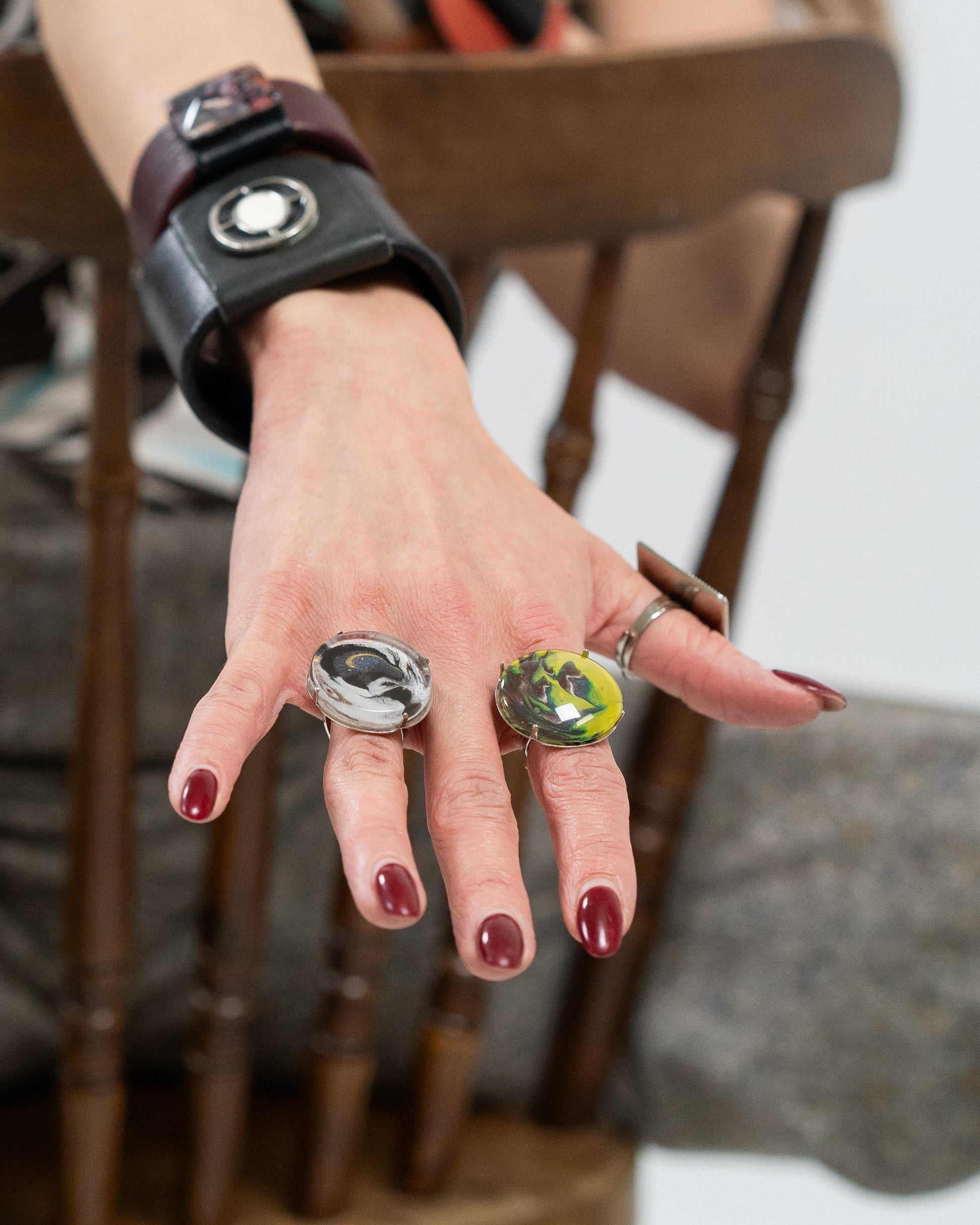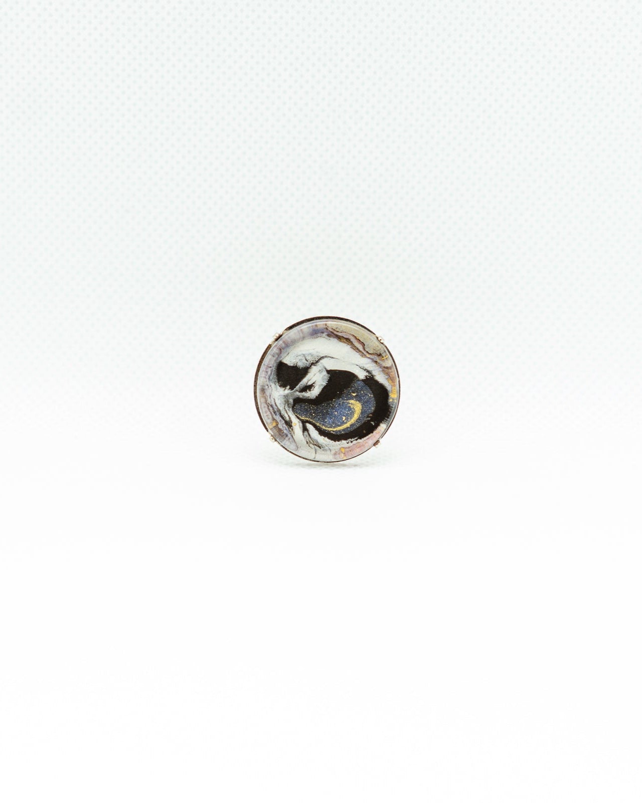 FLOTU - mesmerizing round ring features a swirling blend of black, white, gold, and deep blue, reminiscent of a cosmic galaxy. The glossy finish enhances its celestial depth and shimmer. A captivating statement piece that brings art and mystery to your style.