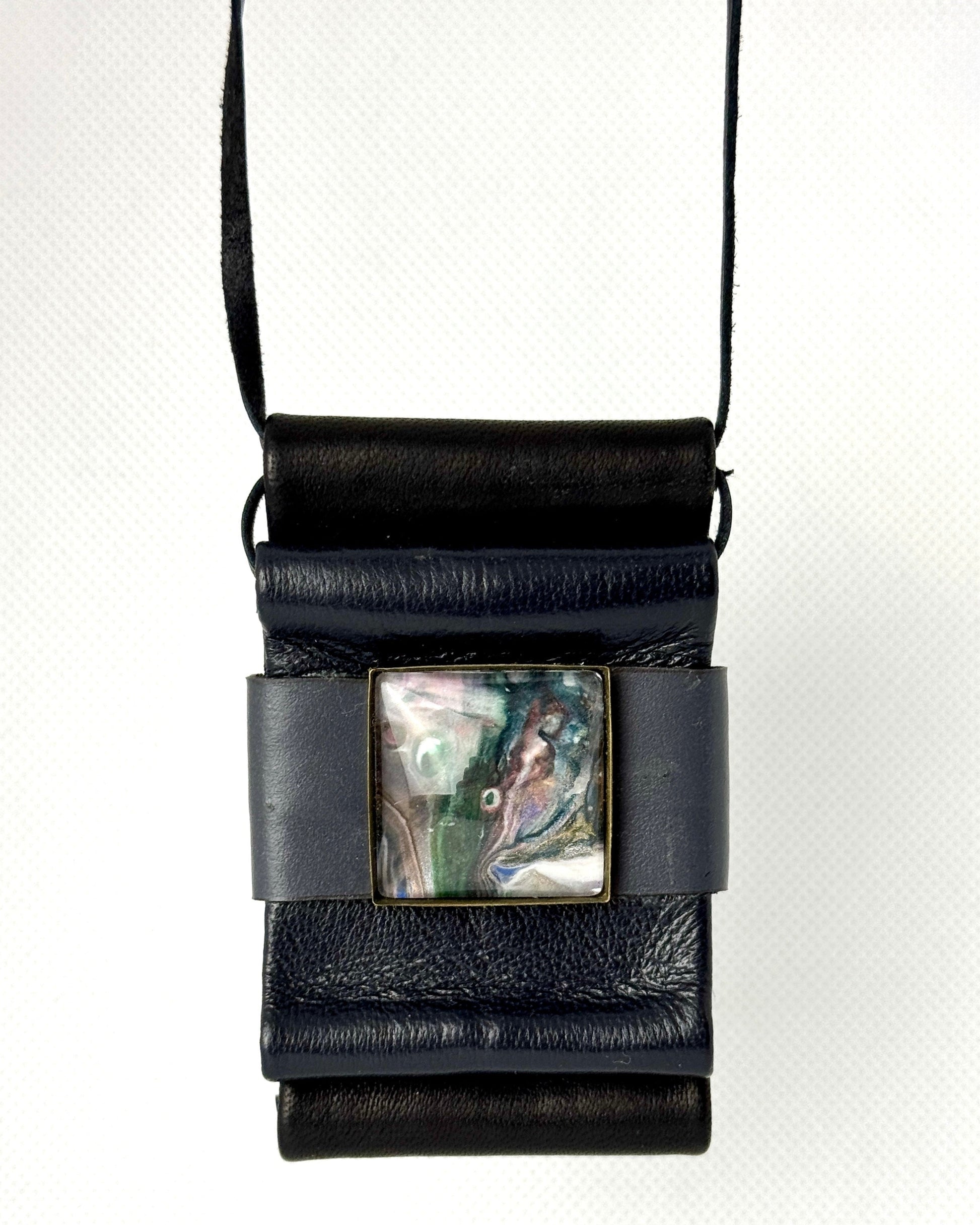 GOTRO - sculptural pendant features deep navy leather layers accented by a mesmerizing abstract glass detail. The central stone swirls with ethereal greens, purples, and silvers, evoking a miniature cosmic landscape. A bold yet refined piece for those drawn to modern art and texture.