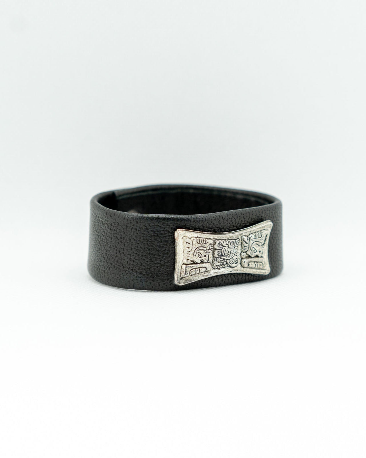 KLODE - sleek black leather bracelet features an antique-style silver accent engraved with intricate, ancient-inspired motifs. Its minimalist yet bold design makes it a versatile statement piece. Perfect for those who appreciate artistry with a touch of mystique and timeless character.