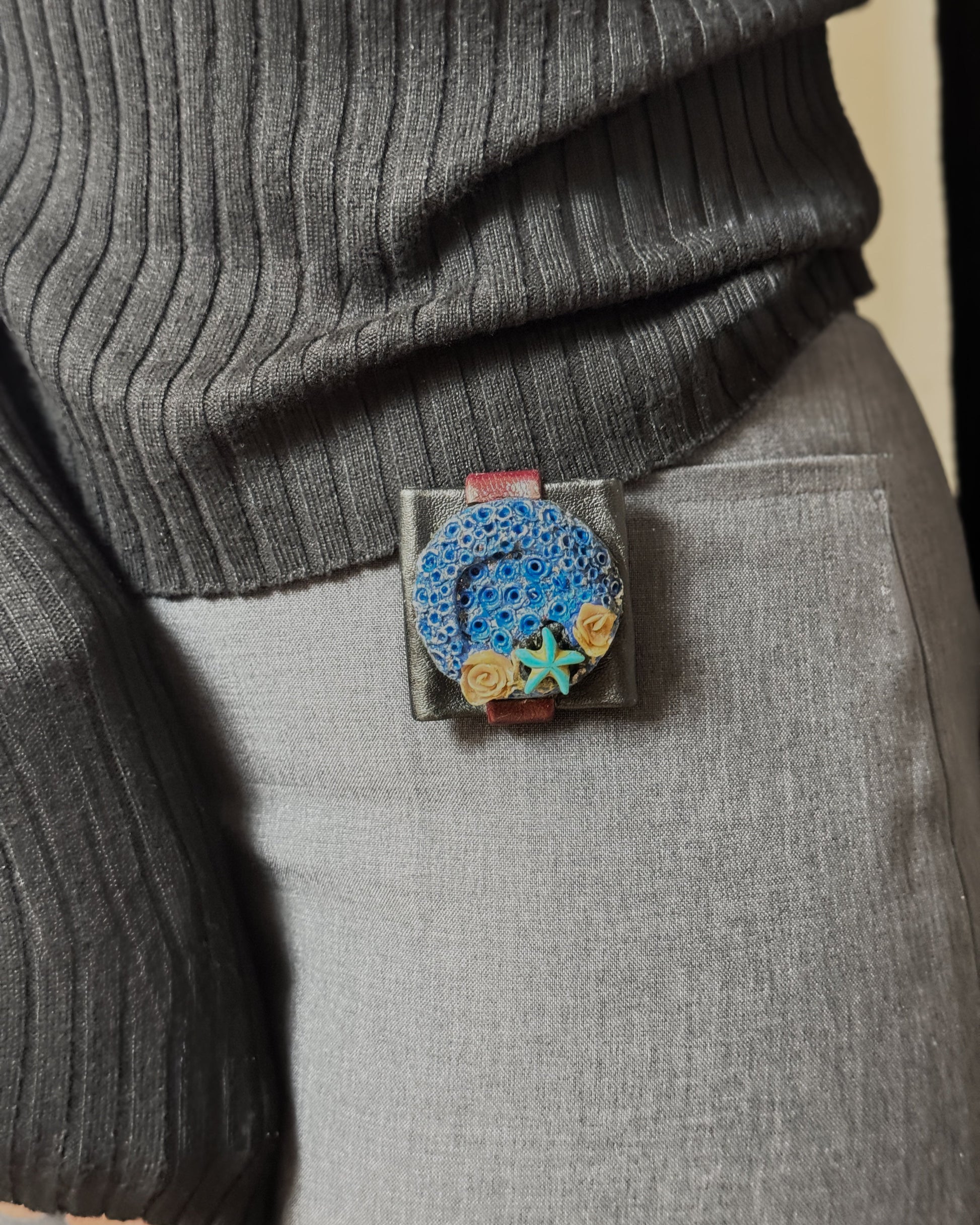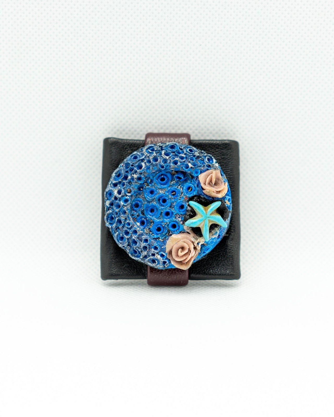 This ocean-inspired KORLI brooch features a vibrant textured blue base, adorned with delicate blush roses and a charming starfish detail. Its sculptural design evokes the magic of coral reefs and seaside treasures. A whimsical accessory perfect for nature lovers and dreamers alike.