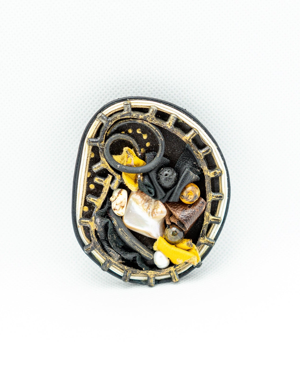 This striking MEDVI brooch features a bold mix of textures and materials in black, gold, and pearl tones, creating a dramatic, sculptural effect. Encased in a unique, asymmetrical frame with a lattice border, it exudes modern elegance. Ideal for making a distinctive style statement.