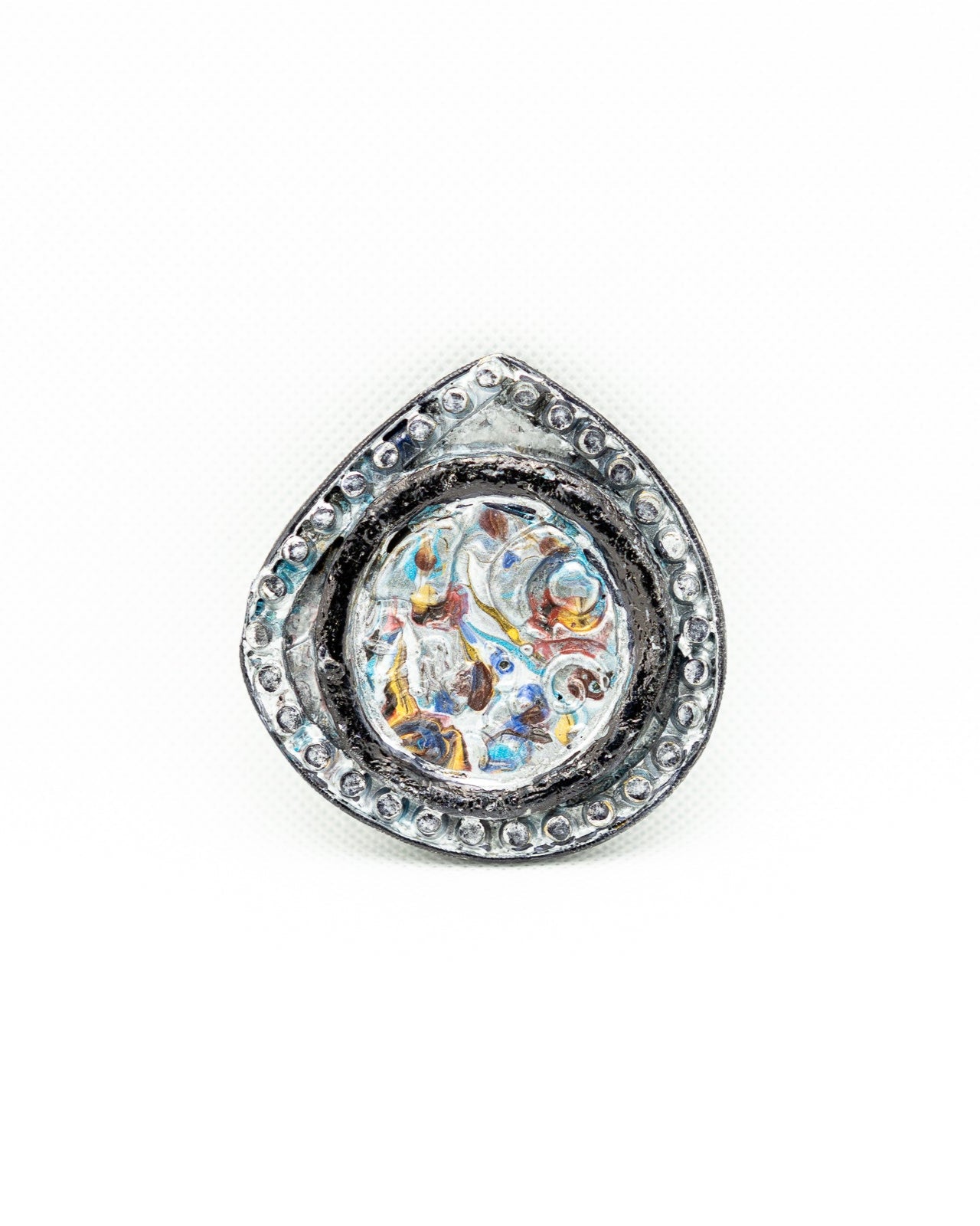 MOMVI - a teardrop-shaped brooch with a textured metallic frame accented by a ring of small, raised silver studs. The center features a swirling abstract design in shades of blue, yellow, brown, and white, creating a marbled effect that gives the piece a fluid, cosmic appearance.