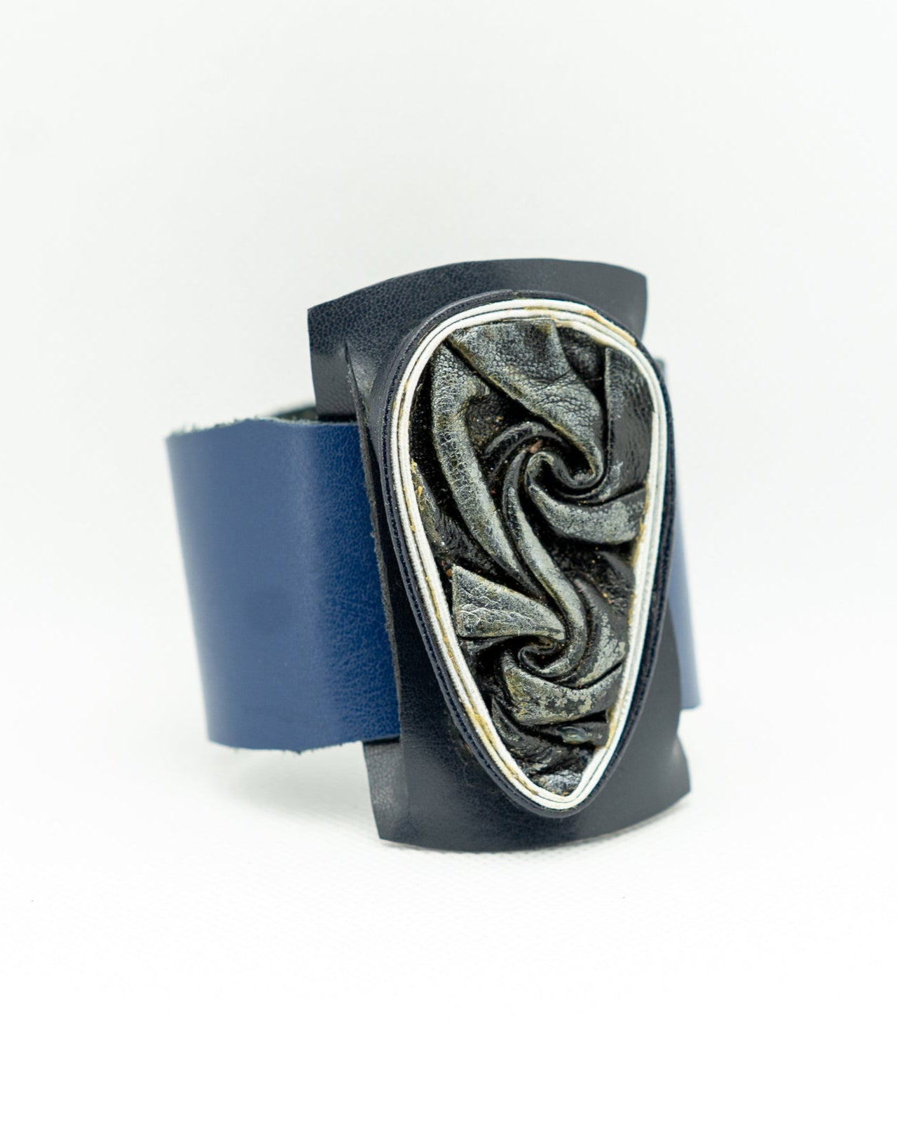 MYTUE - avant-garde leather bracelet features a sculptural centerpiece framed in silver, resembling swirling folds of textured fabric. The deep navy band adds a sleek contrast, enhancing its modern, artistic edge. A bold, one-of-a-kind accessory for those who embrace creative design and individuality.
