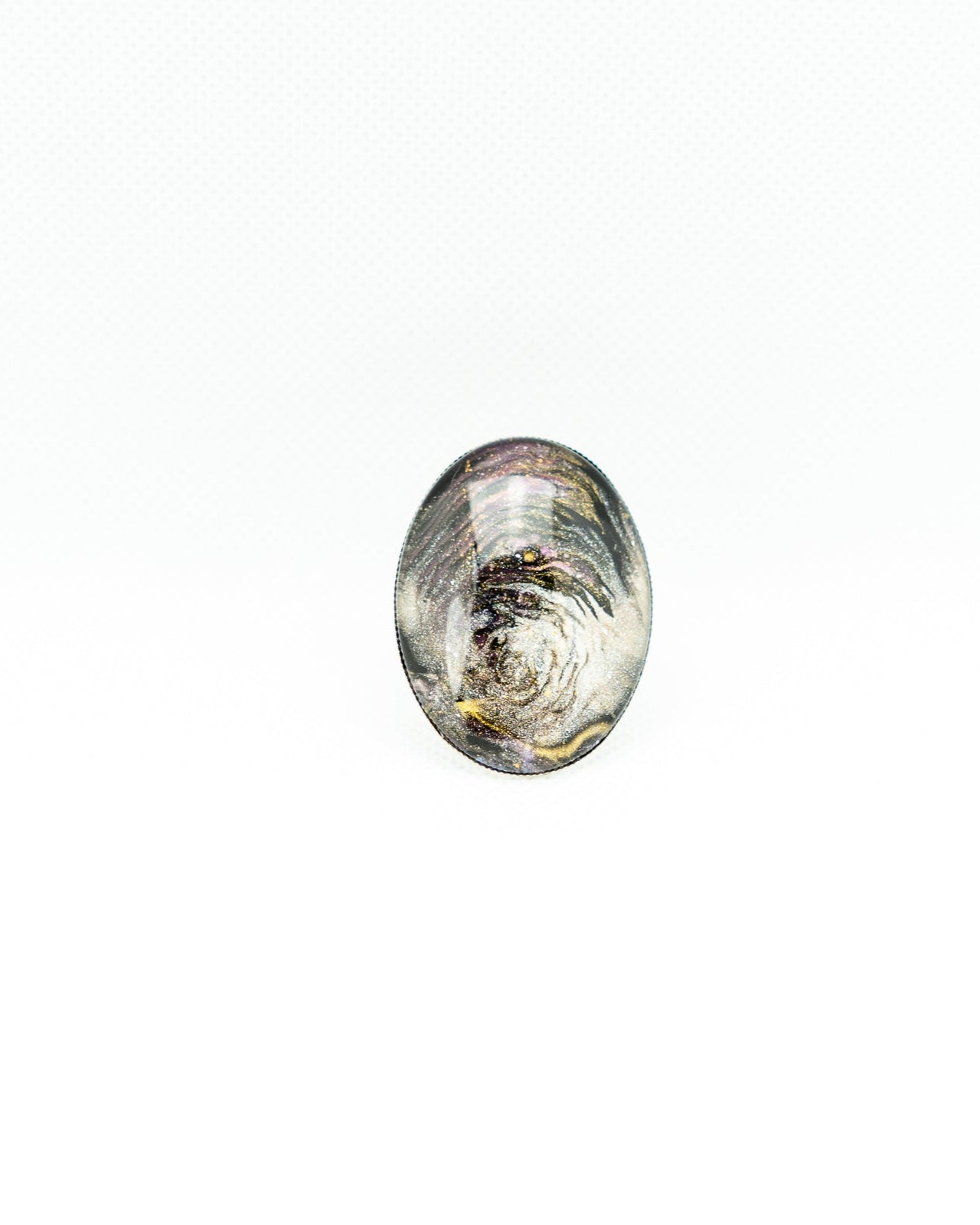 NANGU - stunning oval gemstone features a mesmerizing swirl of metallic silver, gold, and black hues with a glossy finish. Its unique pattern and high polish make it a captivating centerpiece for custom jewelry. Perfect for collectors and artisans seeking a one-of-a-kind statement stone.