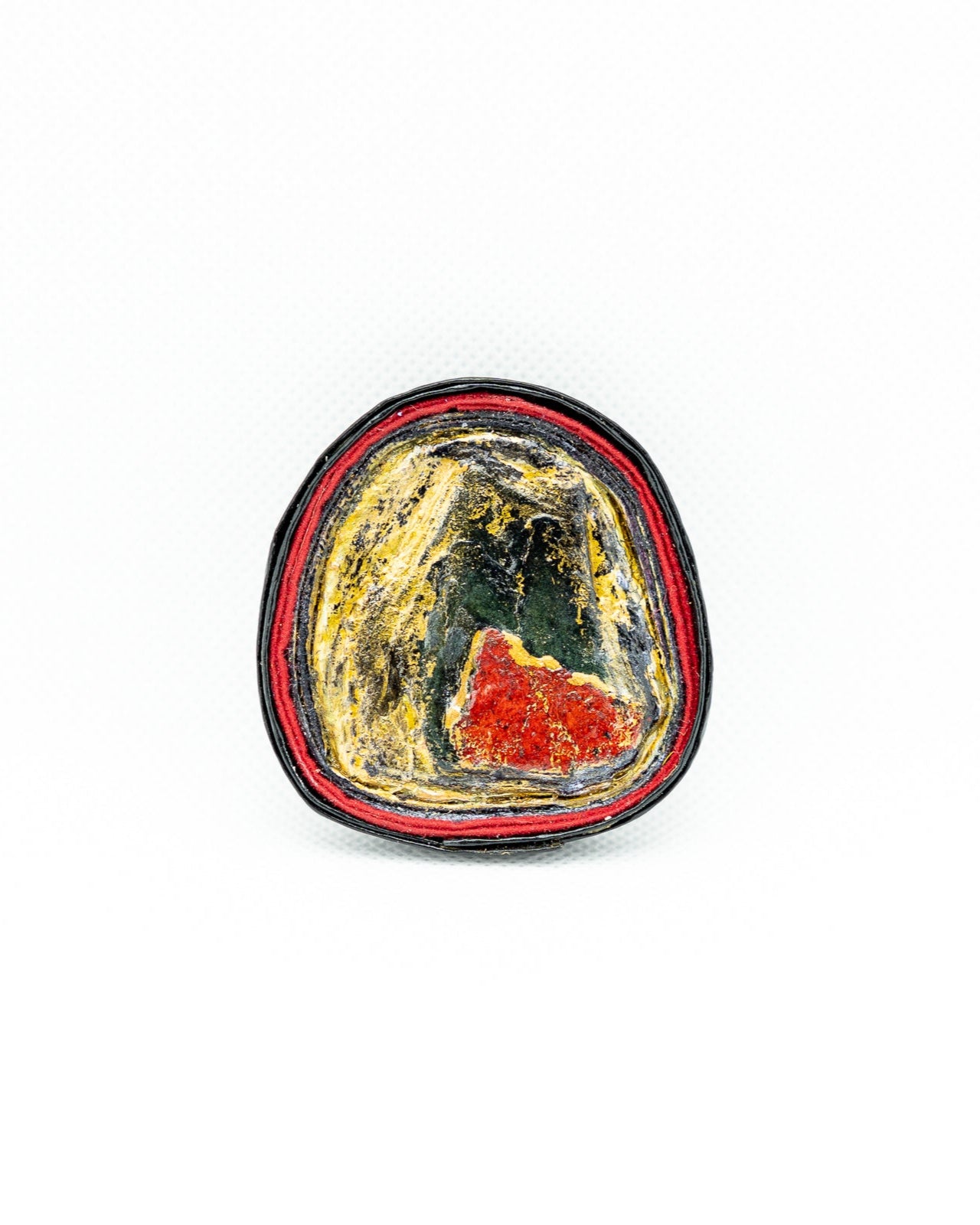 NEADI - vibrant and bold, this abstract brooch features dynamic layers of red, yellow, black, and green with a painterly, textured finish. Its irregular shape and striking color palette make it a true statement piece. Perfect for adding artistic flair to minimalist or monochrome outfits.