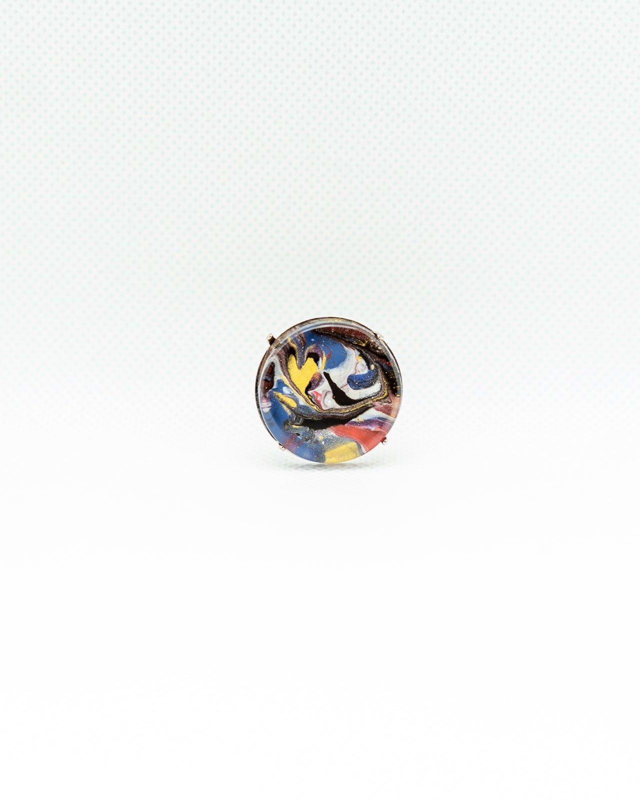NIMTU - vibrant round ring bursts with bold swirls of yellow, blue, red, and black, creating an energetic abstract design. Its glossy finish brings the colors to life, adding depth and movement. A lively statement piece perfect for those who love wearable art.
