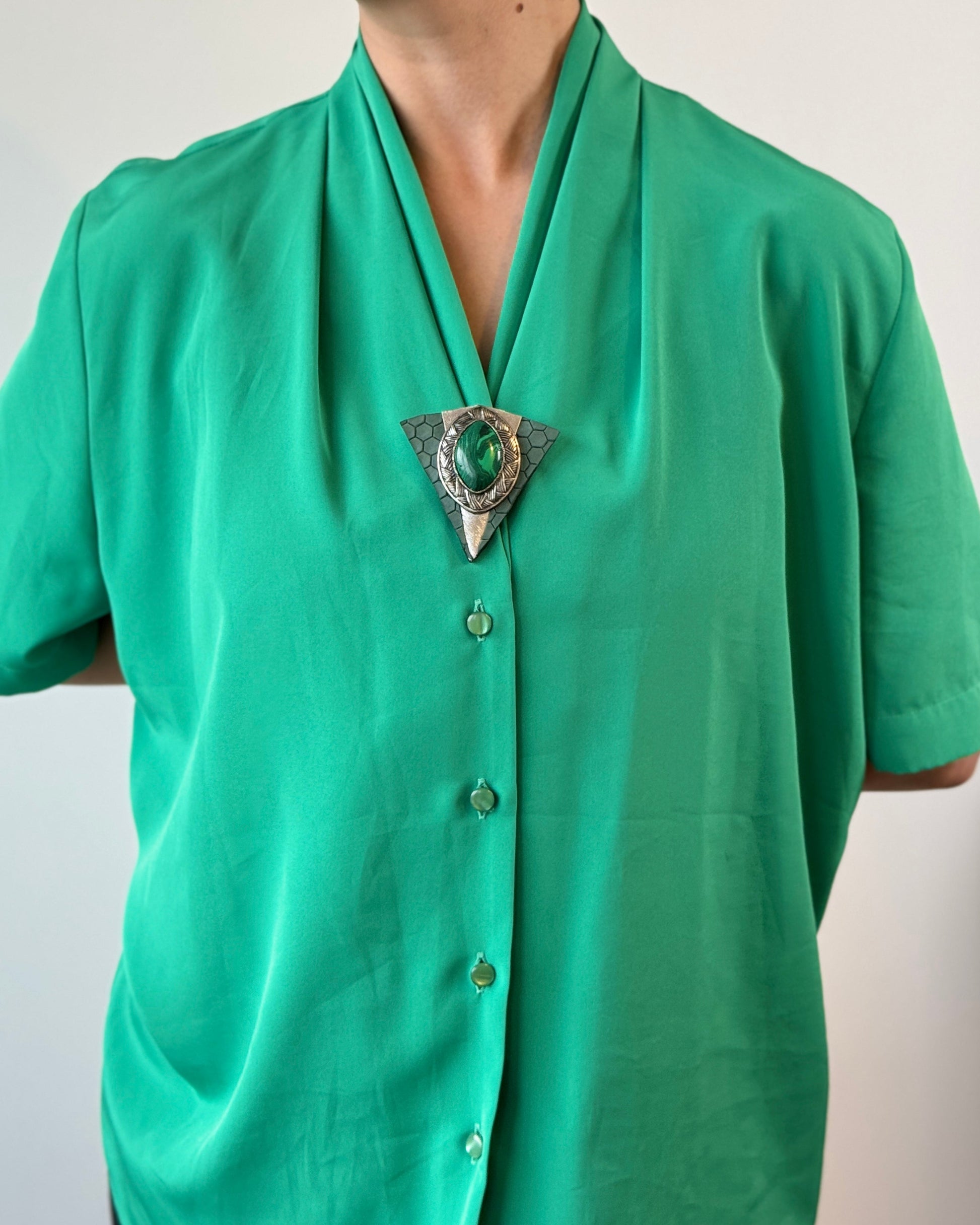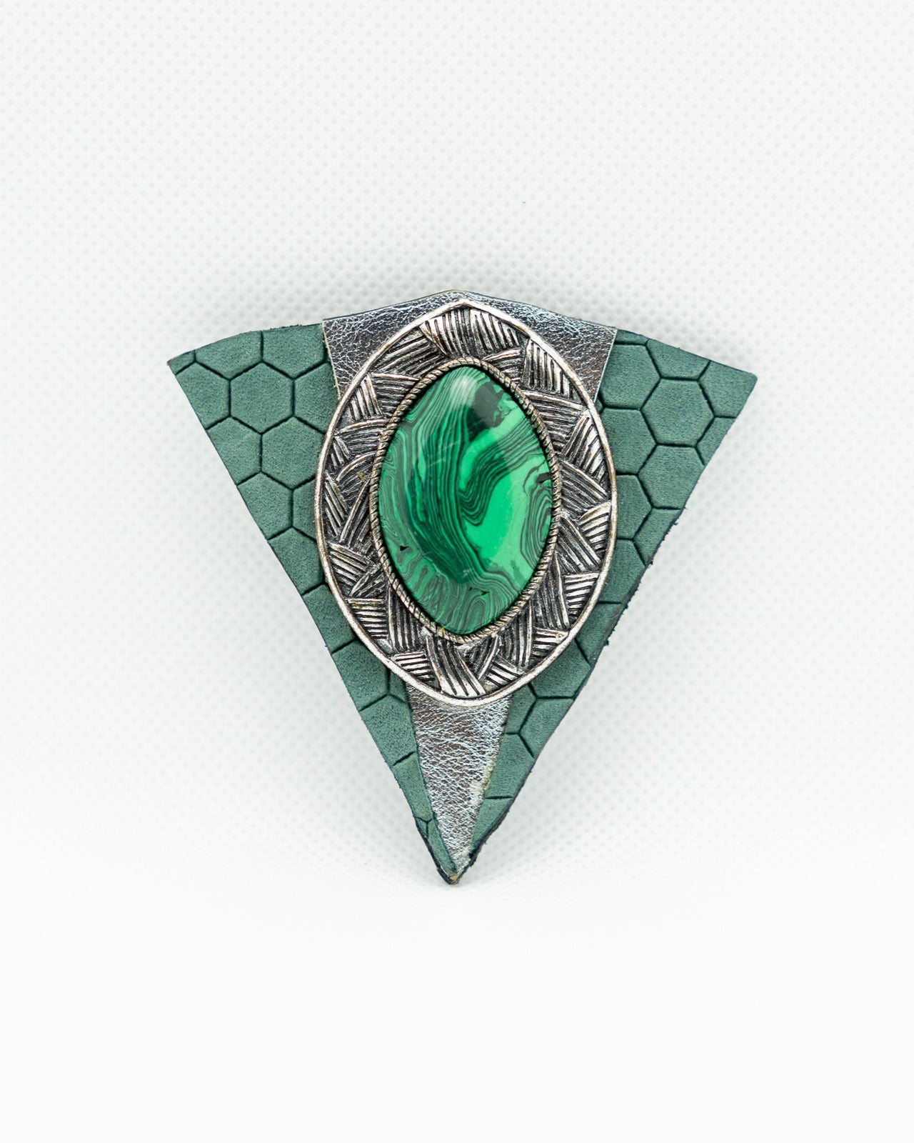 NOEDI - a triangular brooch with a geometric honeycomb-textured green leather base, accented by metallic silver details that form a central frame. The focal point is an oval green malachite-style stone with natural swirling patterns, giving the piece a refined and earthy elegance.