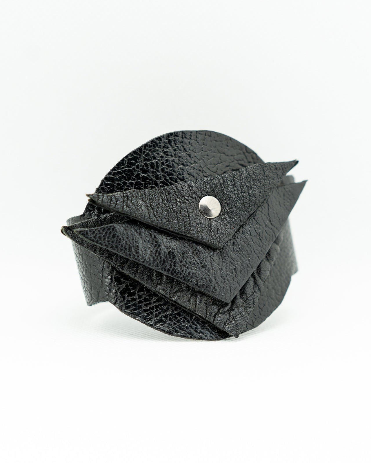 NOORE - striking black leather bracelet features a bold geometric design crafted from layered, textured leather pieces secured by a single silver rivet. Its sculptural form adds an edgy, artistic touch to any outfit. Perfect for those who appreciate modern, statement-making accessories with a handcrafted feel.