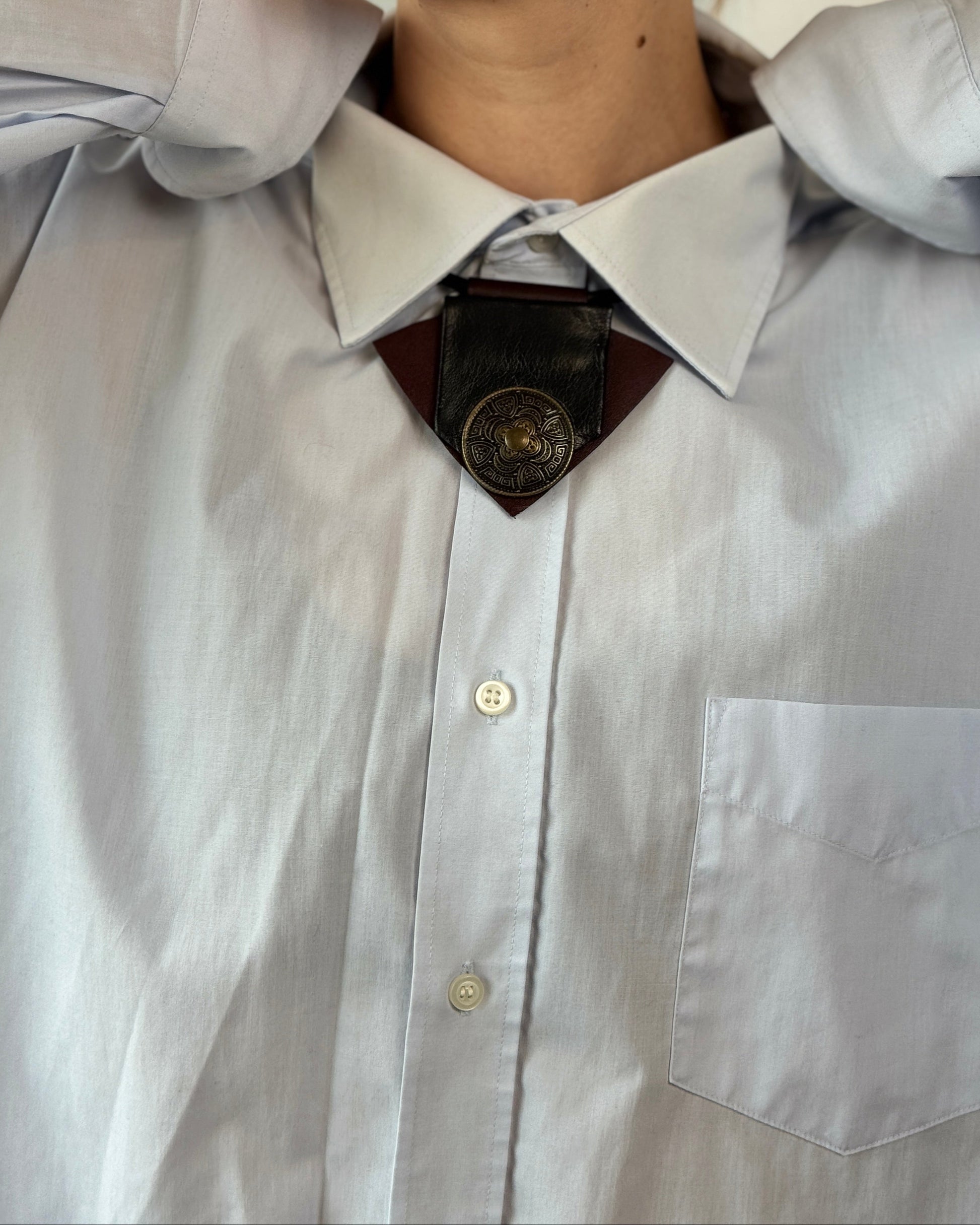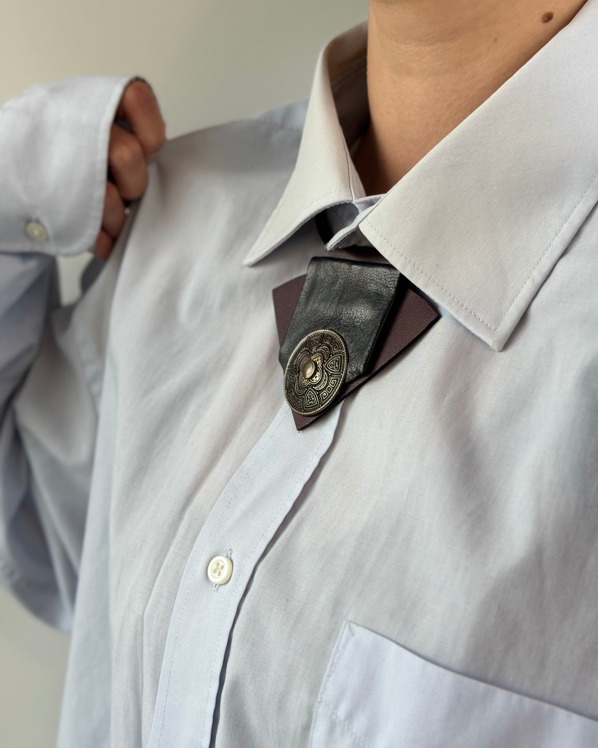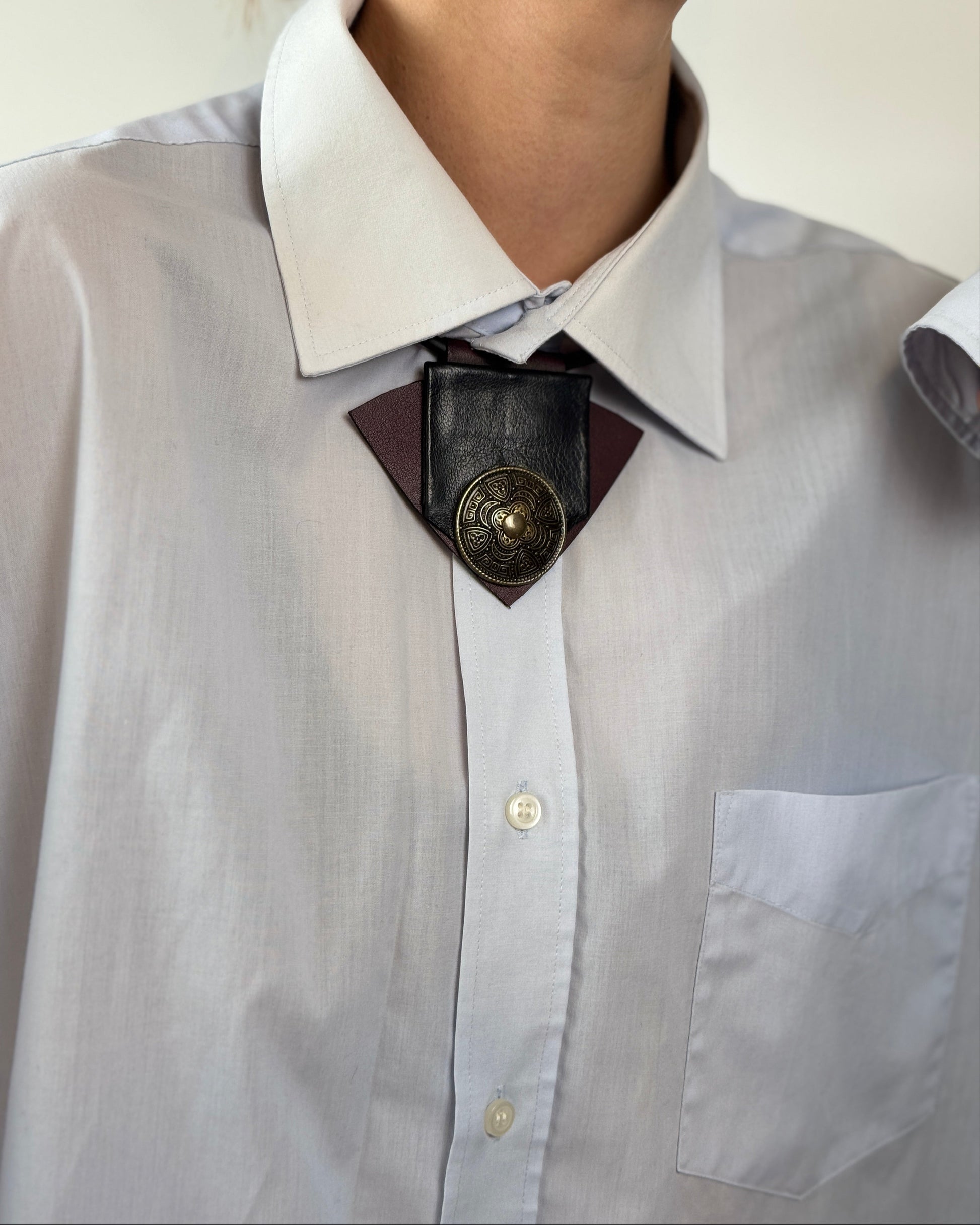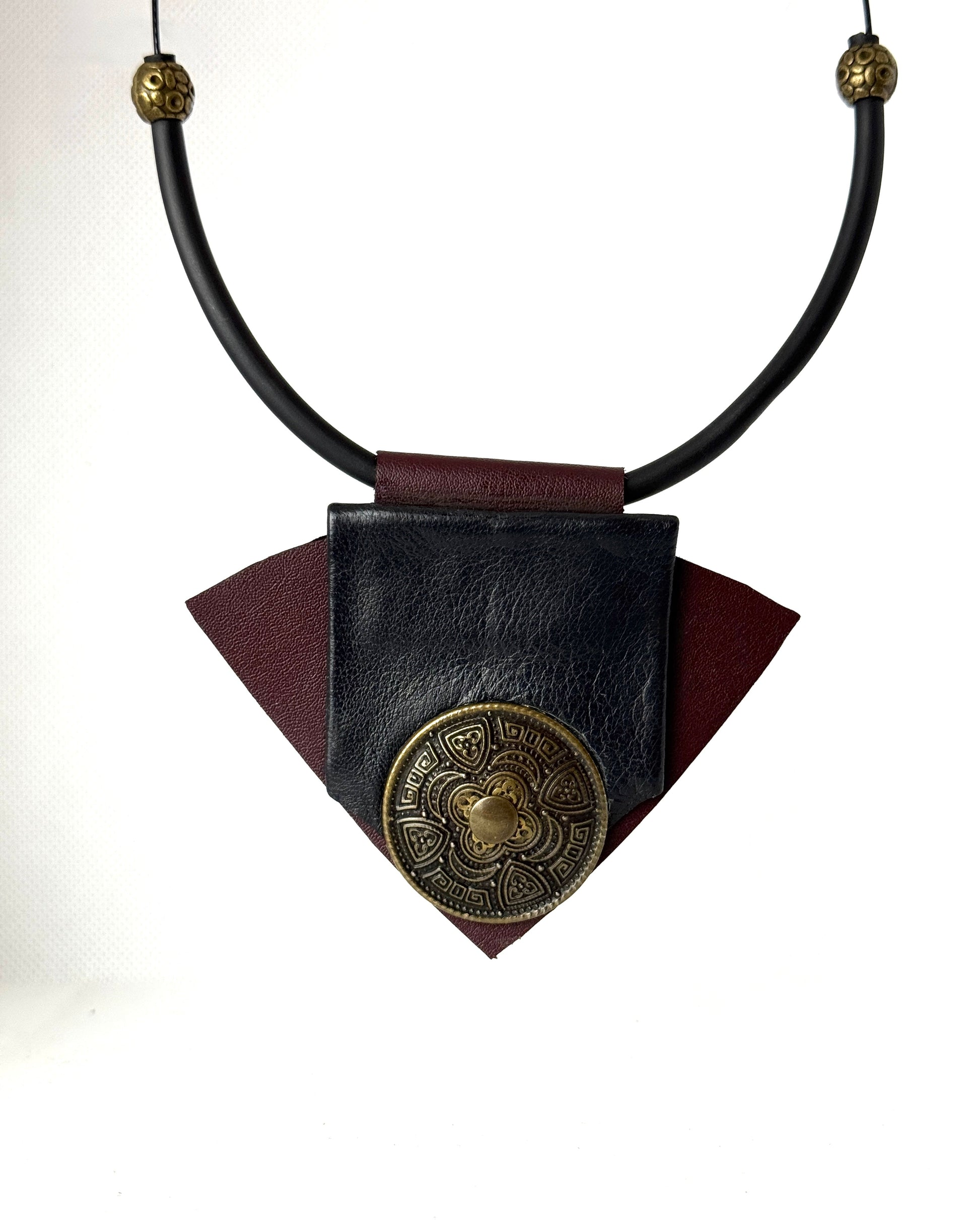 NOTRO - bold and architectural, this pendant pairs black and burgundy leather with a detailed antique brass medallion. The structured design and geometric shape create a strong, modern silhouette. Finished with brass bead accents, it’s a powerful statement piece.