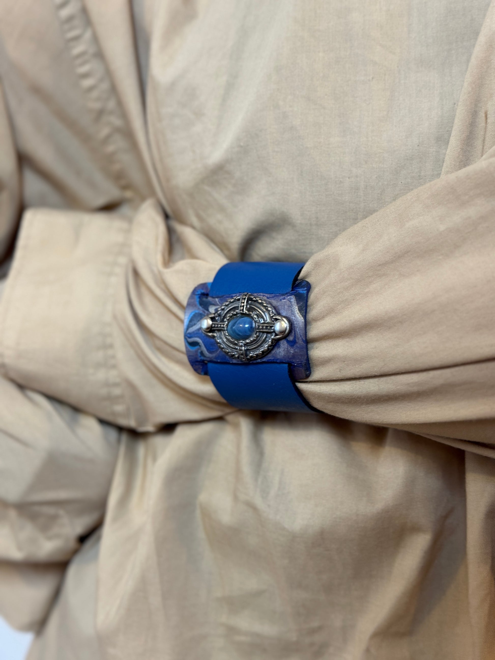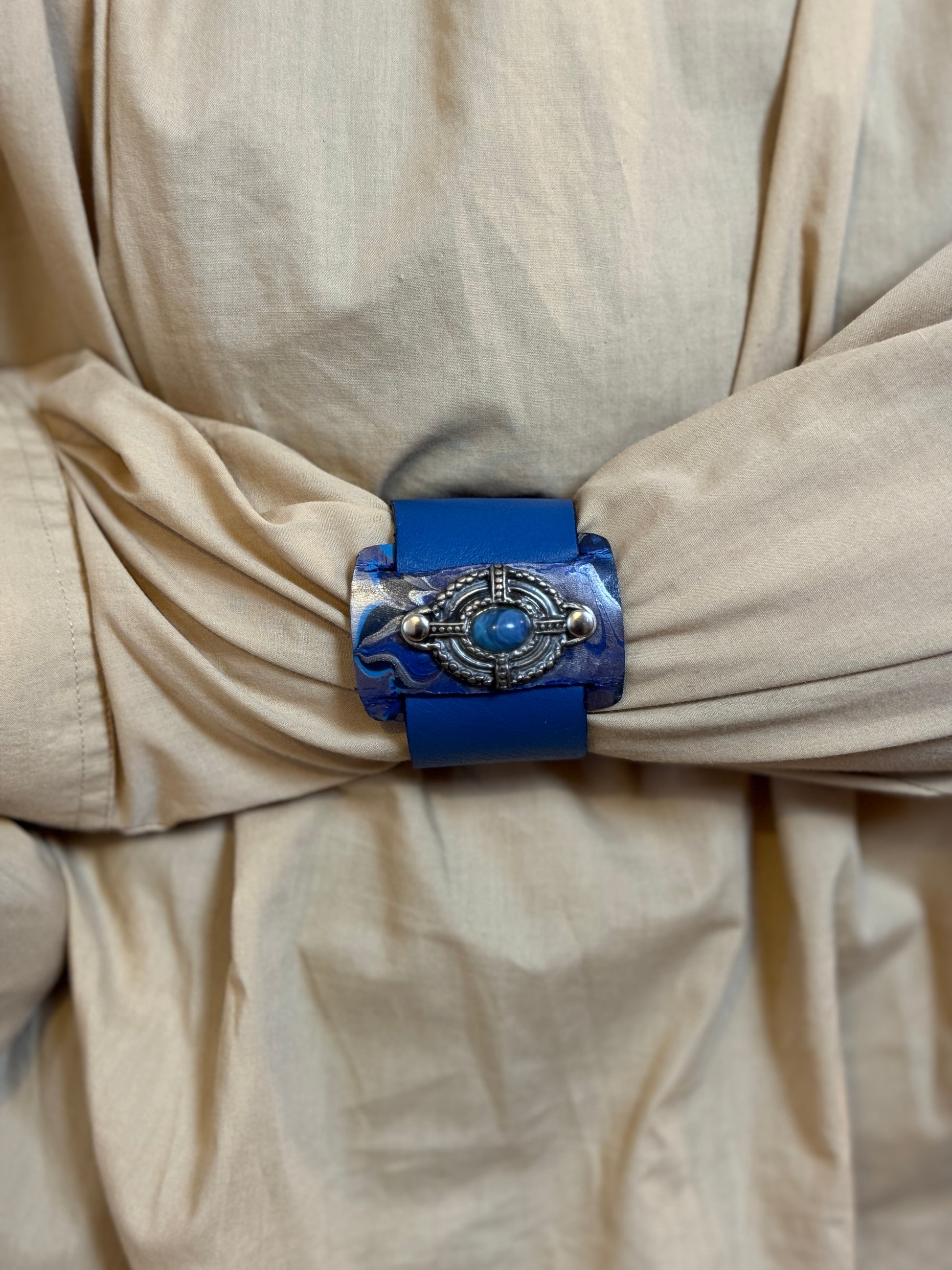 NOVOE features stunning abstract glass painting elements in rich blue shades, creating a unique and stylish accessory. Effortlessly elevate any outfit with this handcrafted piece, showcasing your love for art and fashion. A perfect blend of quality and artistry.