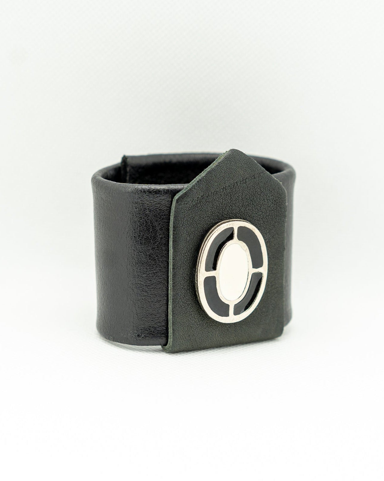 NUTRE features a wide black leather band with a smooth finish, offering a bold yet minimalist aesthetic. At the center, a silver and black geometric emblem adds a modern, futuristic accent. Its clean lines and structured design make it a perfect accessory for contemporary, confident style.