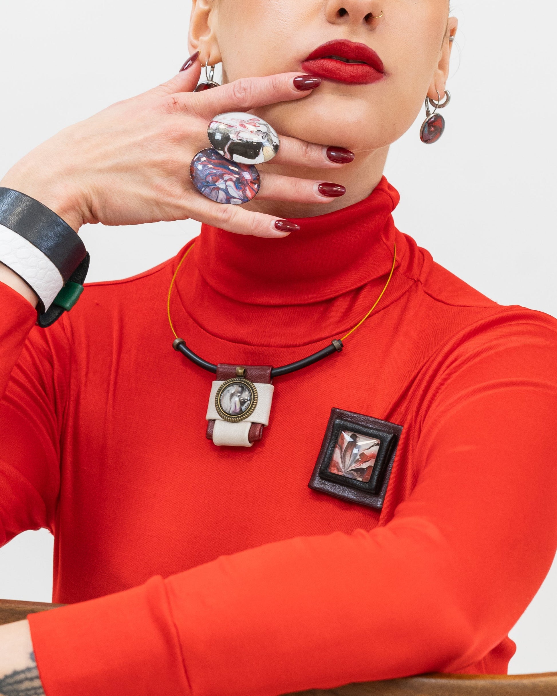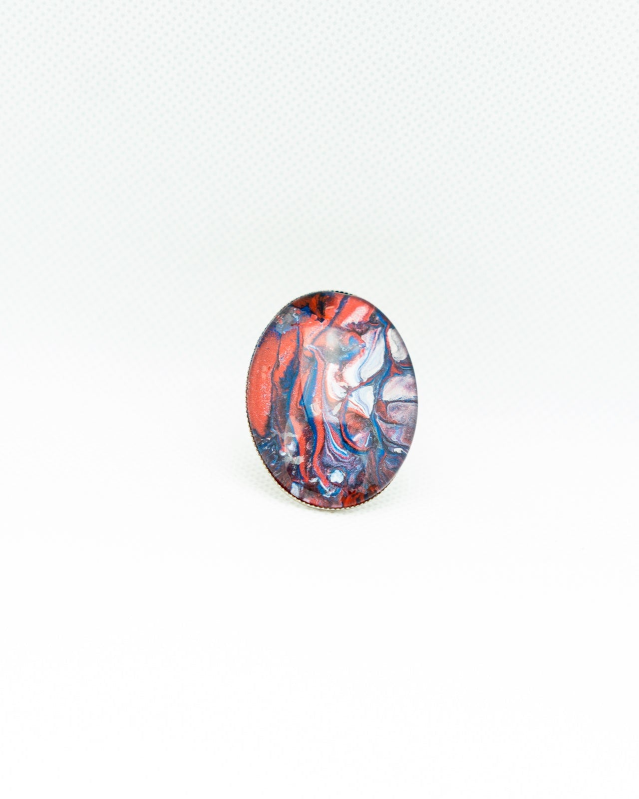 OLUGU - vibrant oval ring bursts with swirling shades of red, blue, white, and hints of metallic shimmer. Its glossy, marbled finish gives each piece a unique, artistic character. A bold accessory perfect for those who love statement-making style with creative flair.