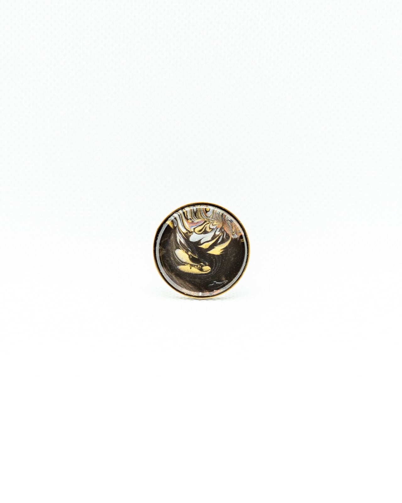 OSUTU - elegant round ring features a swirling pattern of gold, black, and soft pink tones, reminiscent of molten metal in motion. The glossy finish enhances its depth and shimmer. A sophisticated piece that adds a touch of artistic luxury to any look.