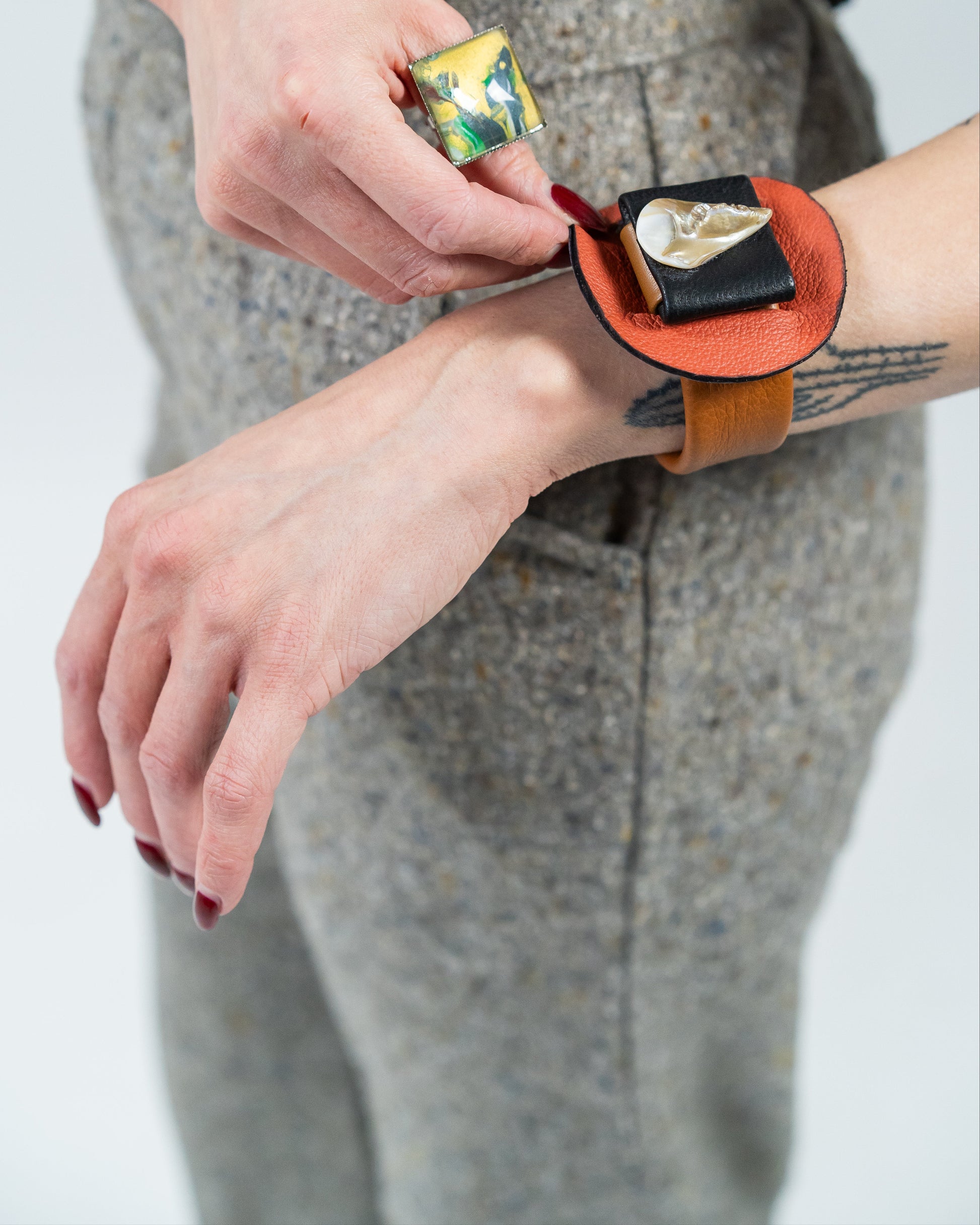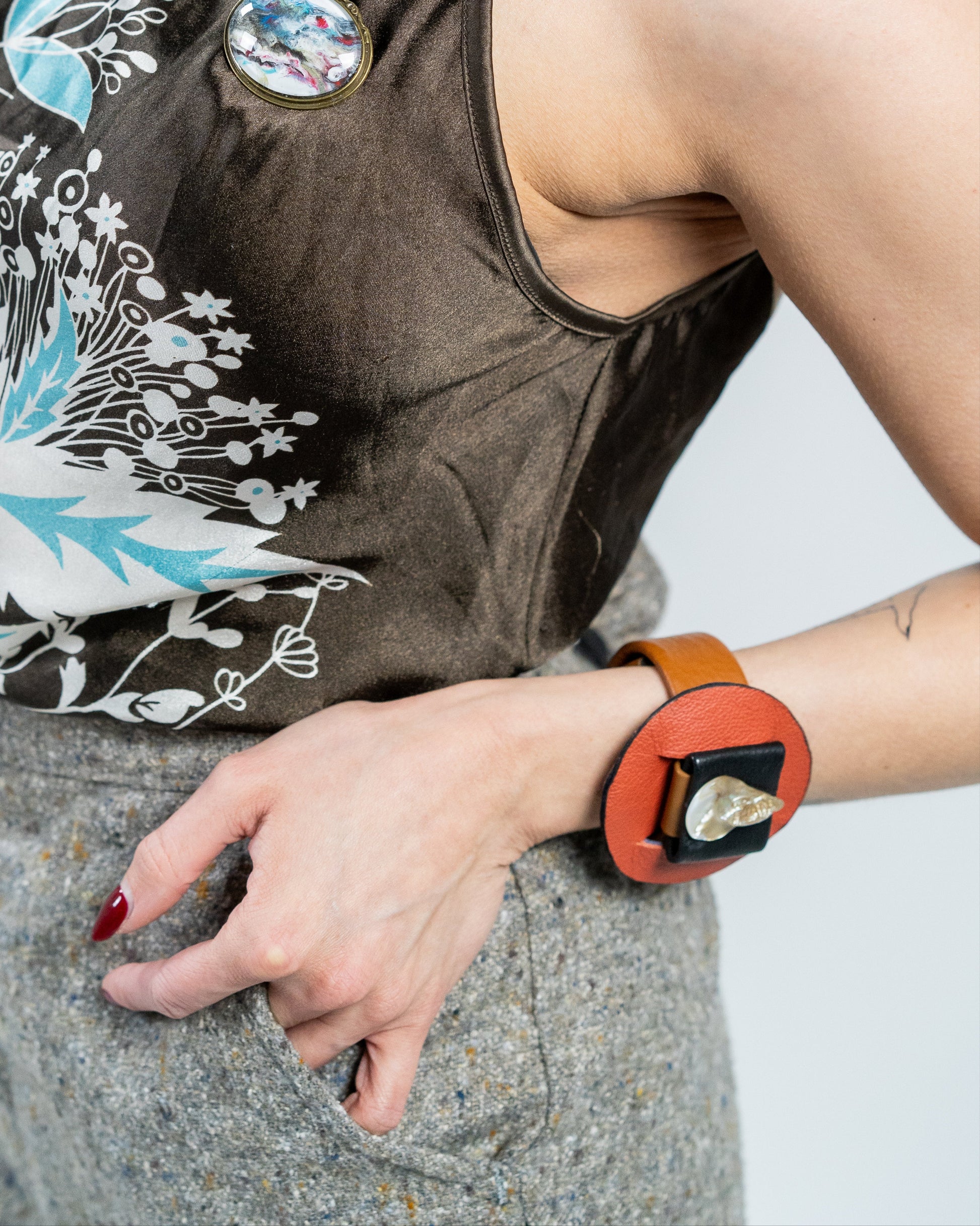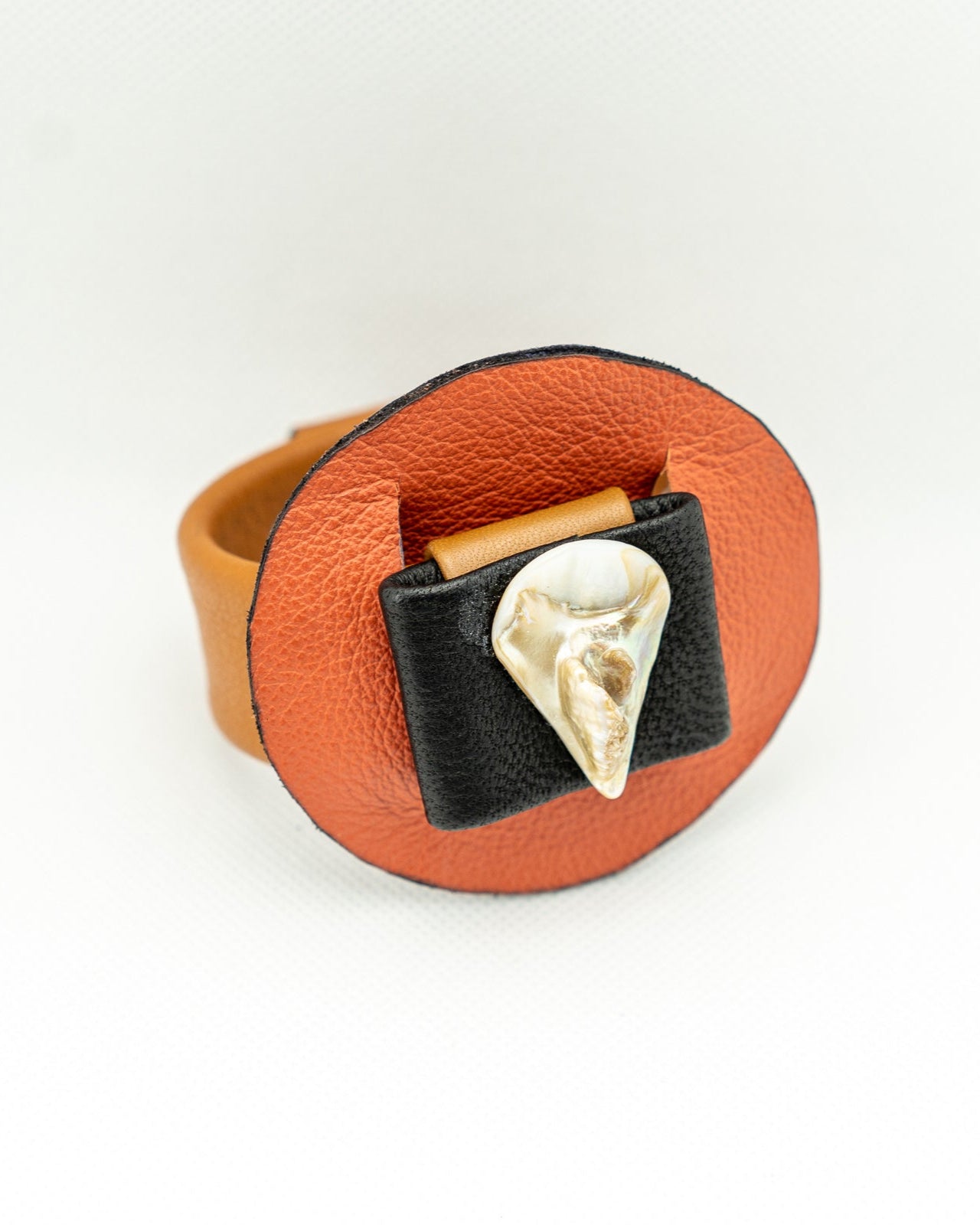 OTORE - vibrant orange bracelet stands out with its bold color and a natural shell centerpiece. The shell shimmers with soft, iridescent tones, adding a touch of elegance and uniqueness. It's a striking accessory that complements both everyday outfits and special occasions.