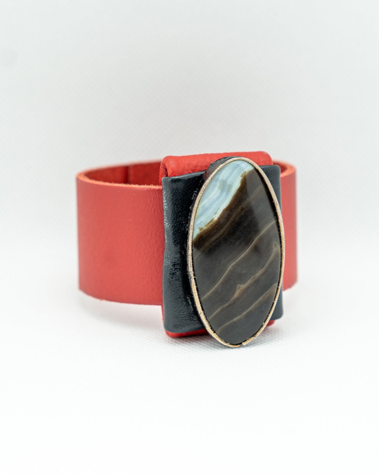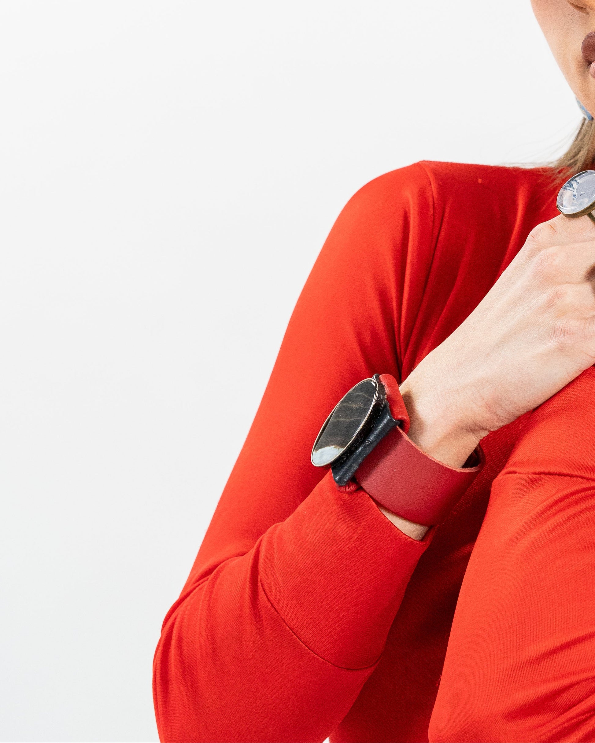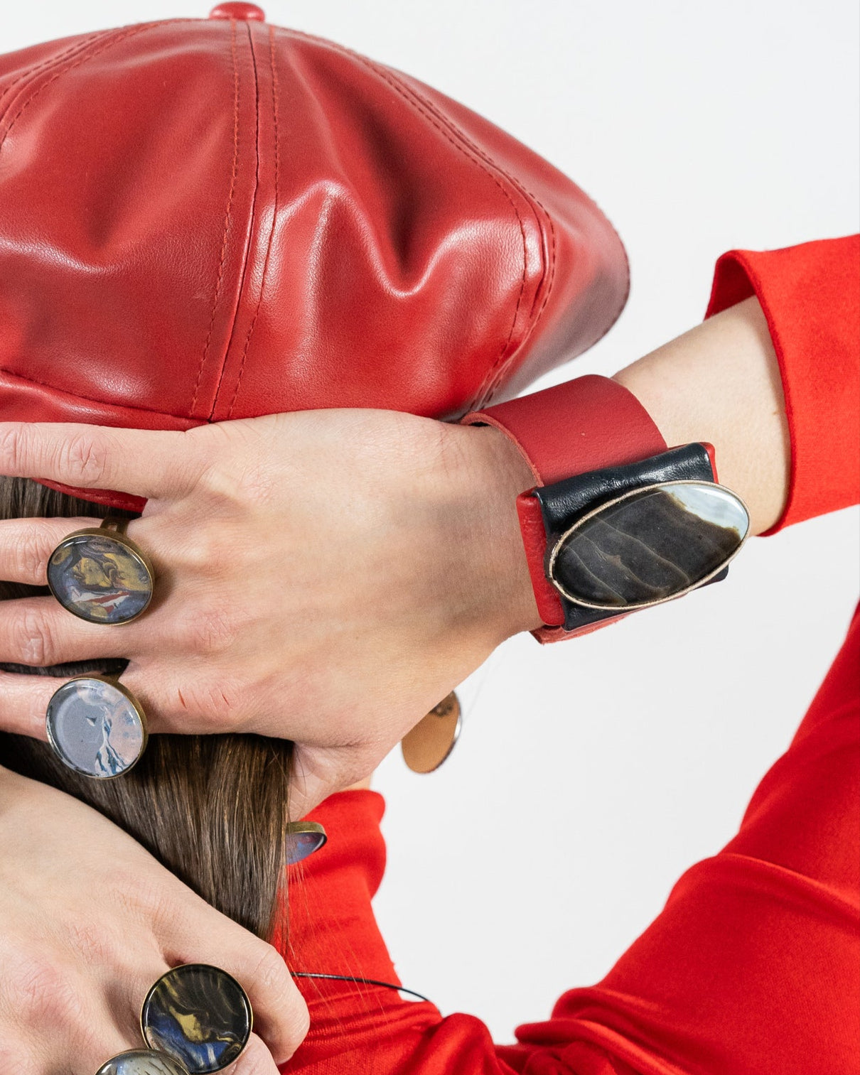 PORTE features an abstract glass paint oval in bold black tone, set against a black leather band. Add a unique touch to your accessory collection with this eye-catching and stylish bracelet. The perfect statement piece for any outfit.