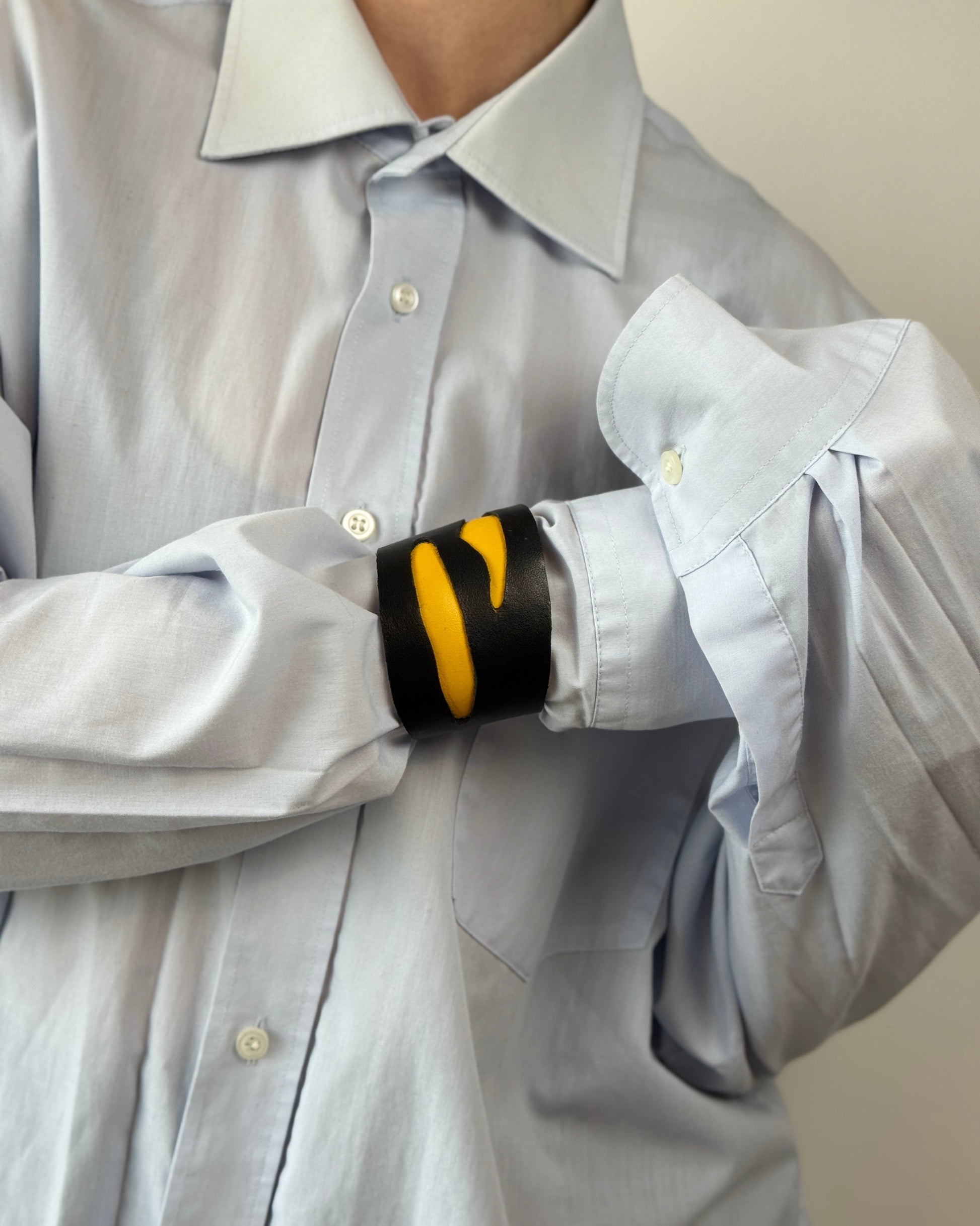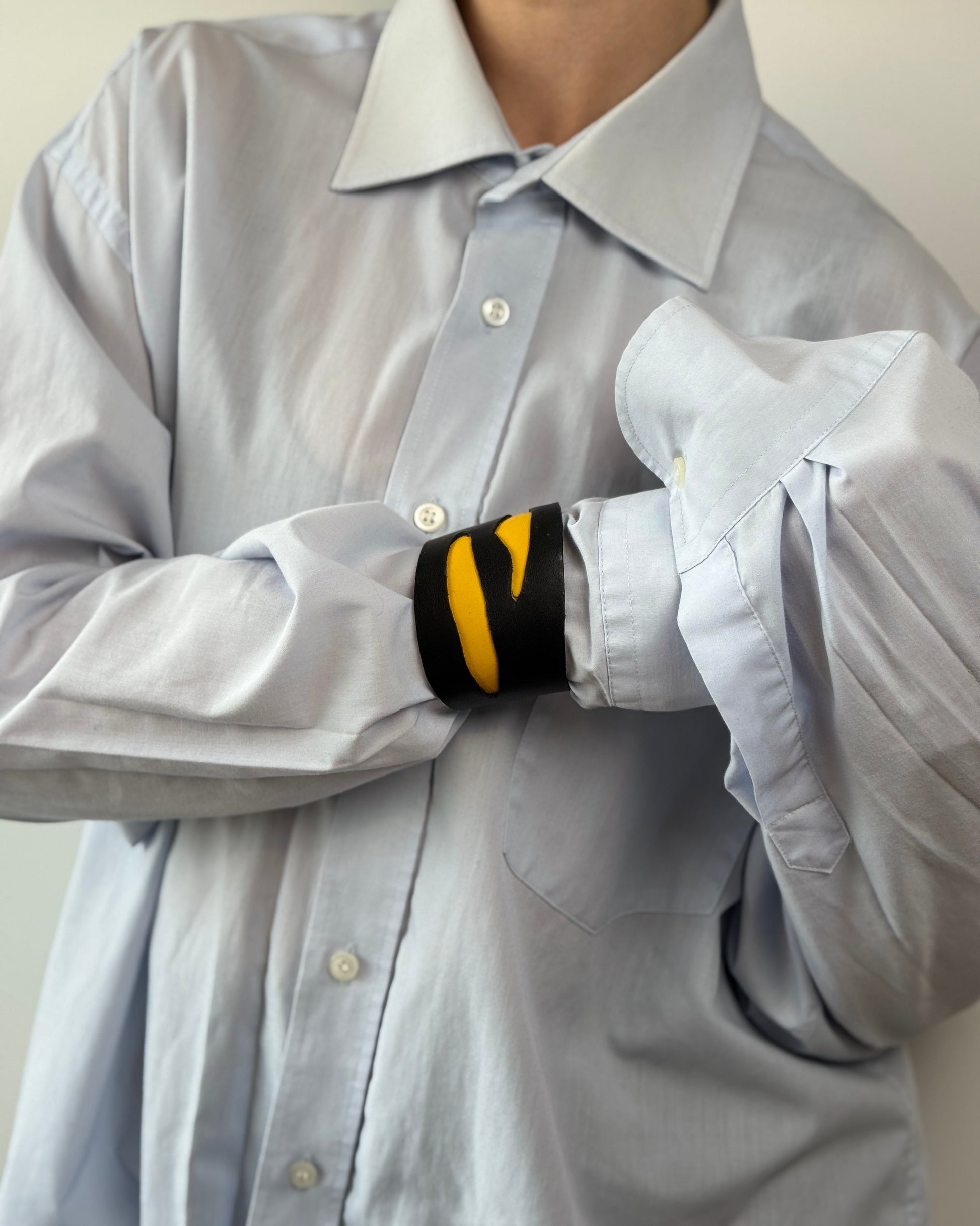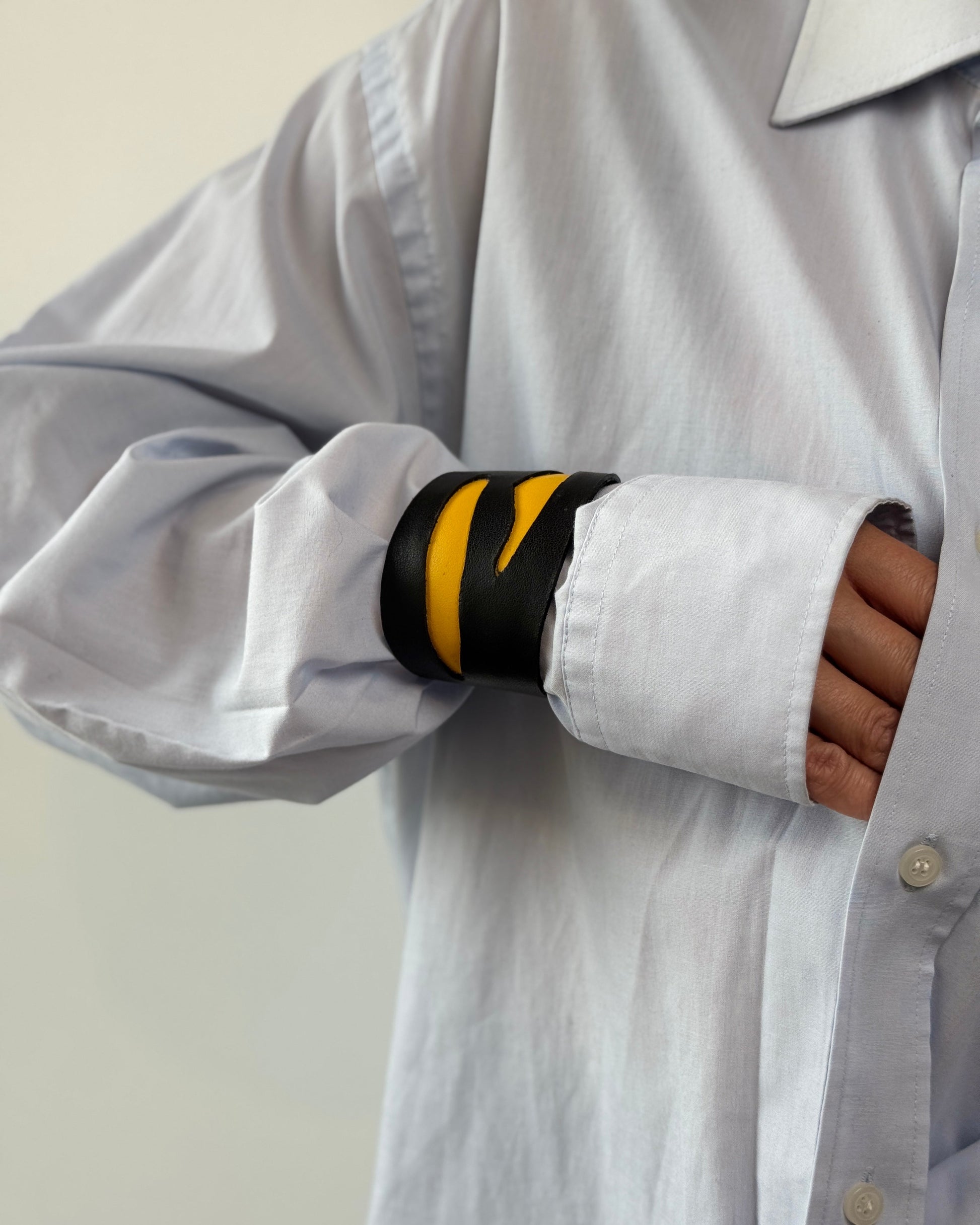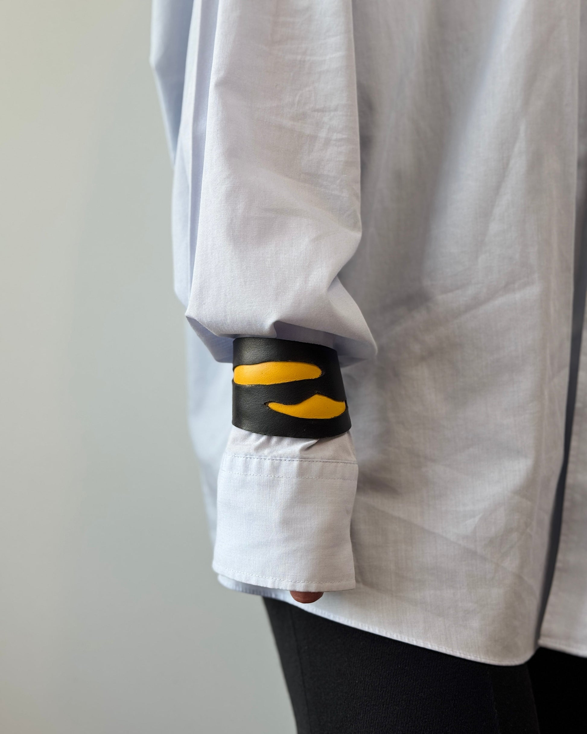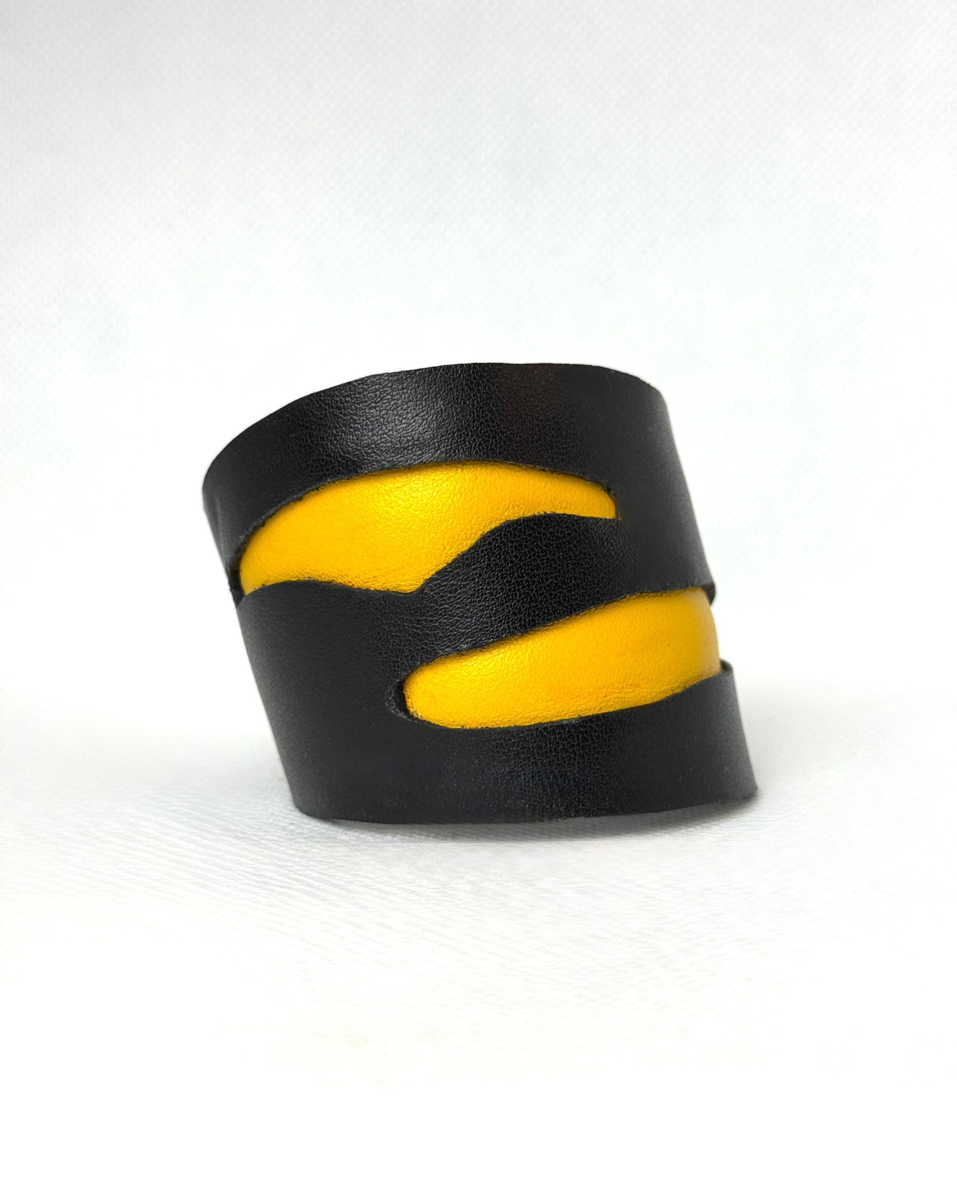 RODNE - striking bracelet showcases a dynamic design with bold contrasts. The matte black leather cuff features asymmetrical, wave-like cutouts revealing a vivid yellow layer beneath. The slanted form and fluid lines evoke a sense of motion and energy, making it a powerful statement piece for someone with a daring, artistic edge.