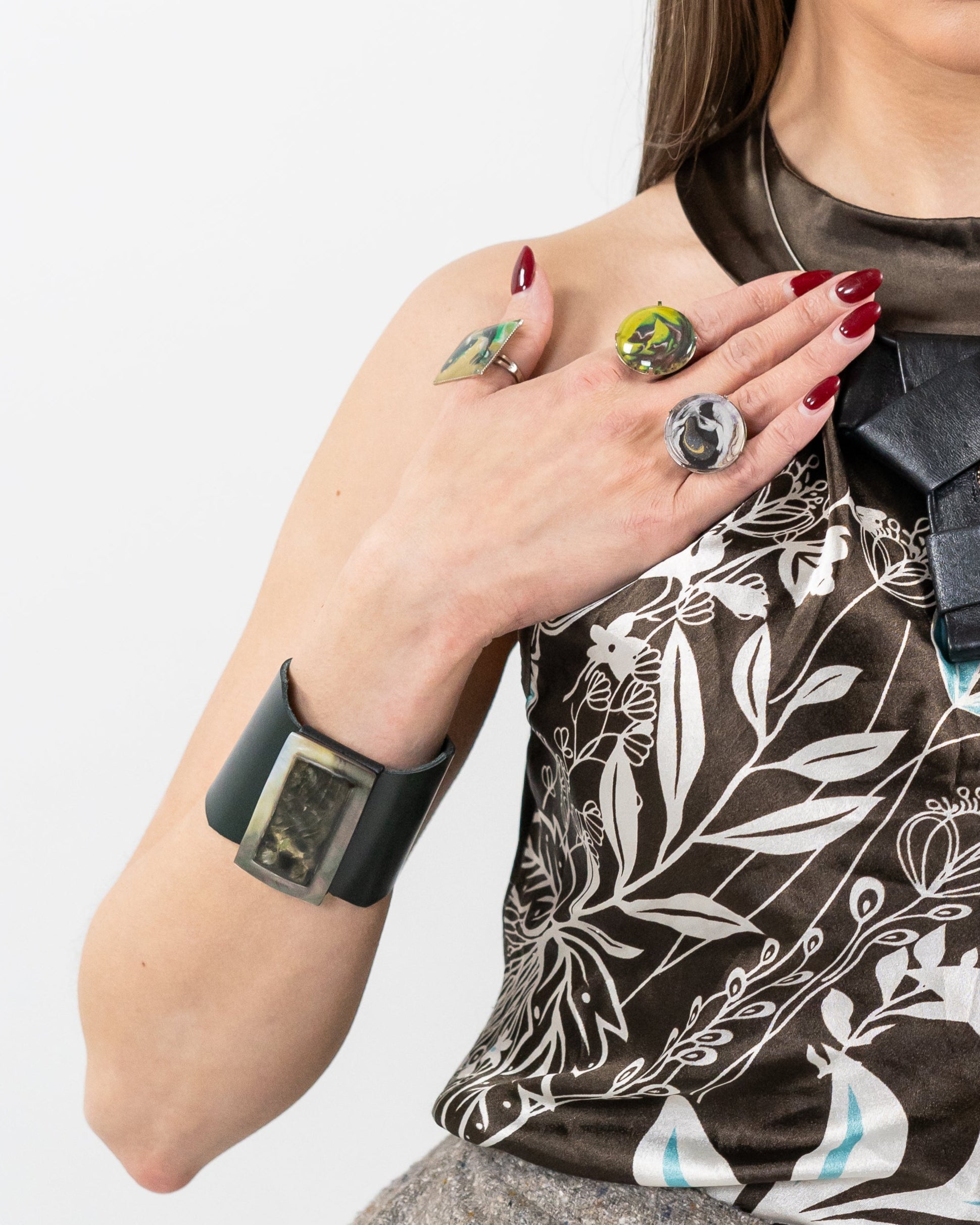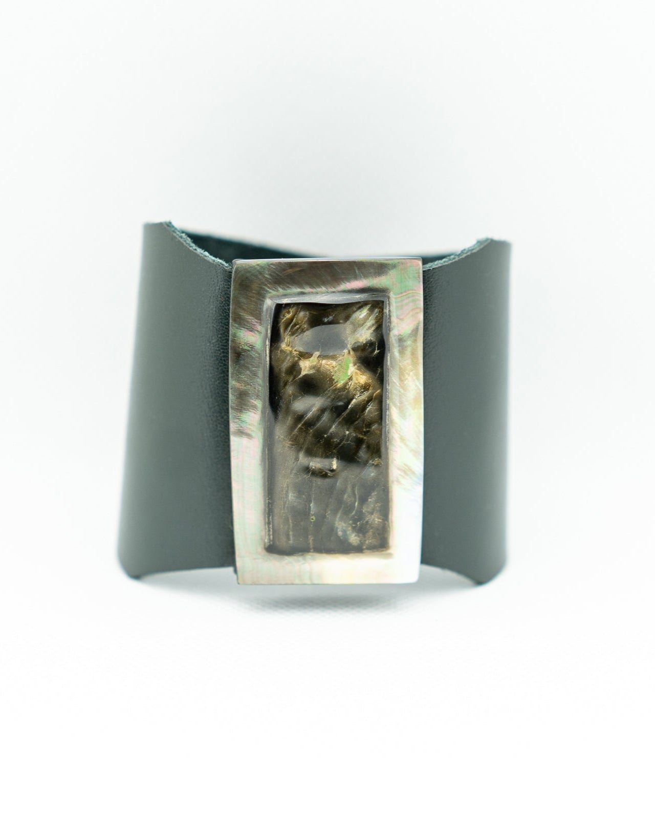 ROSTE showcases a wide black leather band paired with a rectangular metallic centerpiece. The centerpiece features a glossy, dark marbled texture framed in a shimmering silver-toned border. Its modern, minimalist design exudes sophistication with an artistic edge.