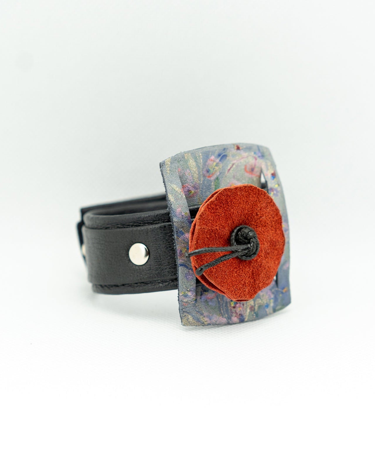 ROTUE features a wide black leather band adorned with a unique, multicolored rectangular centerpiece. A striking burnt-orange suede circle is secured with a black cord, adding bold texture and contrast. Finished with silver rivets, this piece blends rustic charm with artistic flair.
