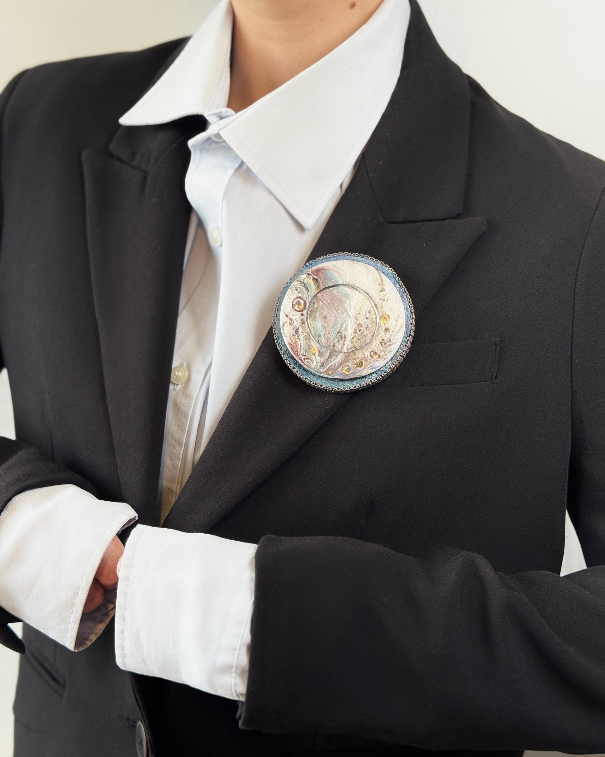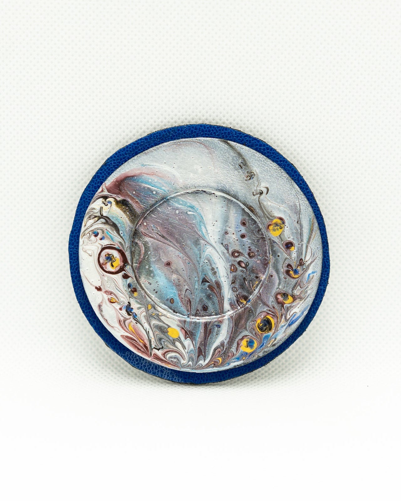 This vibrant round SHYDI brooch features a fluid, marbled design in swirling hues of silver, plum, and blue, accented with playful yellow drops. Framed in a bold cobalt blue edge, it brings a modern, artistic twist to any ensemble. A striking accessory for lovers of abstract expression.