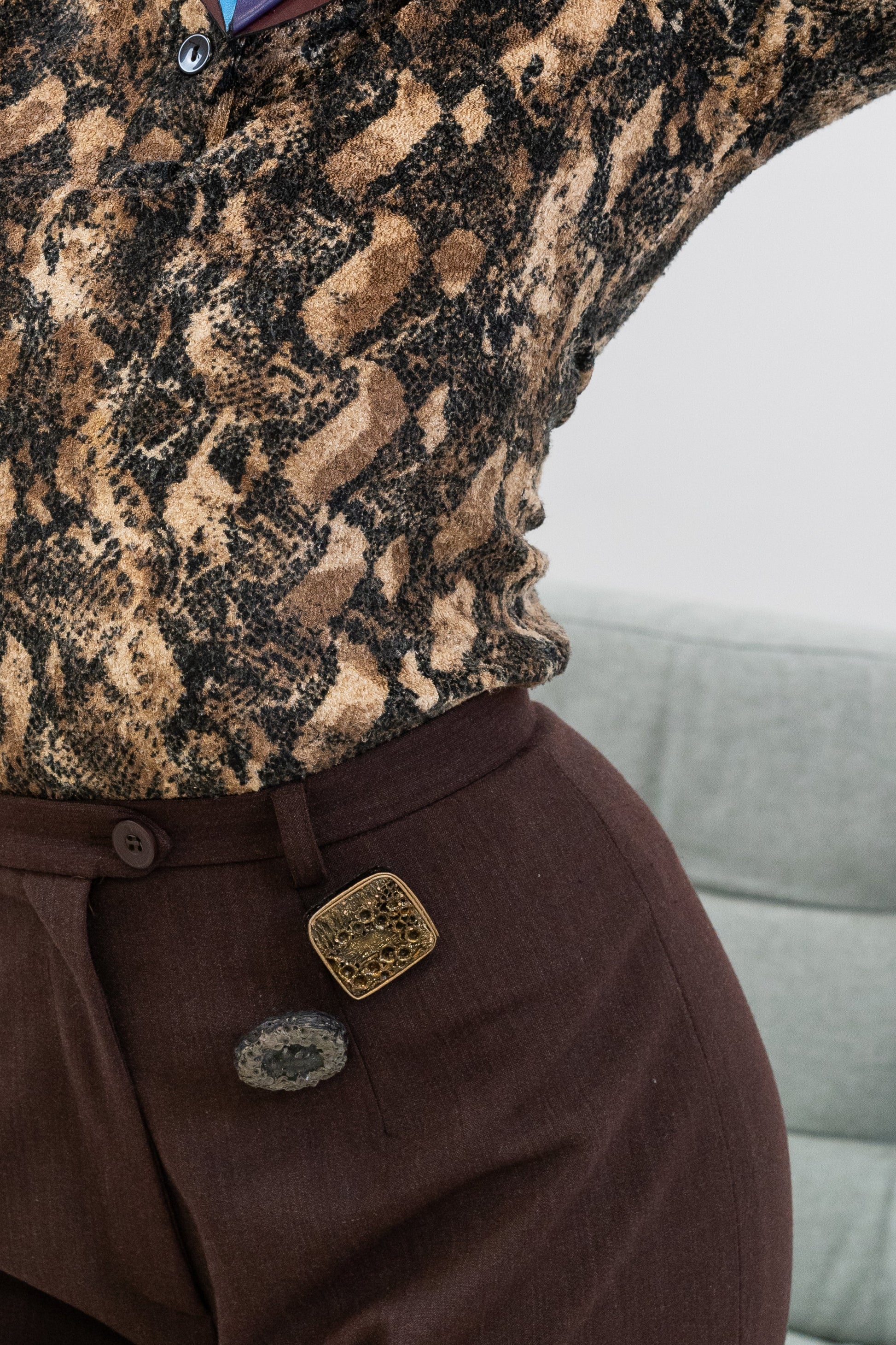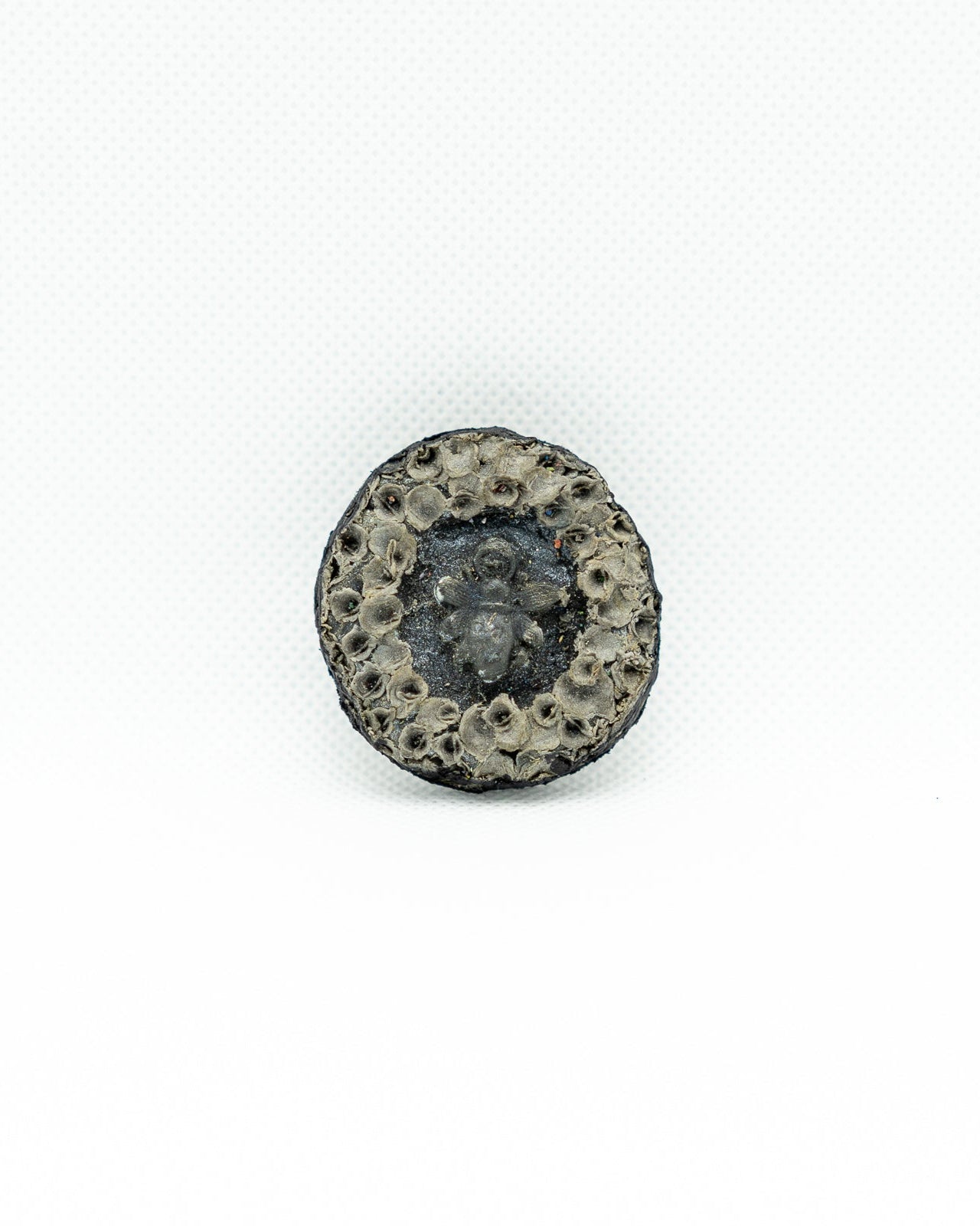 STONI features a bold circular design crafted from natural textures and dark, earthy tones. Made with upcycled materials, its rugged, organic look gives off a raw, sculptural vibe. A distinctive accessory that blends nature-inspired aesthetics with sustainable design.