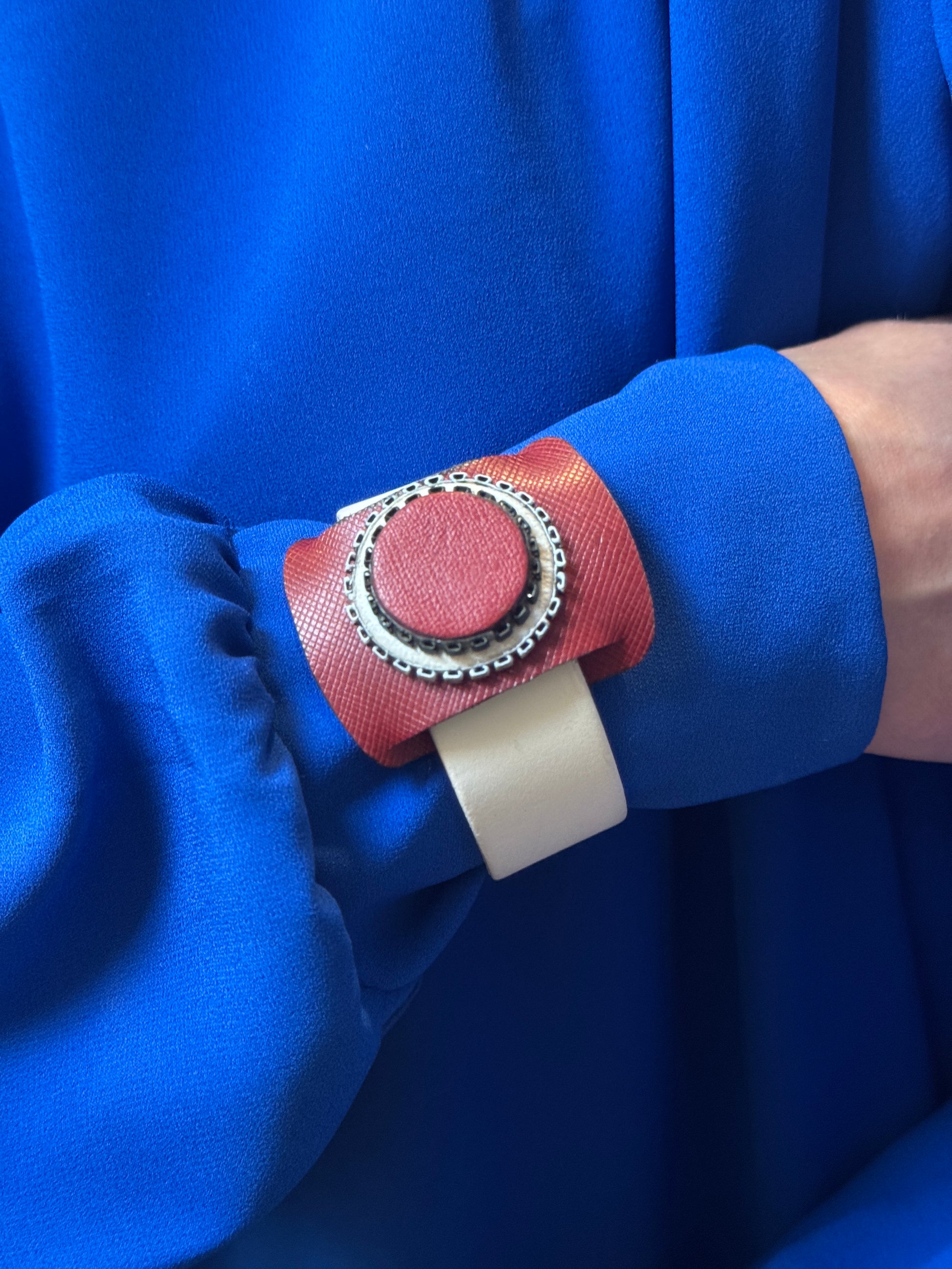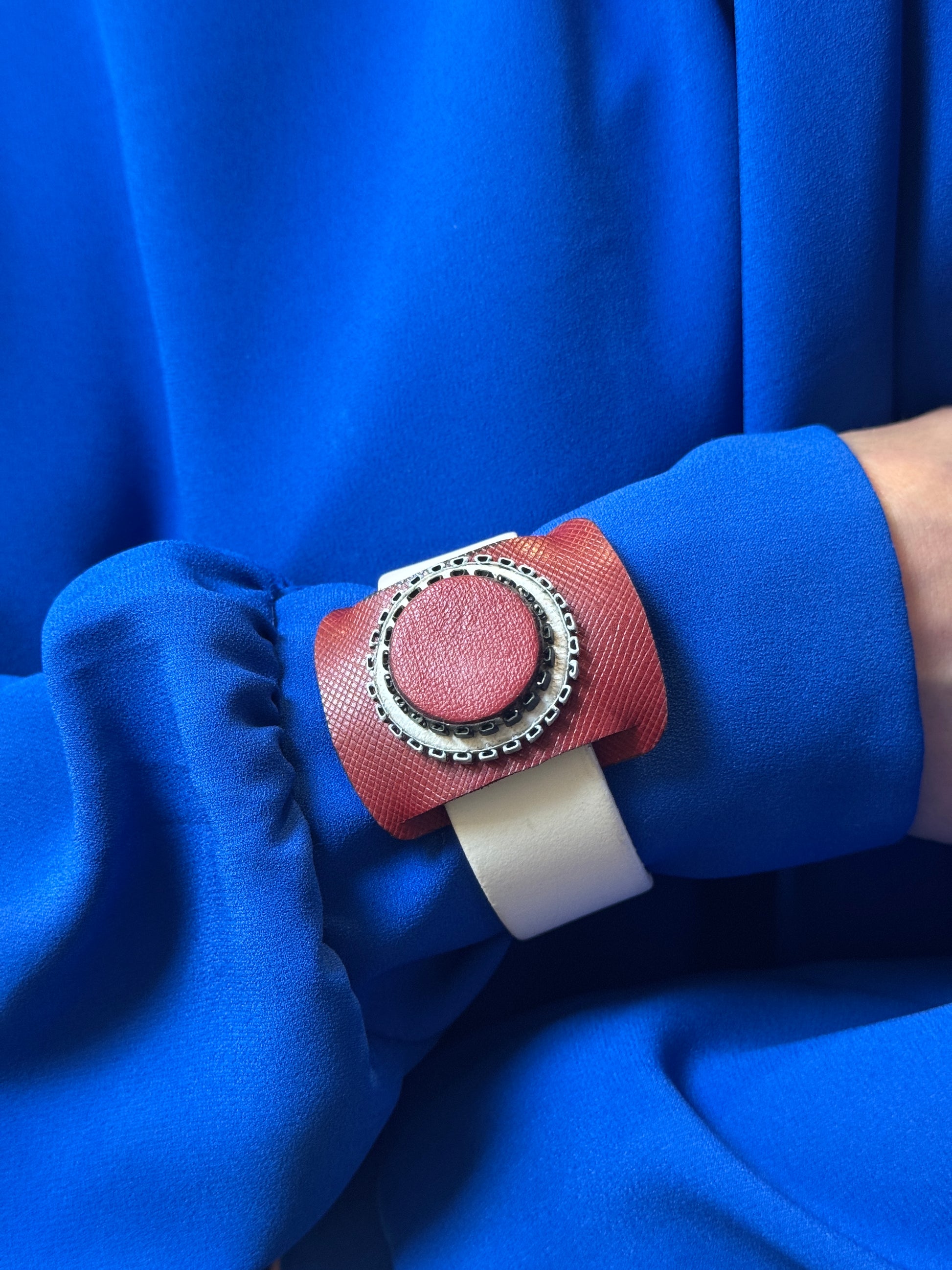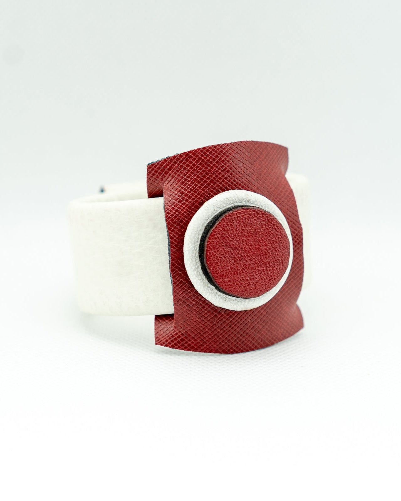 STULE features bold look a in white and bright tones, accented with vibrant red tones. Made with high-quality leather, it adds a touch of elegance to any outfit. The perfect accessory for those looking for a unique and sophisticated look.