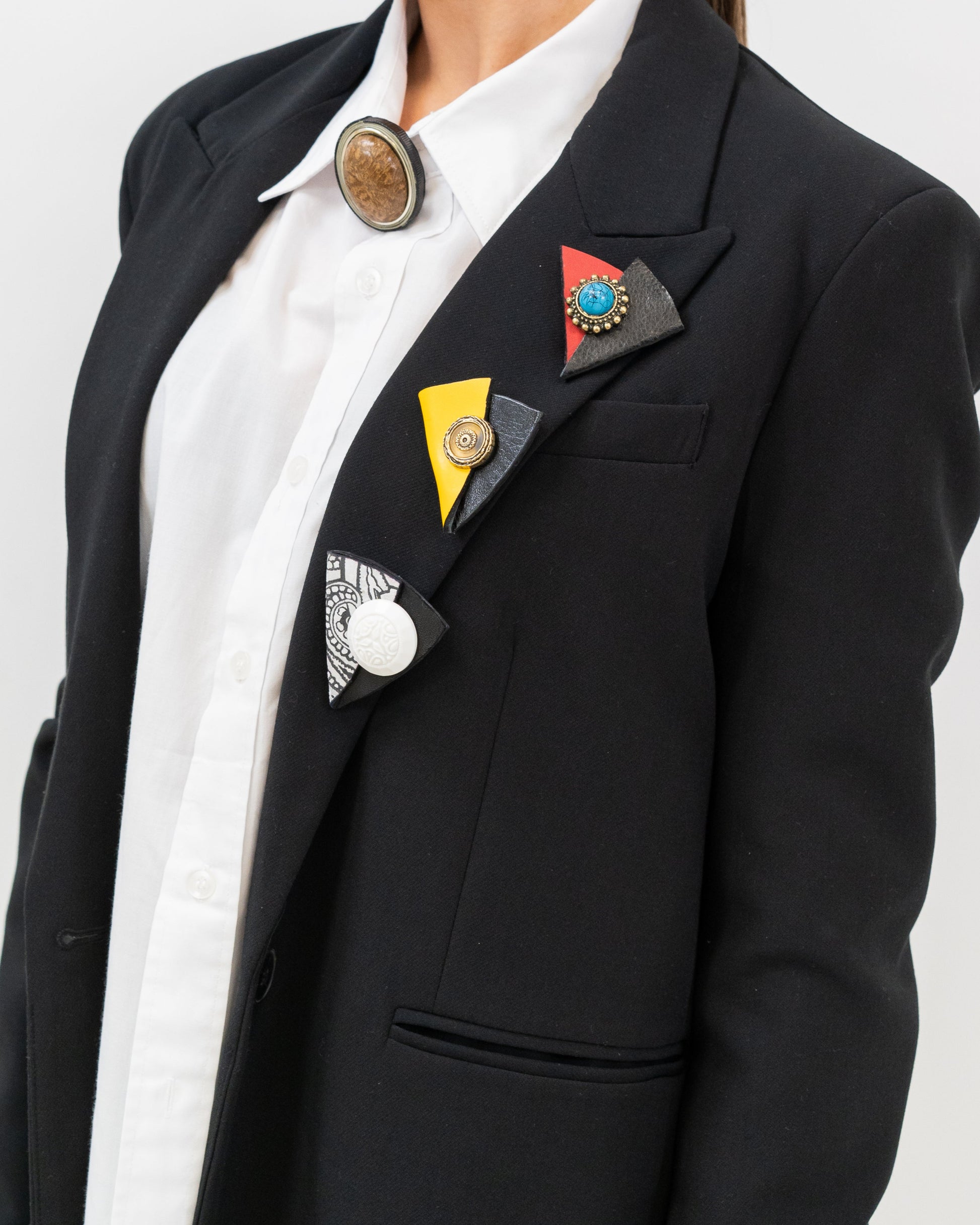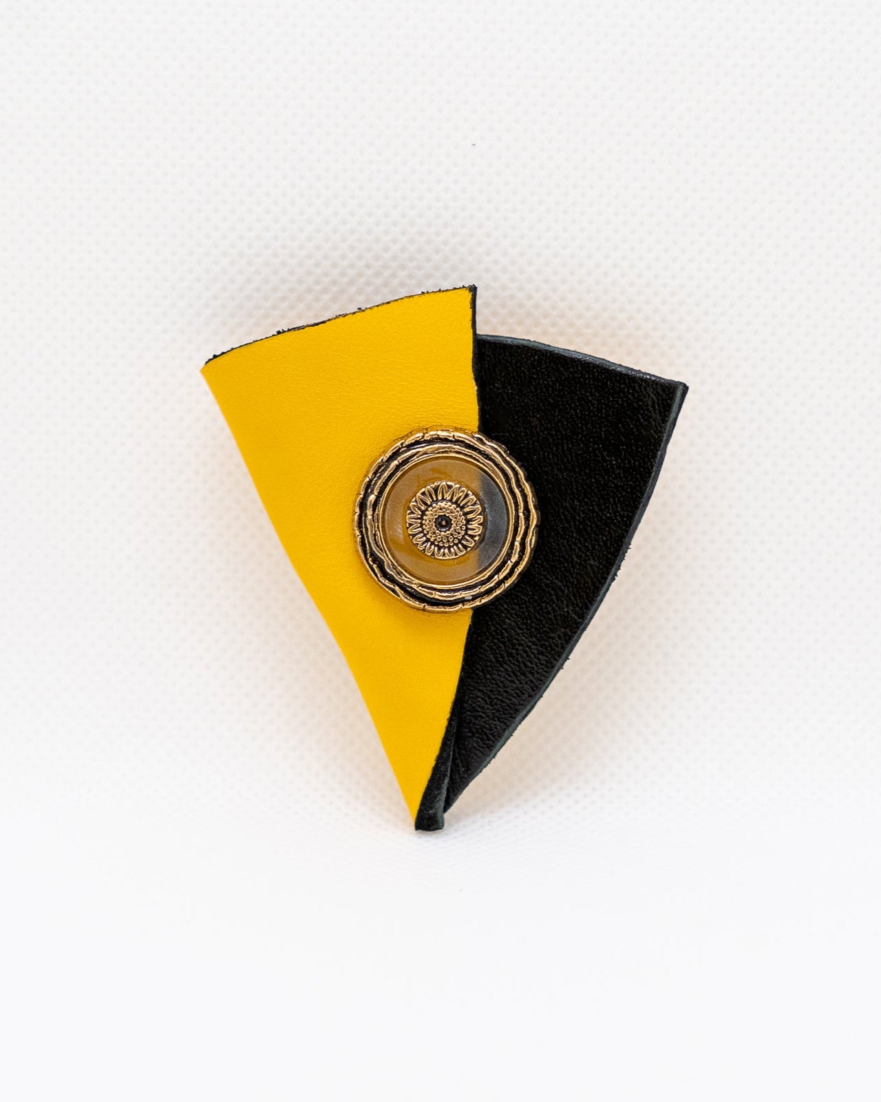 TIKLI - eye-catching brooch features a bold contrast of vibrant yellow and black leather, accented with an ornate golden medallion. Its sleek, angular design brings modern flair to classic elegance. A powerful accessory that adds a touch of sophistication and confidence to any look.