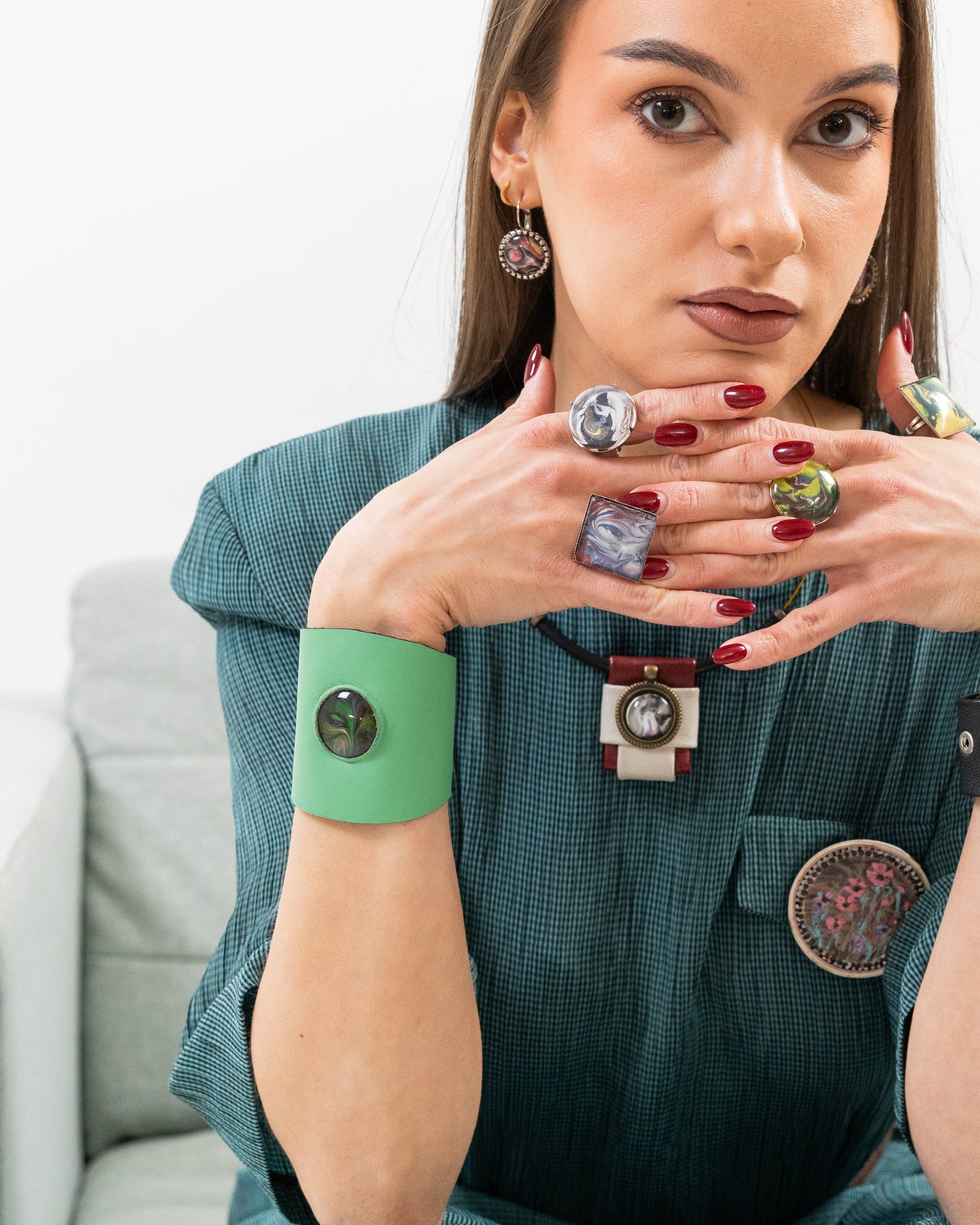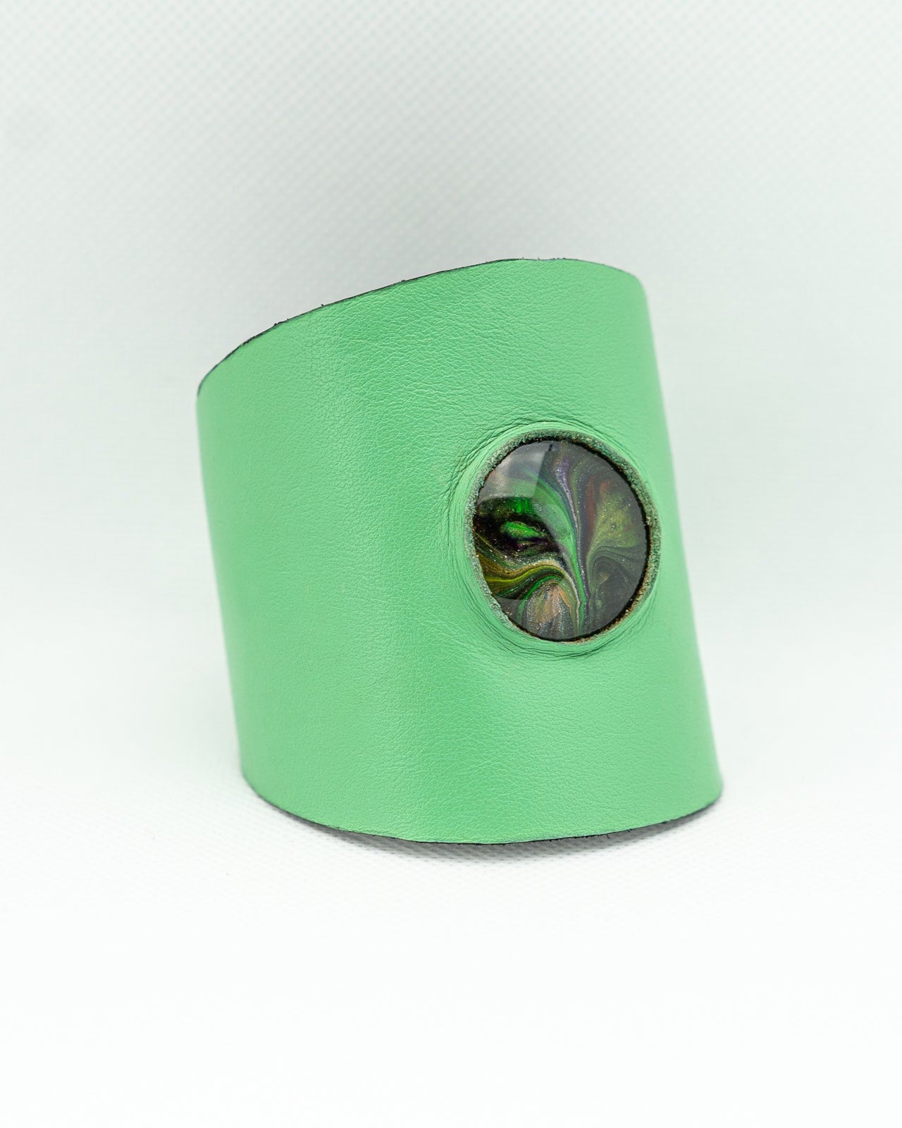 TOELE features a statement bracelet in teal tone, accented with vibrant glass painting. Made with high-quality leather, it adds a touch of elegance to any outfit. The perfect accessory for those looking for a unique and sophisticated look.